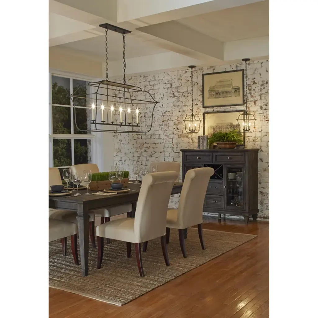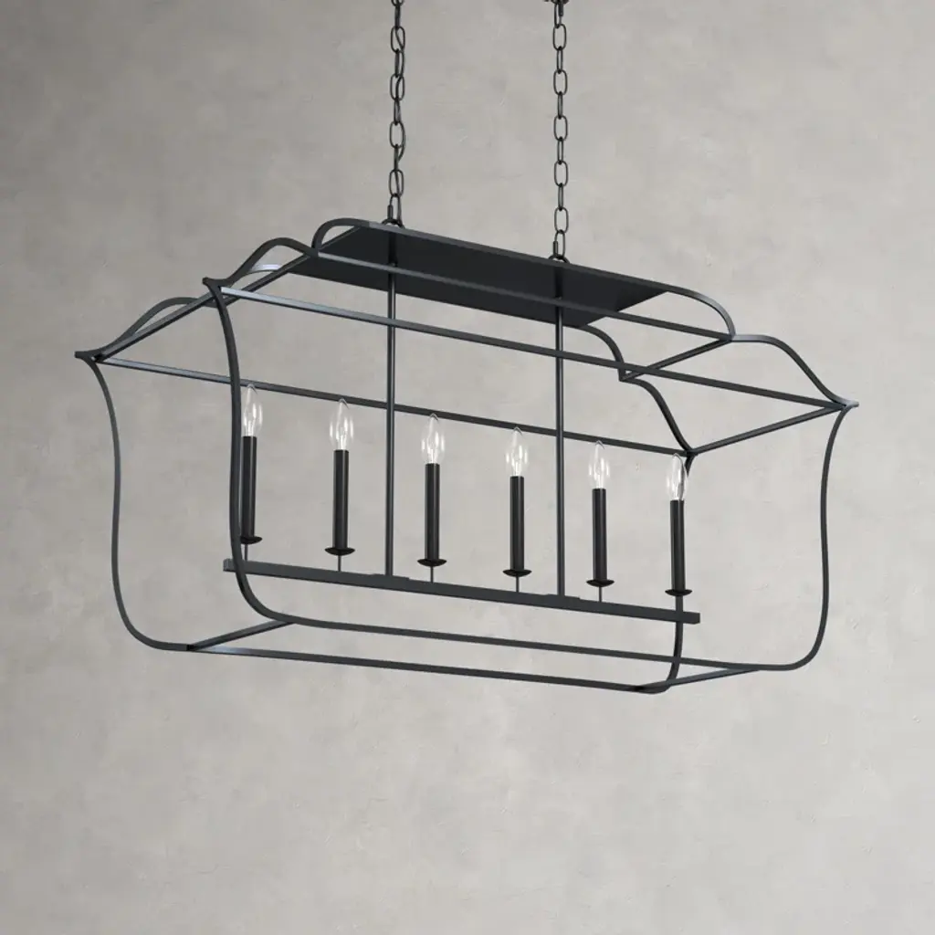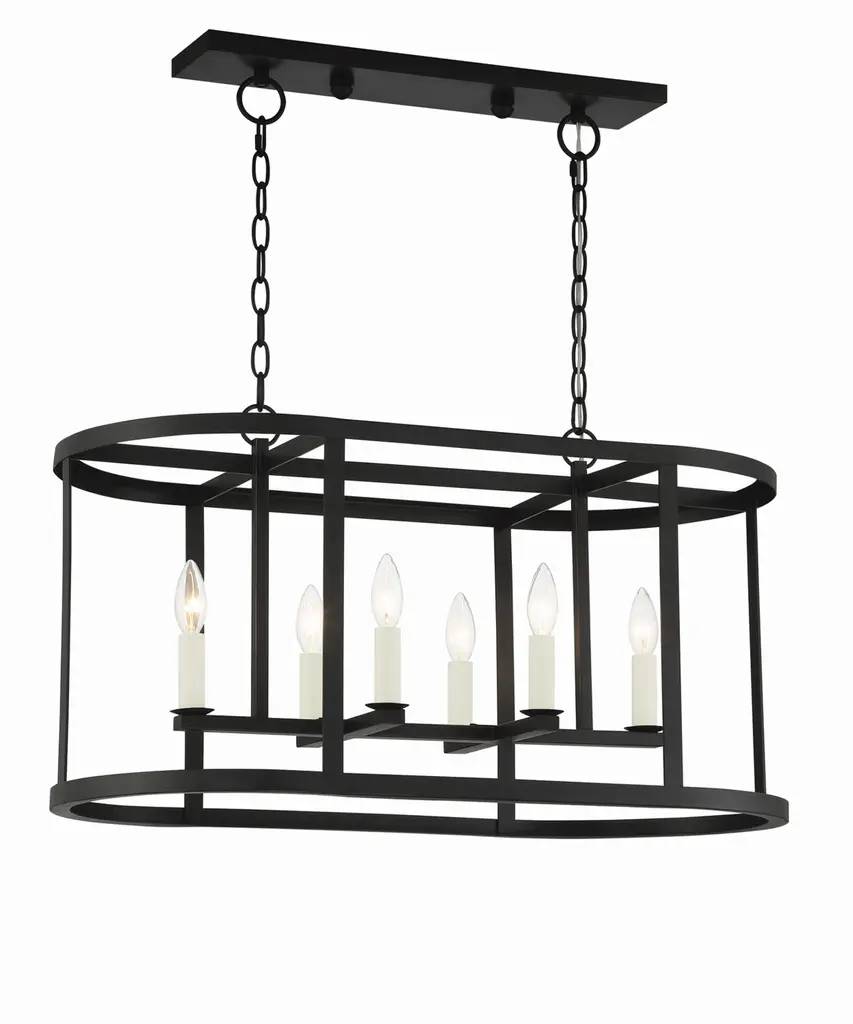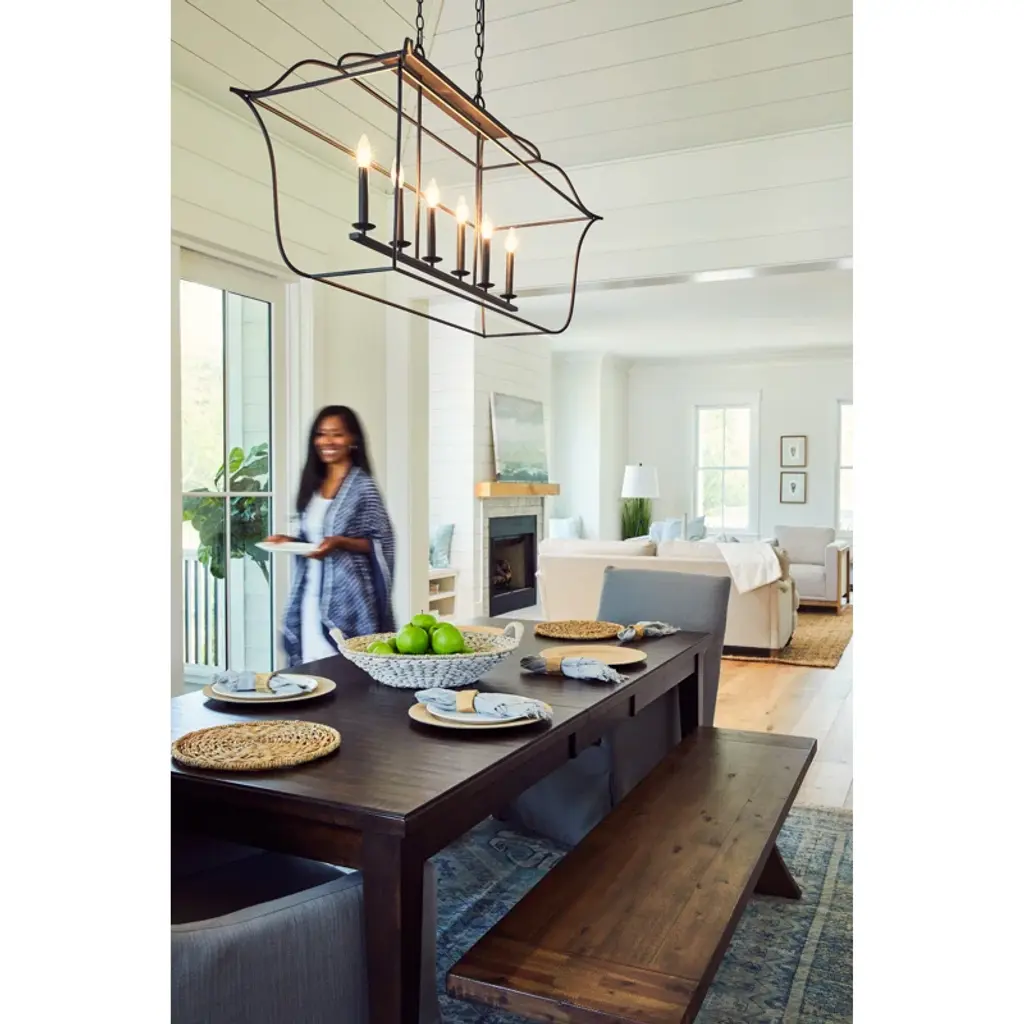 This 6-light chandelier is crafted in an open silhouette with slim, shapely lines that are sure to add a focal point to your farmhouse decor. It's made with a metal frame that lets you see inside to a row of candle-style lights. This linear chandelier gives off ambient light from six 60W candelabra bulbs (sold separately). It hangs from adjustable-height chains that work with sloped ceilings, so it's a sure fit, no matter the shape and size of your dining room. Plus, it's dimmable, so you can set just the right ambience for dinnertime.