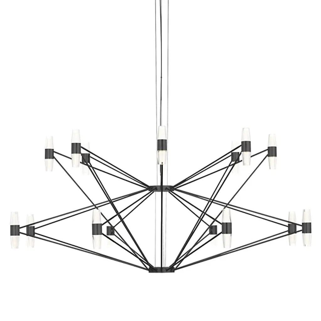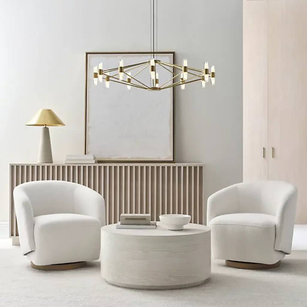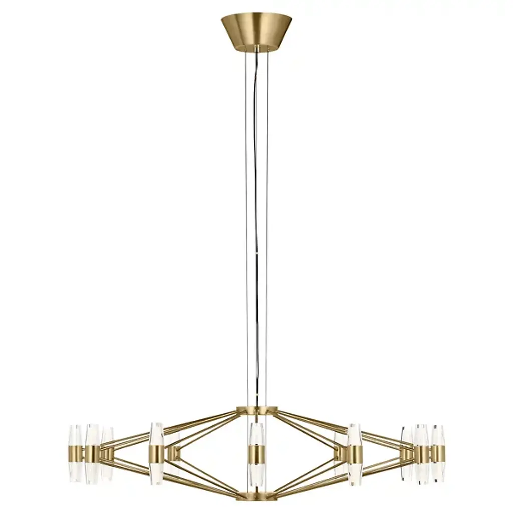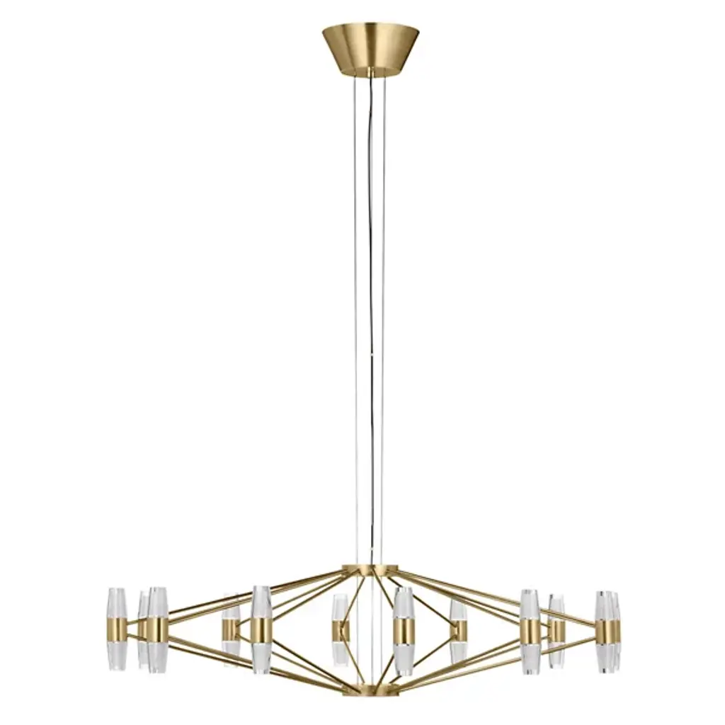The Lassell LED Chandelier from Visual Comfort Modern brings bold scale and refined geometry to contemporary interiors. Designed by Sean Lavin, this standout piece features delicate brass arms extending from a central hub to laser-etched crystal glass tubes. The result is a clean, linear form that plays with light and depth. This grand design is damp-listed and versatile, a strong choice that enhances dining tables, kitchen islands, or conference settings and makes a gorgeous, lasting impression.