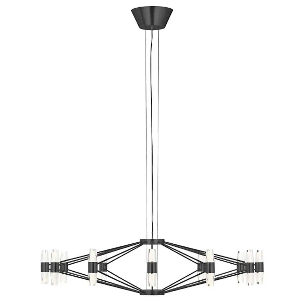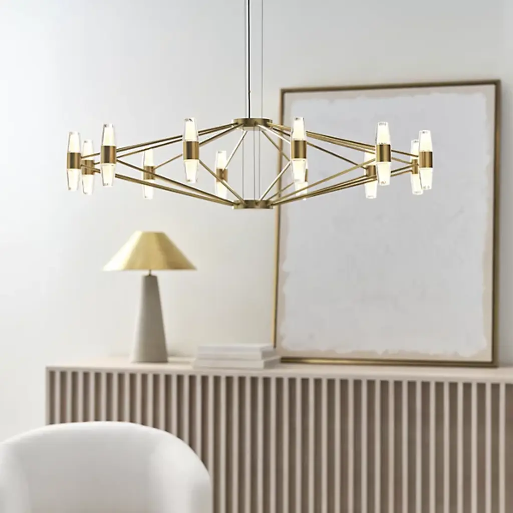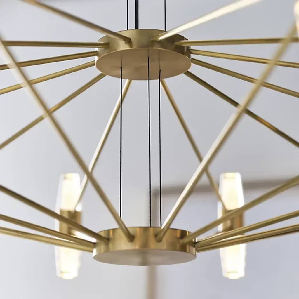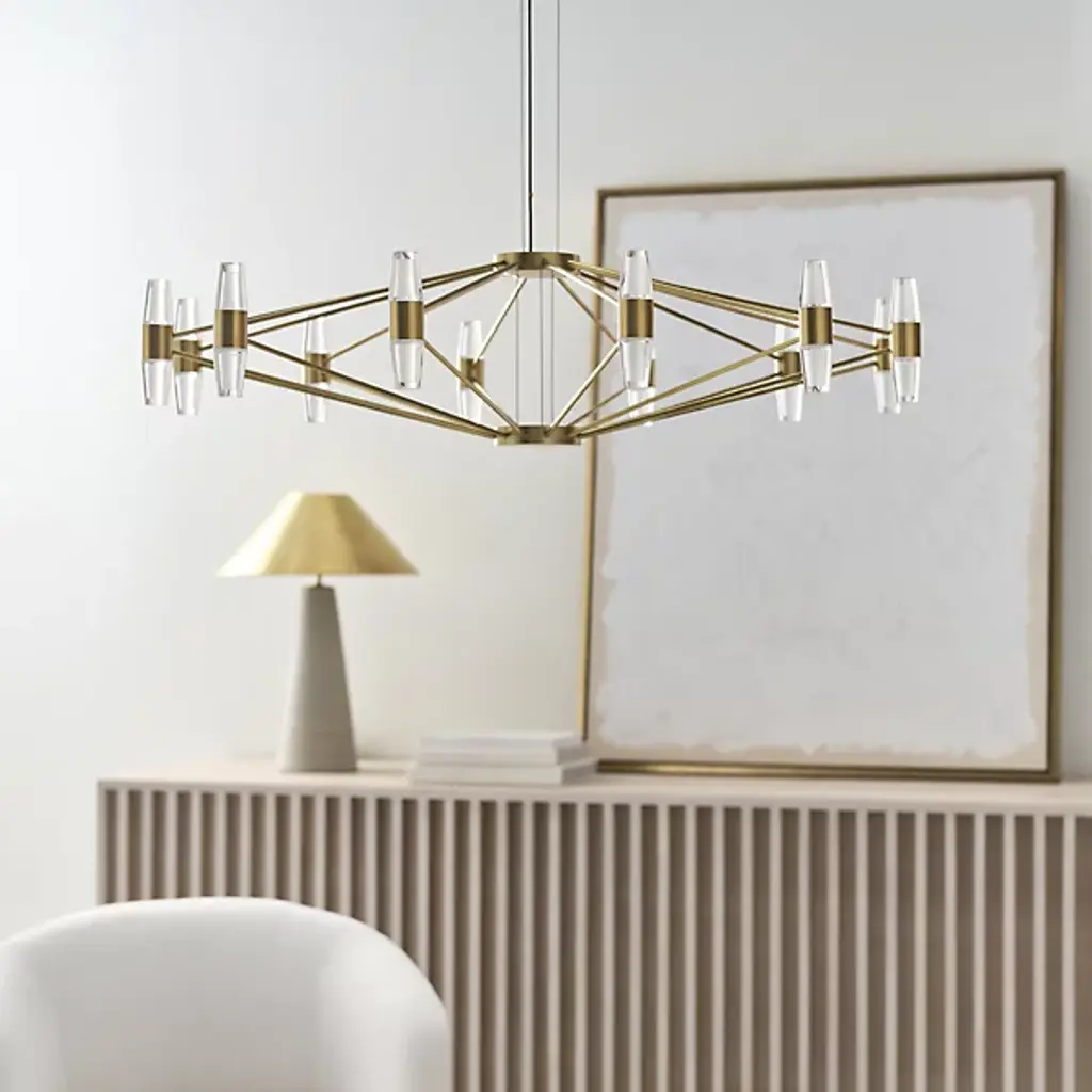 The Lassell LED Chandelier from Visual Comfort Modern brings bold scale and refined geometry to contemporary interiors. Designed by Sean Lavin, this standout piece features delicate brass arms extending from a central hub to laser-etched crystal glass tubes. The result is a clean, linear form that plays with light and depth. This grand design is damp-listed and versatile, a strong choice that enhances dining tables, kitchen islands, or conference settings and makes a gorgeous, lasting impression.