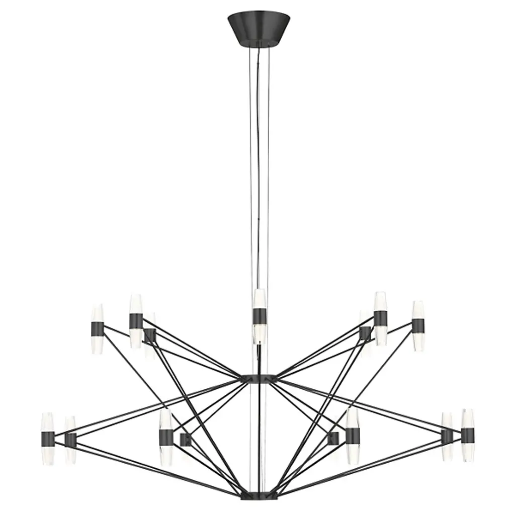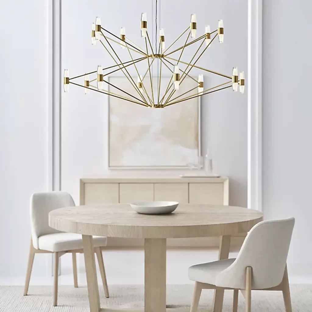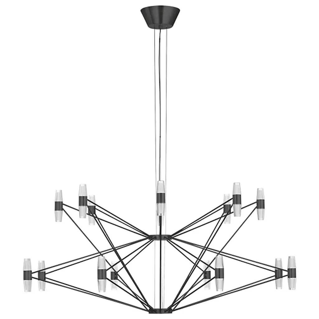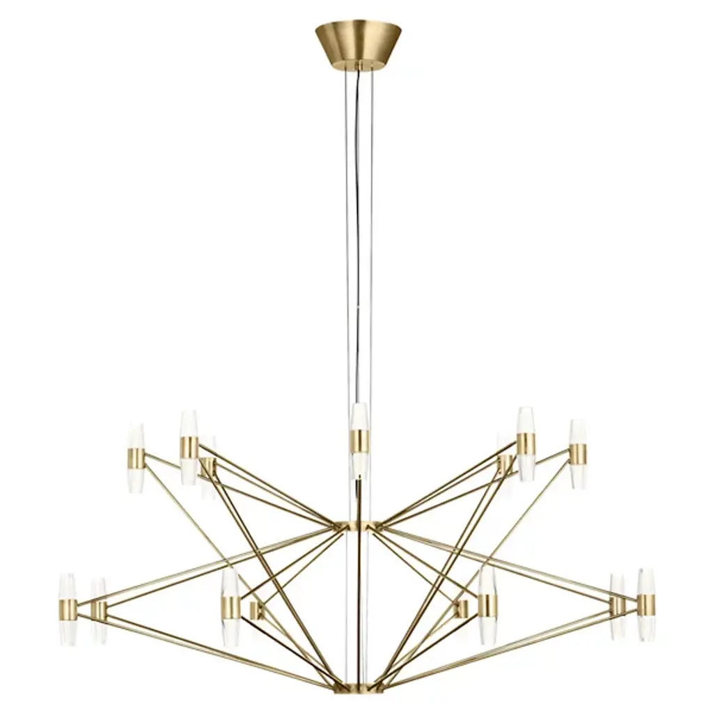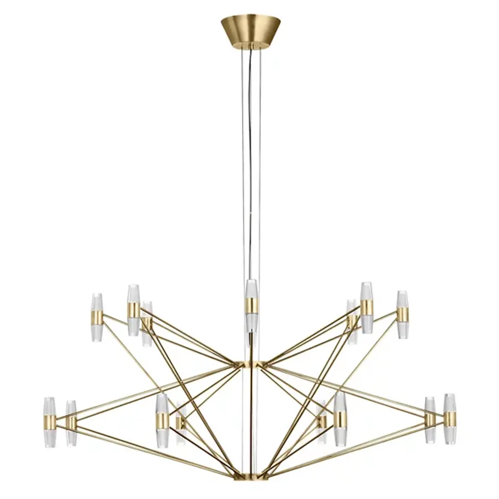 The Lassell Two Tier LED Chandelier from Visual Comfort Modern enhances large spaces with angular precision. Designed by Sean Lavin, it features a layered, two-tier structure with slender brass arms radiating outward to support efficient LED modules inside etched crystal glass tubes. Damp-listed and thoughtfully constructed, it brightens large gathering spaces with a sculptural, Mid-Century Modern edge. Combining sharp lines and translucent materials creates a dynamic presence that casts a beautiful, layered light.