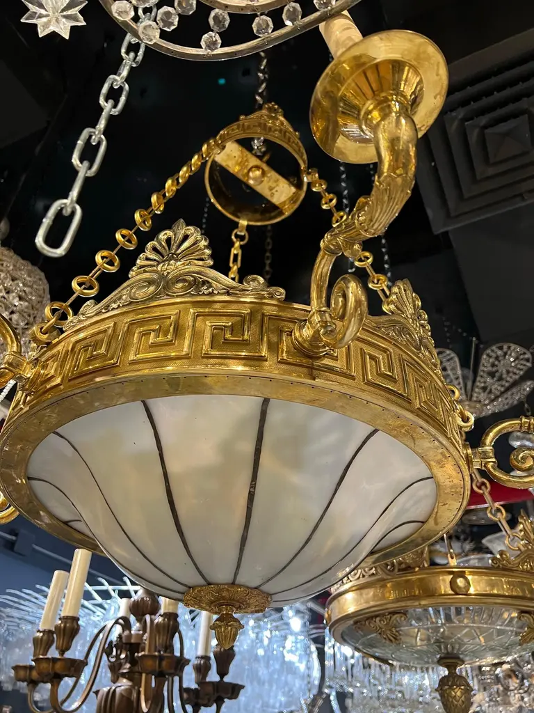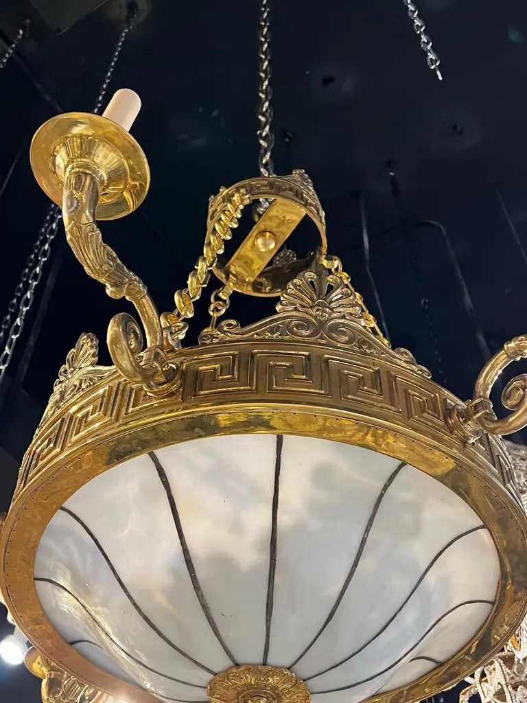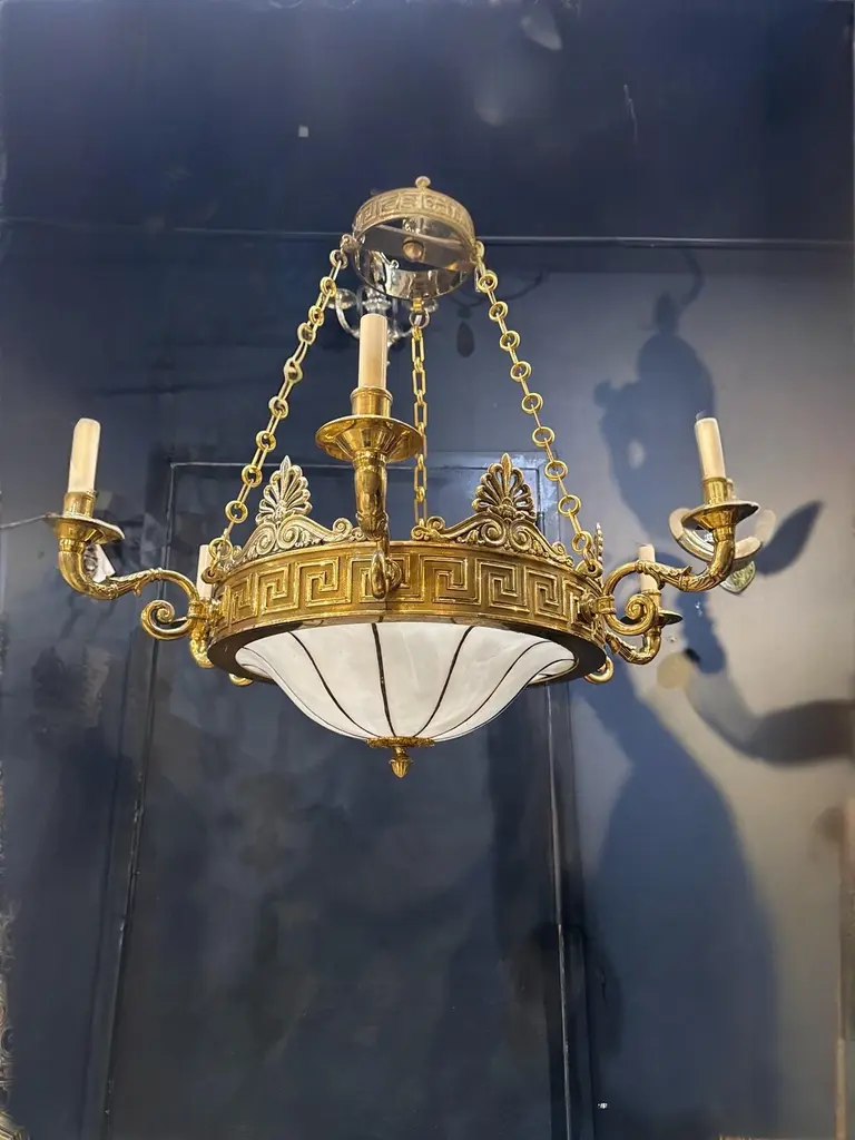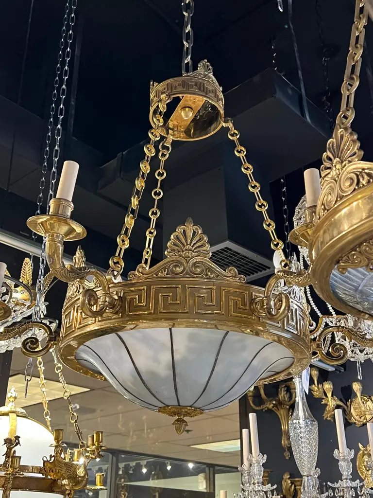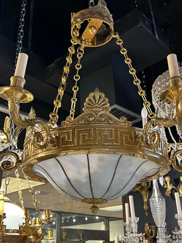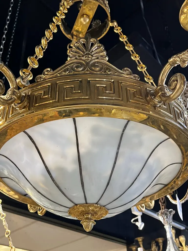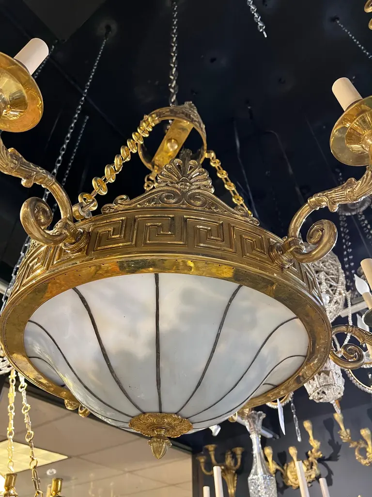 A late 19th Century Caldwell neoclassical style bronze chandelier with Greek key design and leaded glass Center part. 6 lights. Has Caldwell mark on top part. Available 2 items