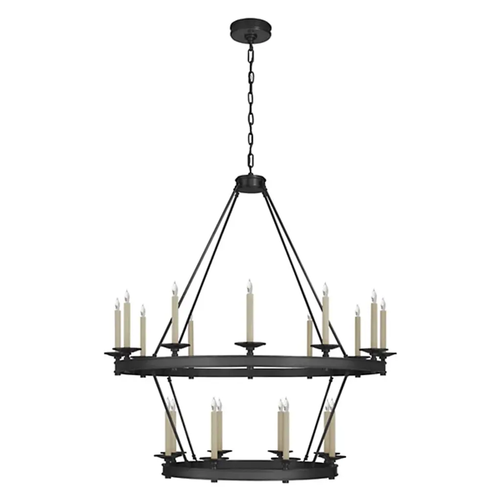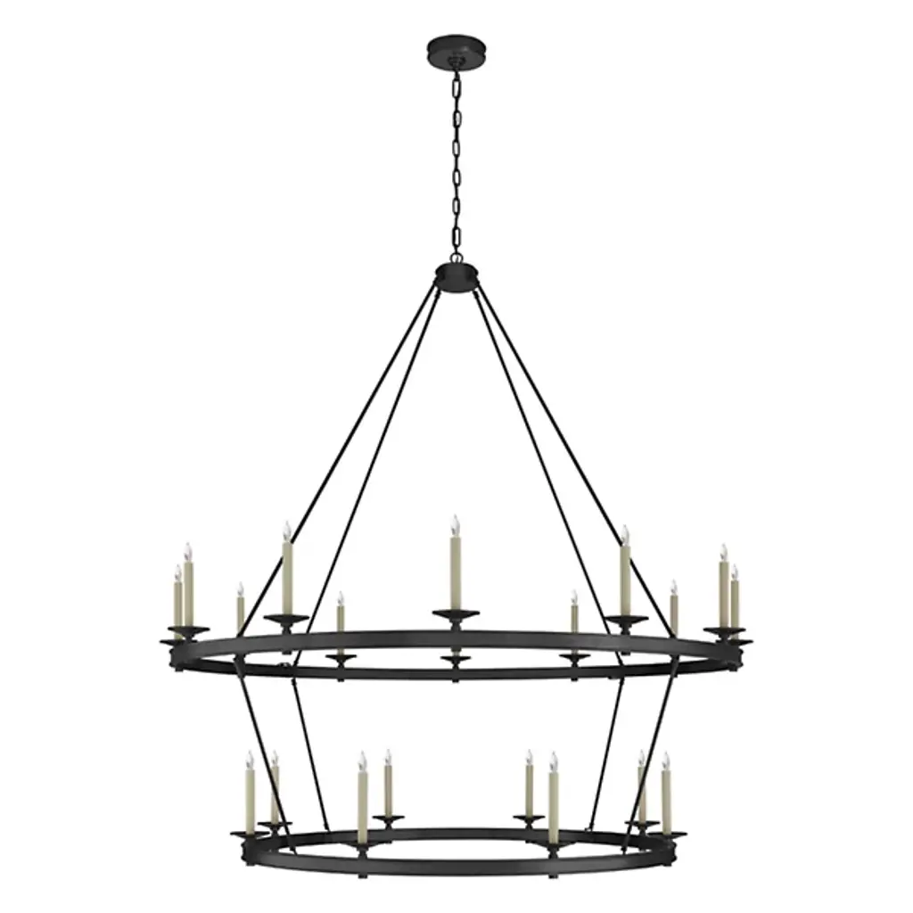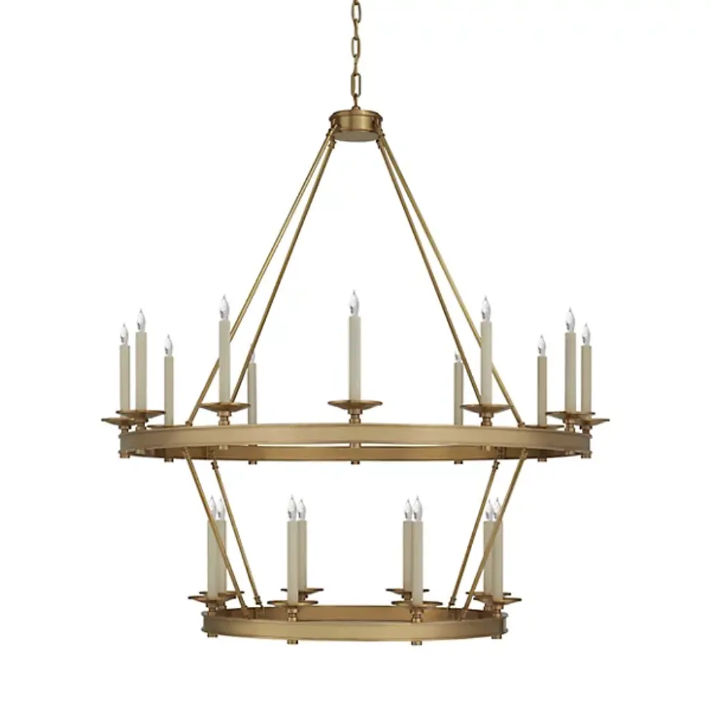Give your living space a royal sensibility with the Launceton 2 Tier Chandelier by Visual Comfort Signature, formerly known as Visual Comfort, From a ceiling canopy, a delicate chain connects to a circular supporting plate which serves as an anchor point for a chandelier. From this plate stem multiple downrods at either side of the light fixture, which intersect carousel platforms that support candlestick lights. When connecting the first tier to another, the downrods bend, creating a beautiful diamond-shaped silhouette. With LED bulbs atop plates at varying heights, you can rest assured that your contemporary setting will be illuminated from virtually every angle.