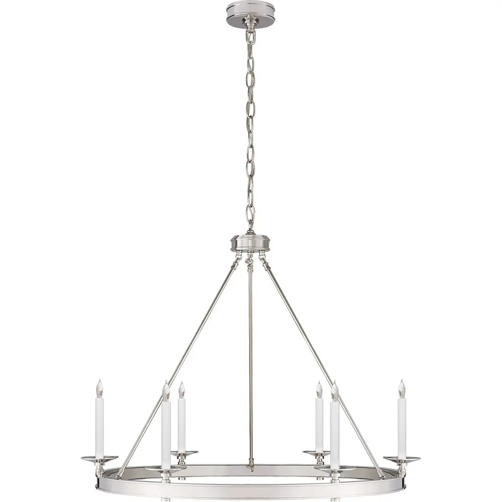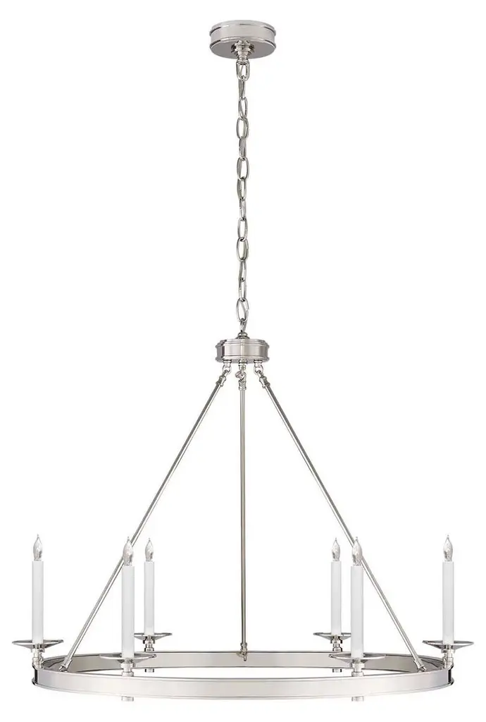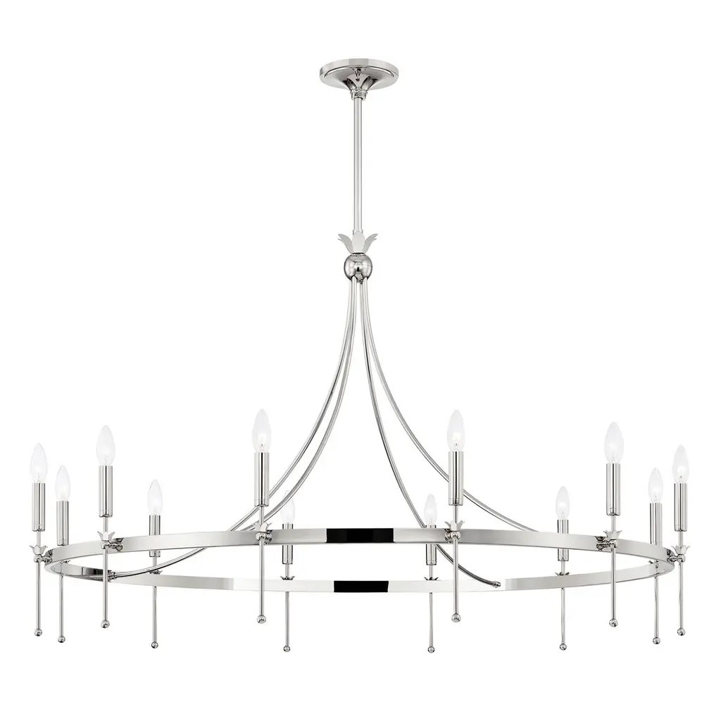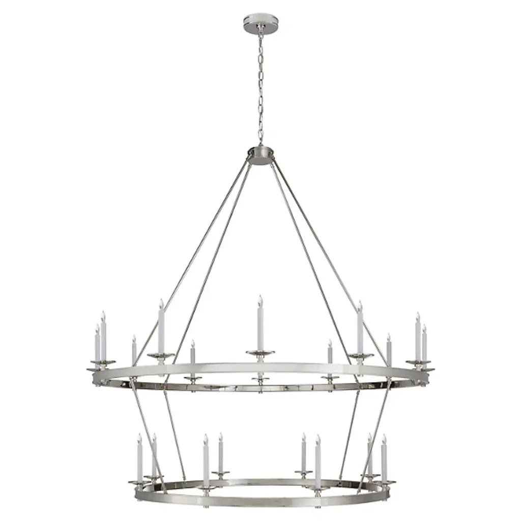 Give your living space a royal sensibility with the Launceton 2 Tier Chandelier by Visual Comfort Signature, formerly known as Visual Comfort, From a ceiling canopy, a delicate chain connects to a circular supporting plate which serves as an anchor point for a chandelier. From this plate stem multiple downrods at either side of the light fixture, which intersect carousel platforms that support candlestick lights. When connecting the first tier to another, the downrods bend, creating a beautiful diamond-shaped silhouette. With LED bulbs atop plates at varying heights, you can rest assured that your contemporary setting will be illuminated from virtually every angle.