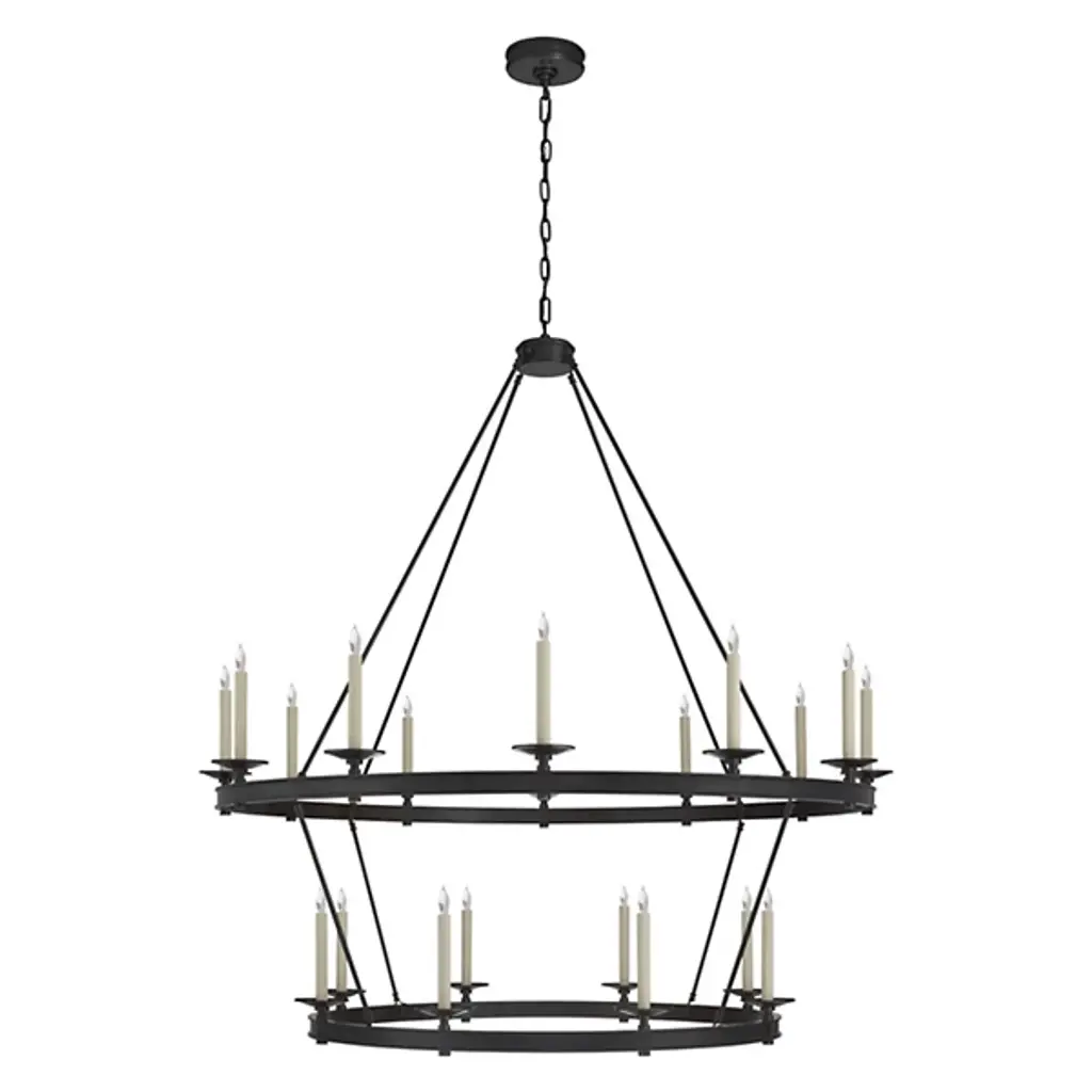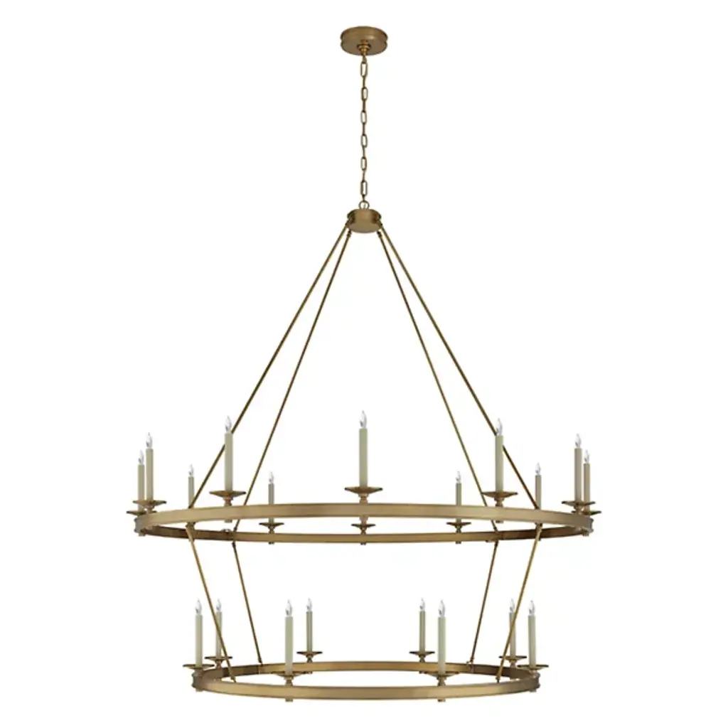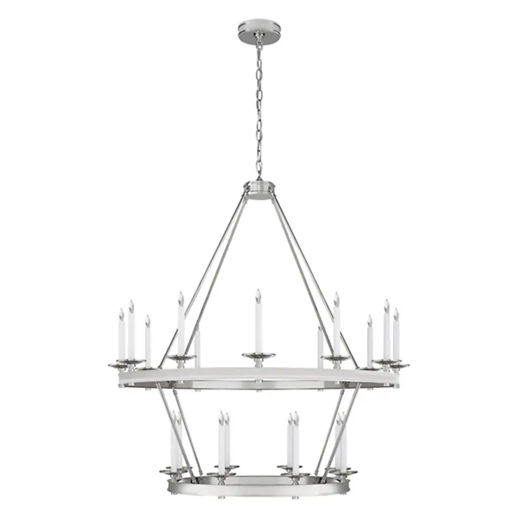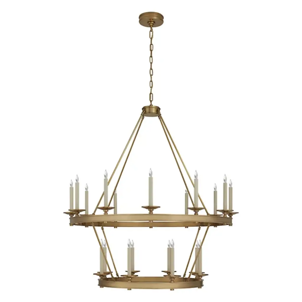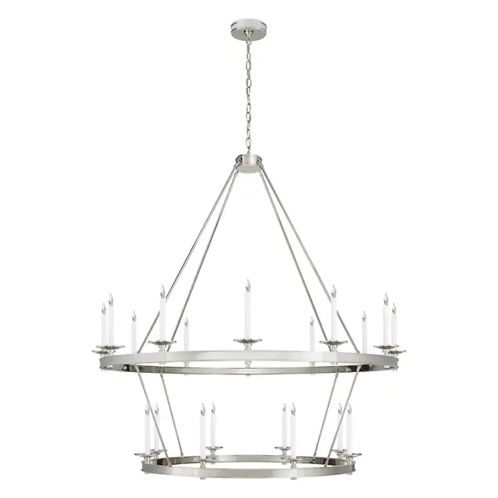 Give your living space a royal sensibility with the Launceton 2 Tier Chandelier by Visual Comfort Signature, formerly known as Visual Comfort, From a ceiling canopy, a delicate chain connects to a circular supporting plate which serves as an anchor point for a chandelier. From this plate stem multiple downrods at either side of the light fixture, which intersect carousel platforms that support candlestick lights. When connecting the first tier to another, the downrods bend, creating a beautiful diamond-shaped silhouette. With LED bulbs atop plates at varying heights, you can rest assured that your contemporary setting will be illuminated from virtually every angle.