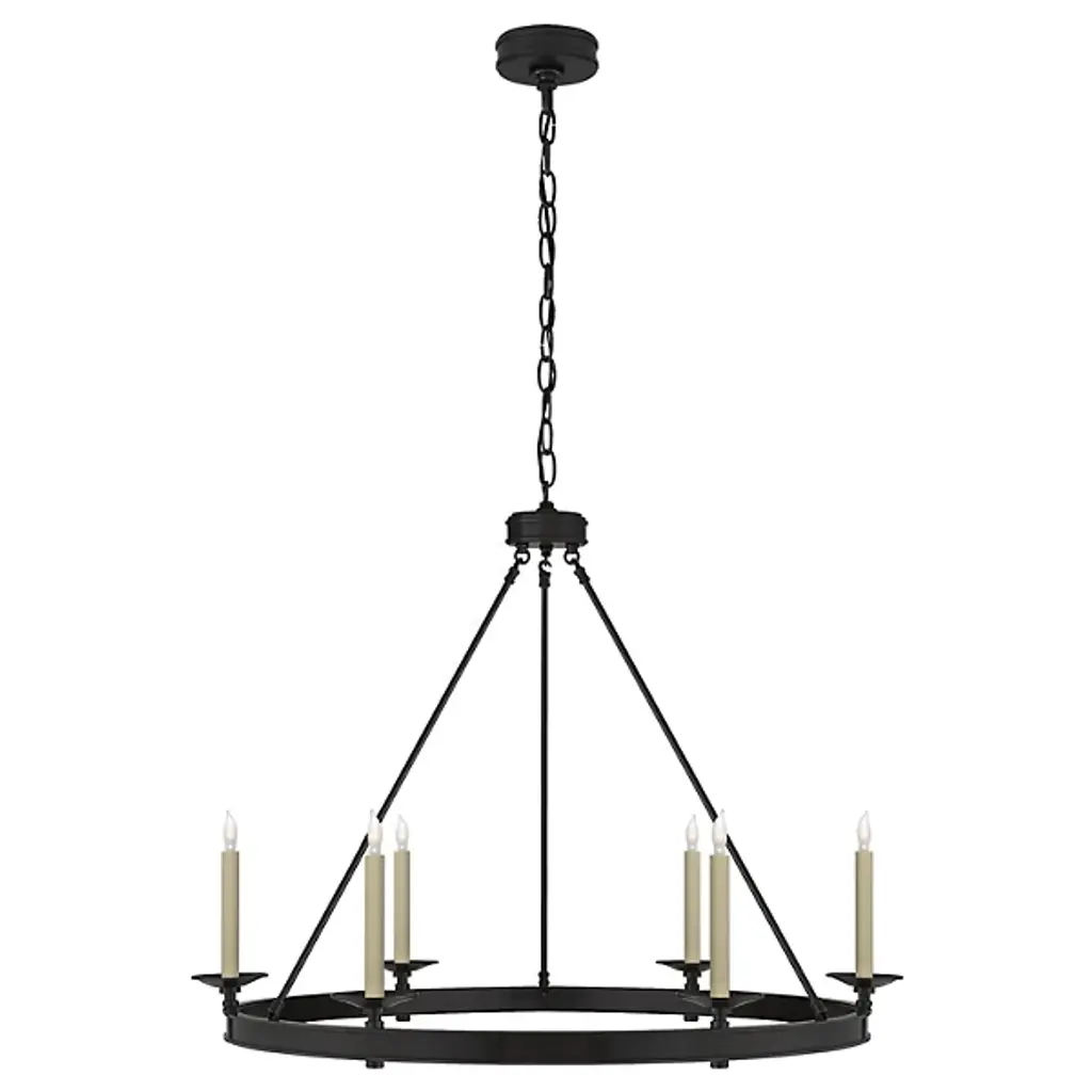 The Launceton Chandelier from Visual Comfort invigorates the room with crisp contours and intimate light. It sports a transitional design that’s easy on the eyes. The chandelier descends with a pointy suspension towards a minimalist ring framework. Bobeche dish accents crown the framework with sharp notes. Slender candle-like lamp holders stand above for a dash of contrast and traditional flair. The addition of pointy candelabra bulbs delights with shiny warmth. These bulbs provide great light coverage for true visual comfort.