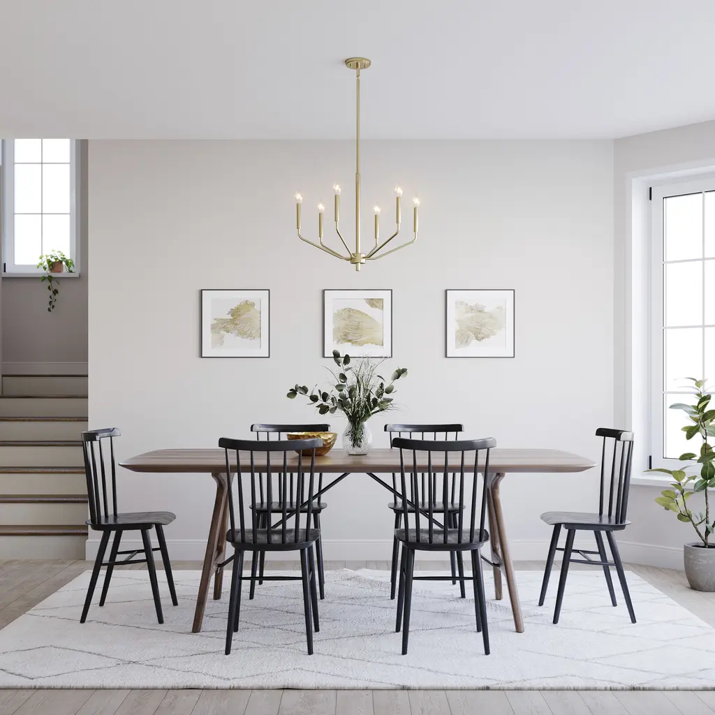 A contemporary twist on the classic Gothic design, this 60w six-light chandelier measures 24 x 18 3/8 and is available in a matte black and modern gold finish. The uniquely angled arms provide a distinctive look designed to beautifully enhance any interior space.