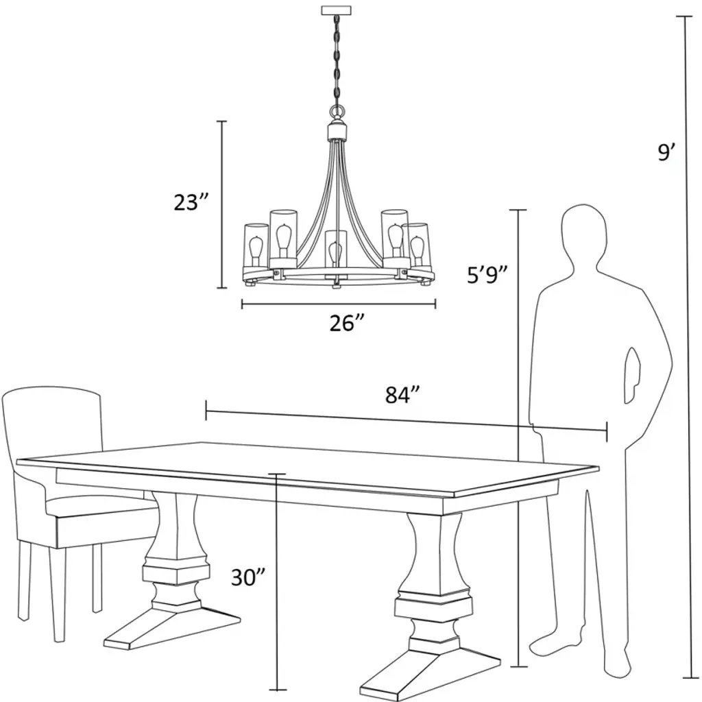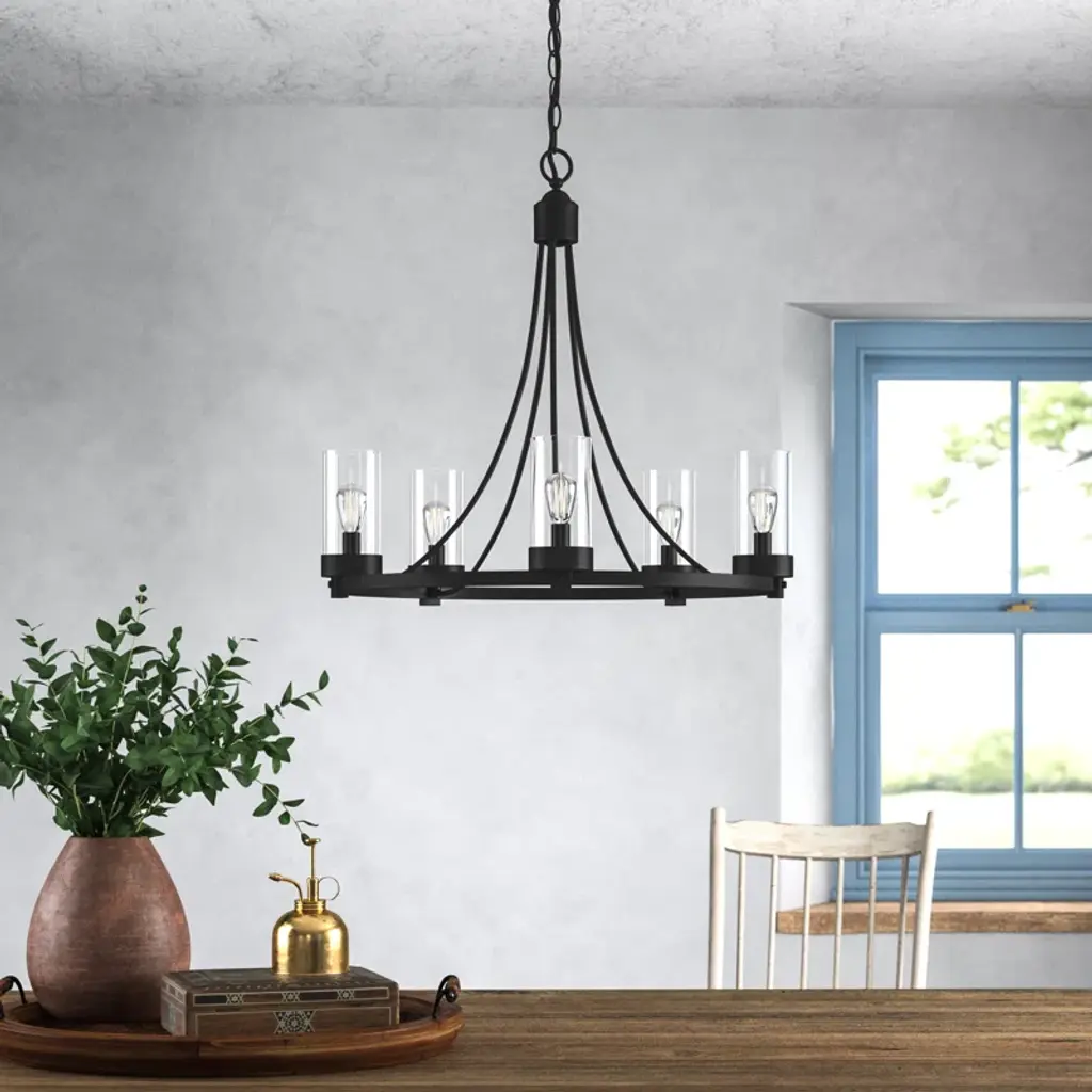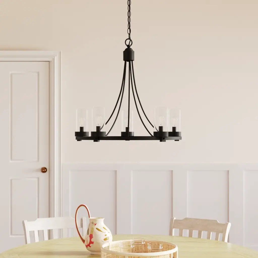This wagon wheel chandelier fills your living room with plenty of ambient lighting for game nights with the whole family. It's crafted with an open circular metal frame with a tapered top, and it holds five cylindrical, hand-blown glass shades. This 5-light chandelier takes five candelabra bulbs up to 60W each (sold separately). We love that it's dimmable, so you can turn the lights down for a movie night, or up for a reading time. Plus, it hangs from an adjustable-height chain that works with sloped ceilings, so it's sure to fit your home.