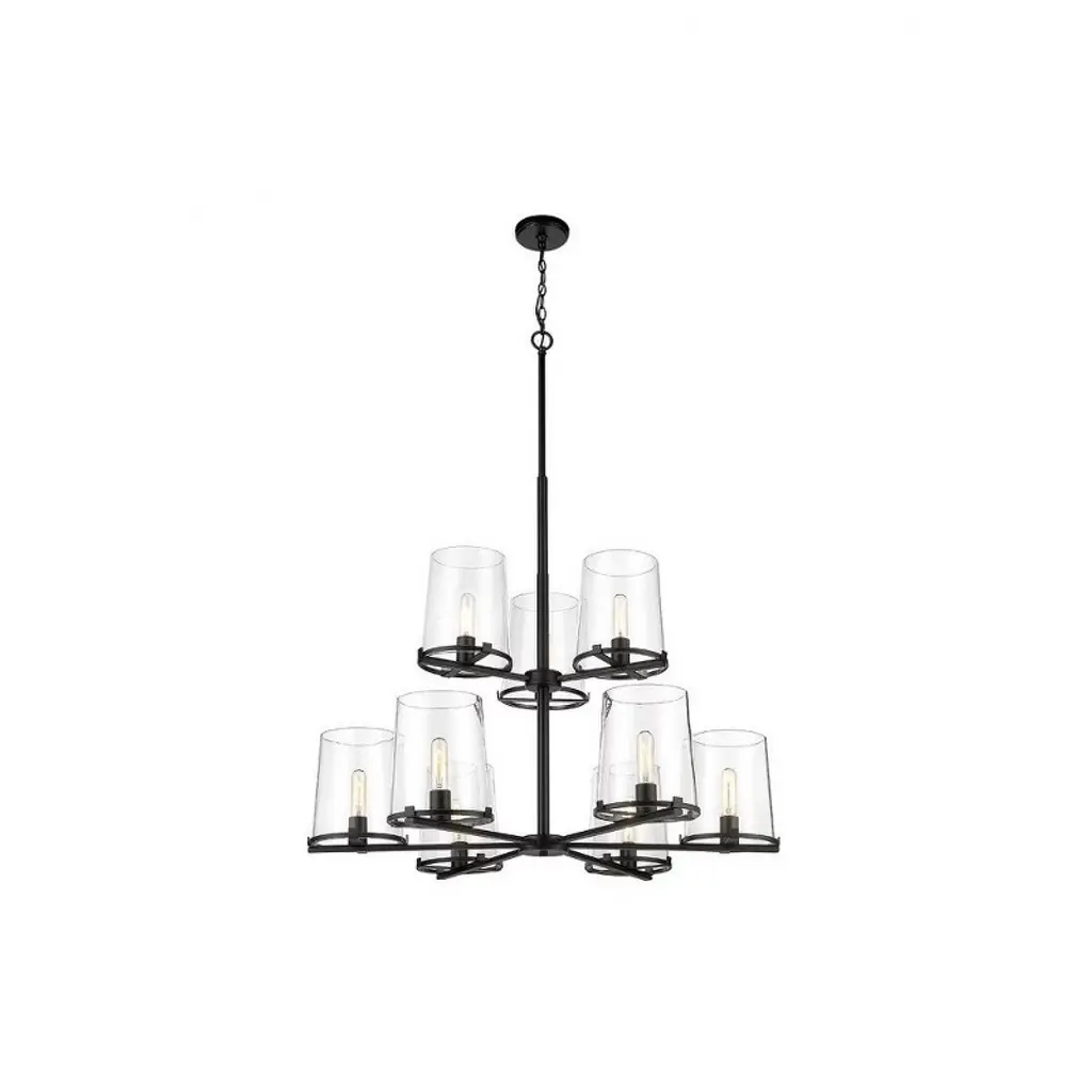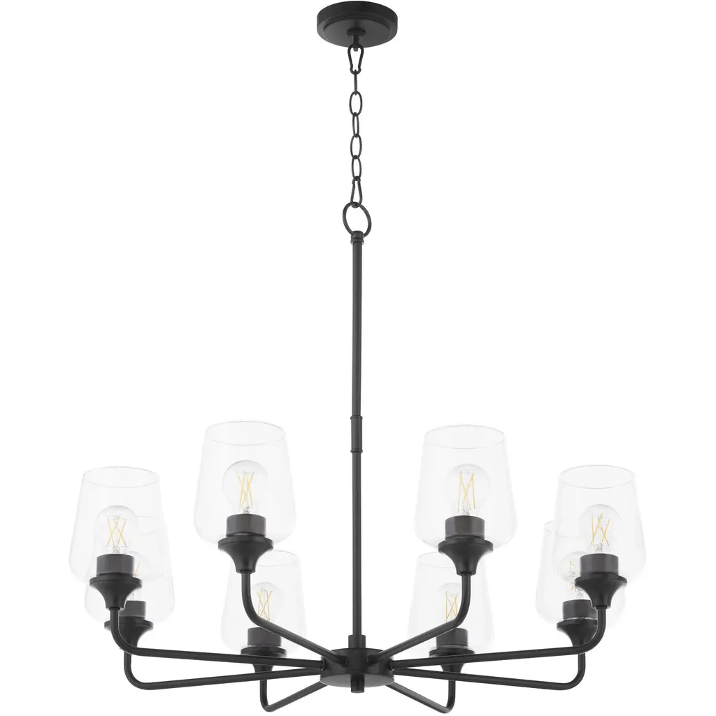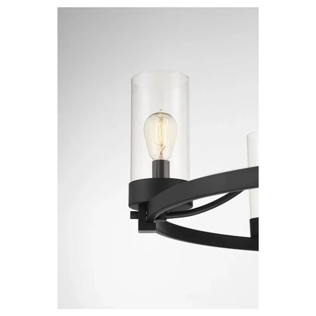 This wagon wheel chandelier fills your living room with plenty of ambient lighting for game nights with the whole family. It's crafted with an open circular metal frame with a tapered top, and it holds five cylindrical, hand-blown glass shades. This 5-light chandelier takes five candelabra bulbs up to 60W each (sold separately). We love that it's dimmable, so you can turn the lights down for a movie night, or up for a reading time. Plus, it hangs from an adjustable-height chain that works with sloped ceilings, so it's sure to fit your home.