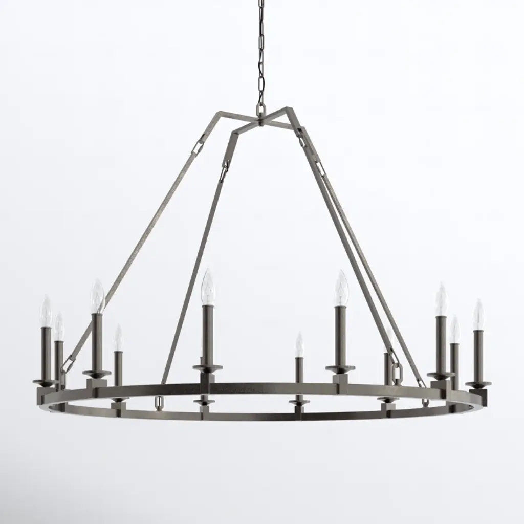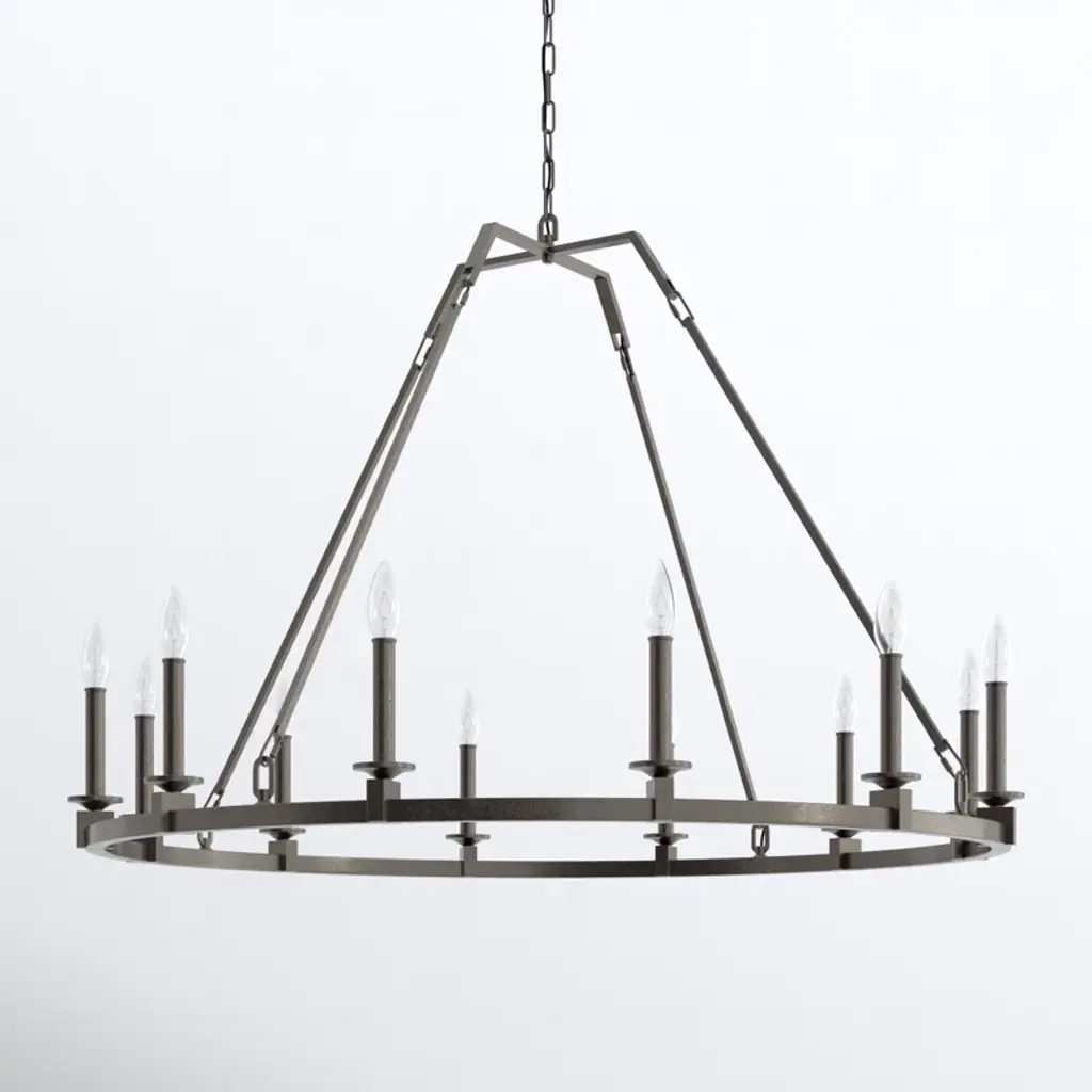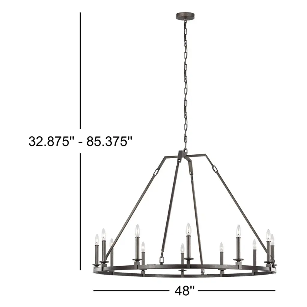 This 12-light wagon wheel chandelier has a rustic tavern feel that's sure to bring some warm, inviting charm into your dining room. It's crafted with an open metal frame in a dark, smith steel finish, with factory-inspired hardware for a salt-of-the-earth touch. It gives off plenty of ambient light from 12 candle-style lights that take 60W bulbs (sold separately). You can install this chandelier on a dimmer switch to set just the right mood for dinnertime. Plus, it hangs from an adjustable-height chain, so it's just right for your ceilings.