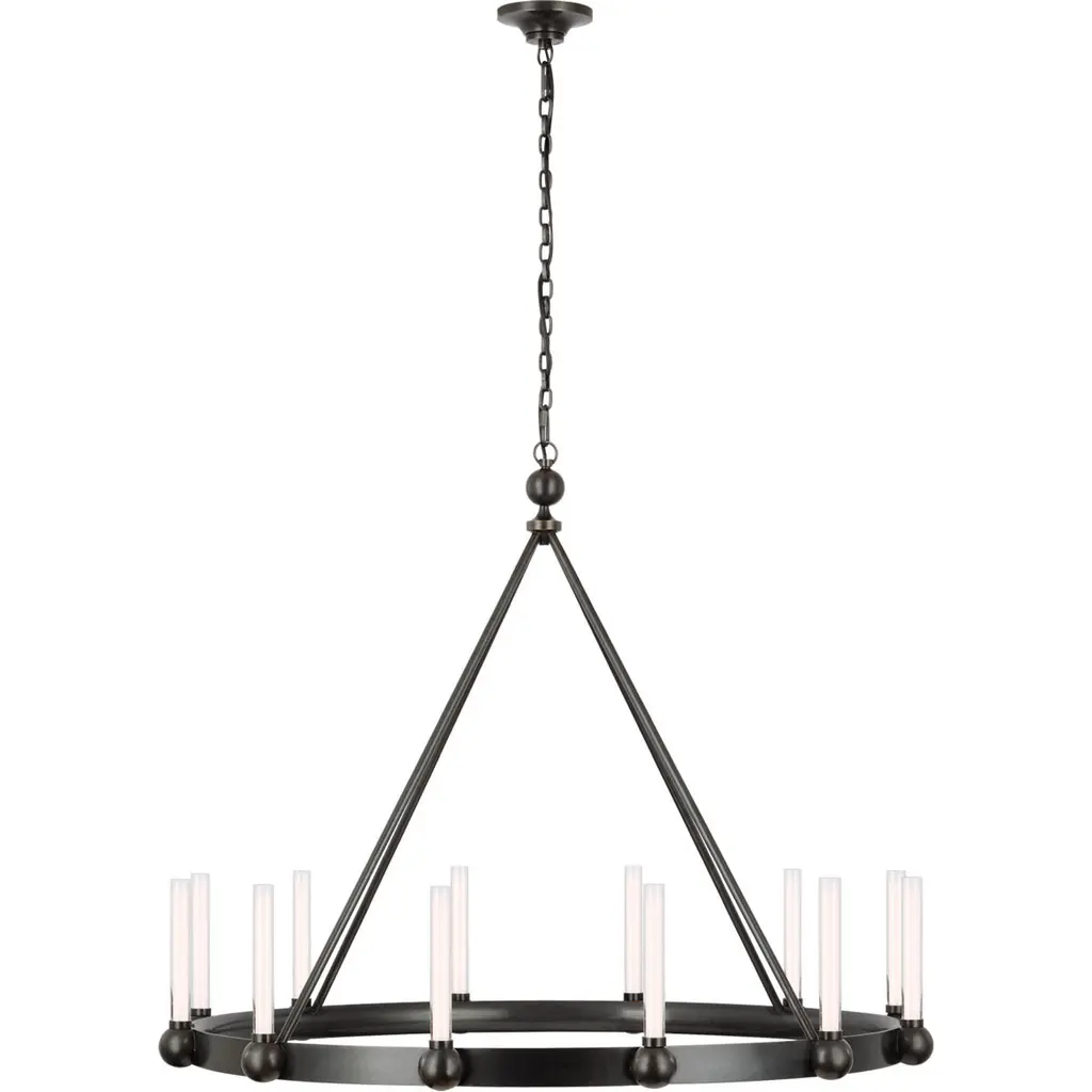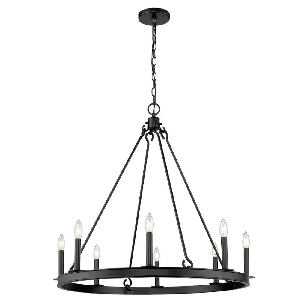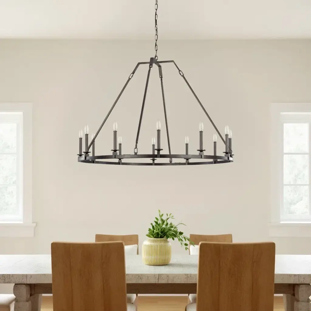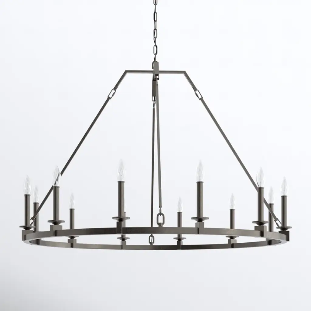 This 12-light wagon wheel chandelier has a rustic tavern feel that's sure to bring some warm, inviting charm into your dining room. It's crafted with an open metal frame in a dark, smith steel finish, with factory-inspired hardware for a salt-of-the-earth touch. It gives off plenty of ambient light from 12 candle-style lights that take 60W bulbs (sold separately). You can install this chandelier on a dimmer switch to set just the right mood for dinnertime. Plus, it hangs from an adjustable-height chain, so it's just right for your ceilings.