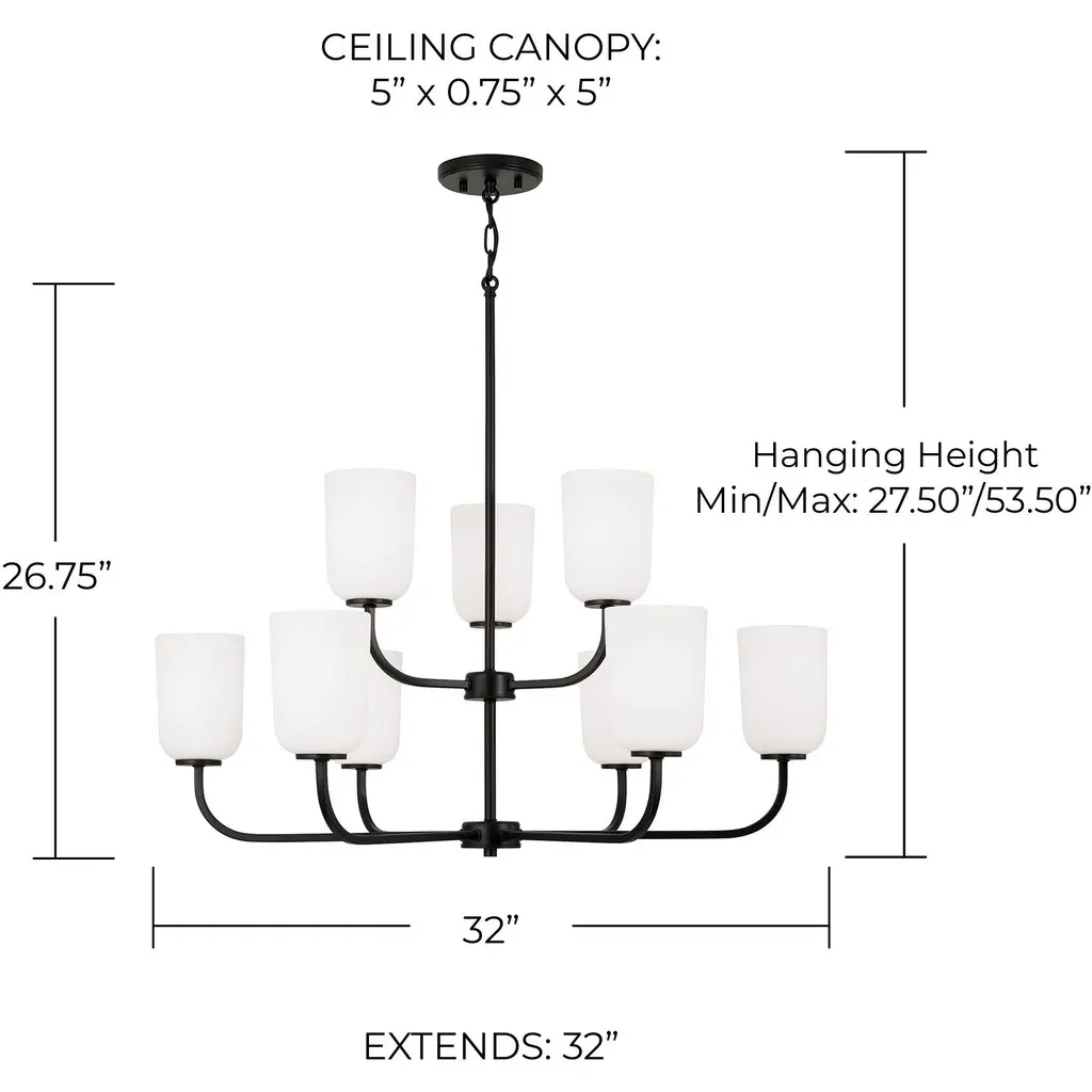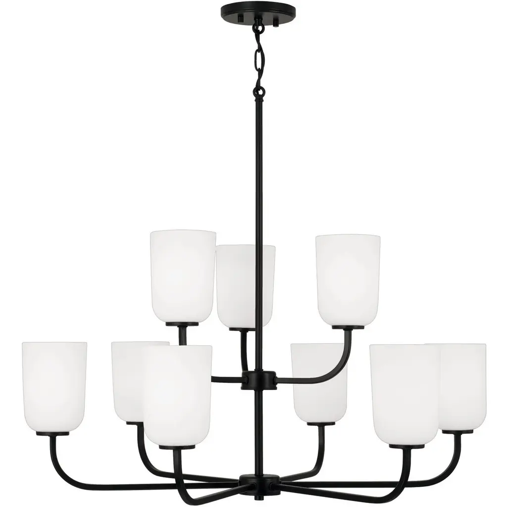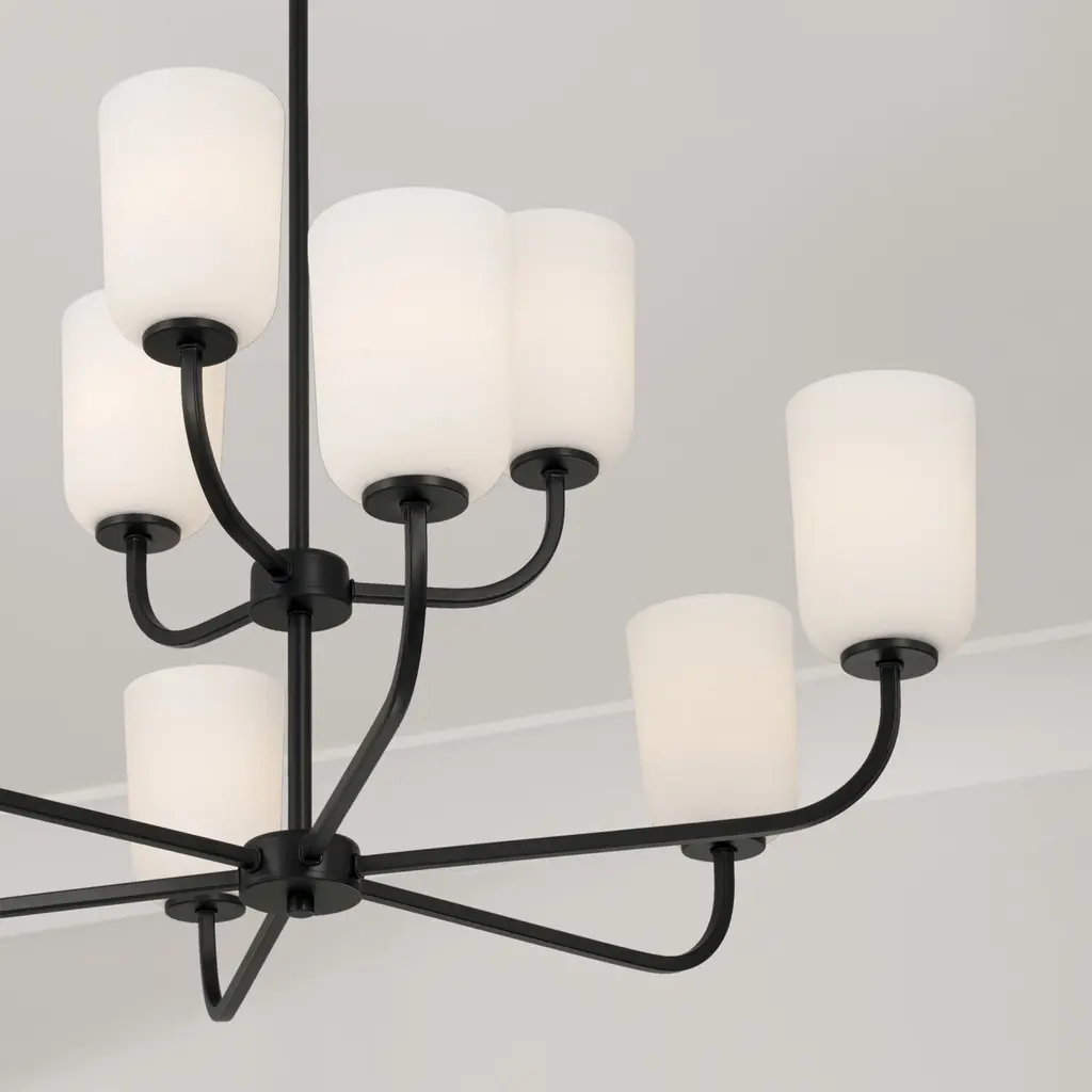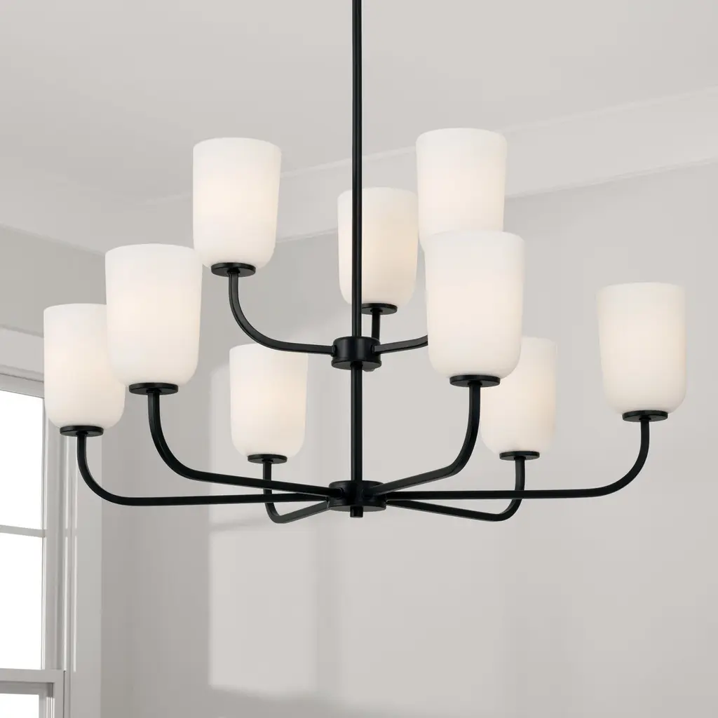 With soft contours and arched forms, the Lawson 9-Light Chandelier for HomePlace brings curve appeal to any space. The Matte Black finish and soft white glass shades create a classic aesthetic that mixes with any style.