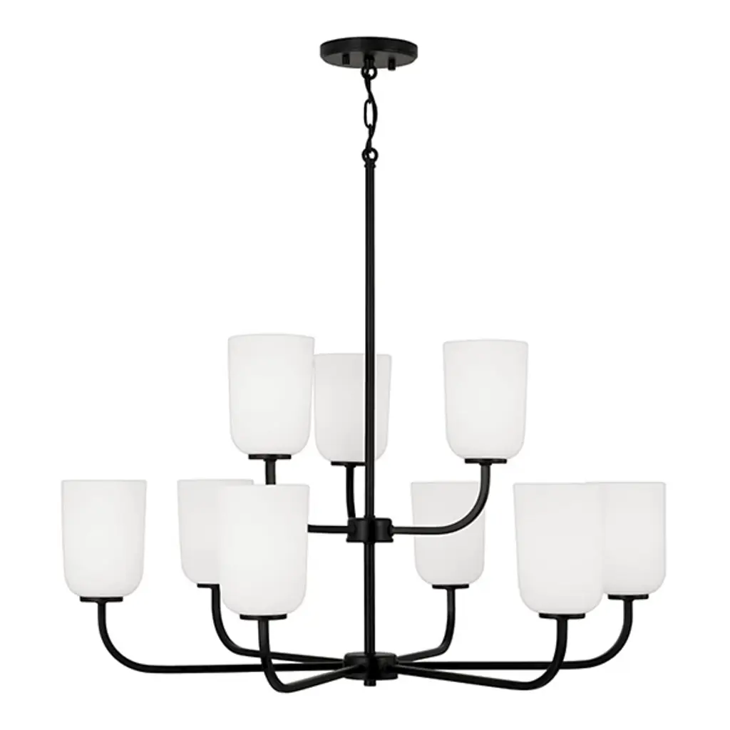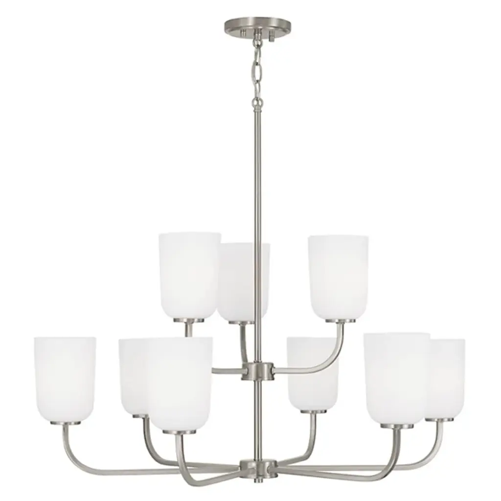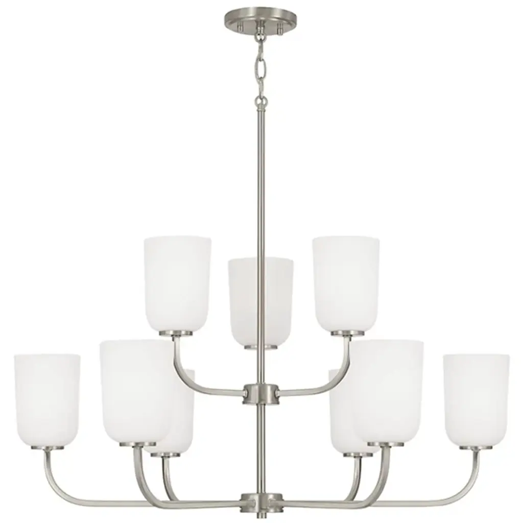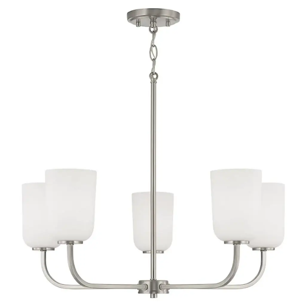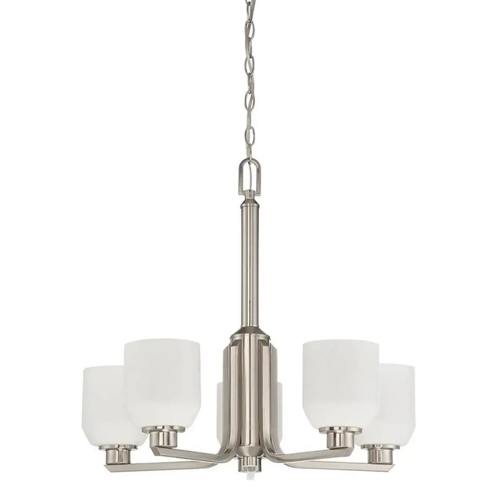 The Lawson Chandelier from Capital Lighting brings a bold and bright ambiance to your surroundings. This transitional piece elegantly combines metal and glass, descending gracefully from a disc-shaped canopy to a rounded hub studded with curving arms that extend outward and upward. The chandelier features powerful damp-listed lighting encased within rounded shades of translucent glass, displaying a refined simplicity as they extend from each arm. The inverted dome shades effectively diffuse bright light into a gentle radiance, and each open shade mouth creates a focused spot of uplight, contributing to an engaging interplay of illumination.