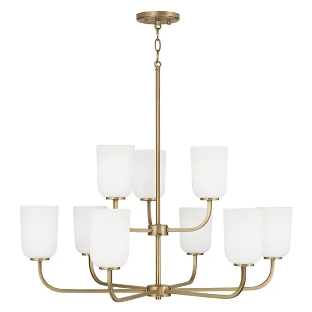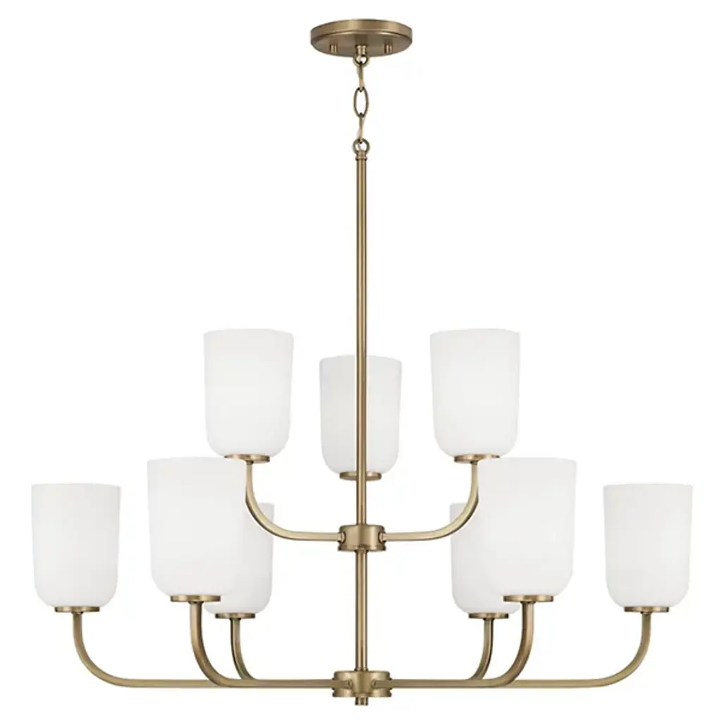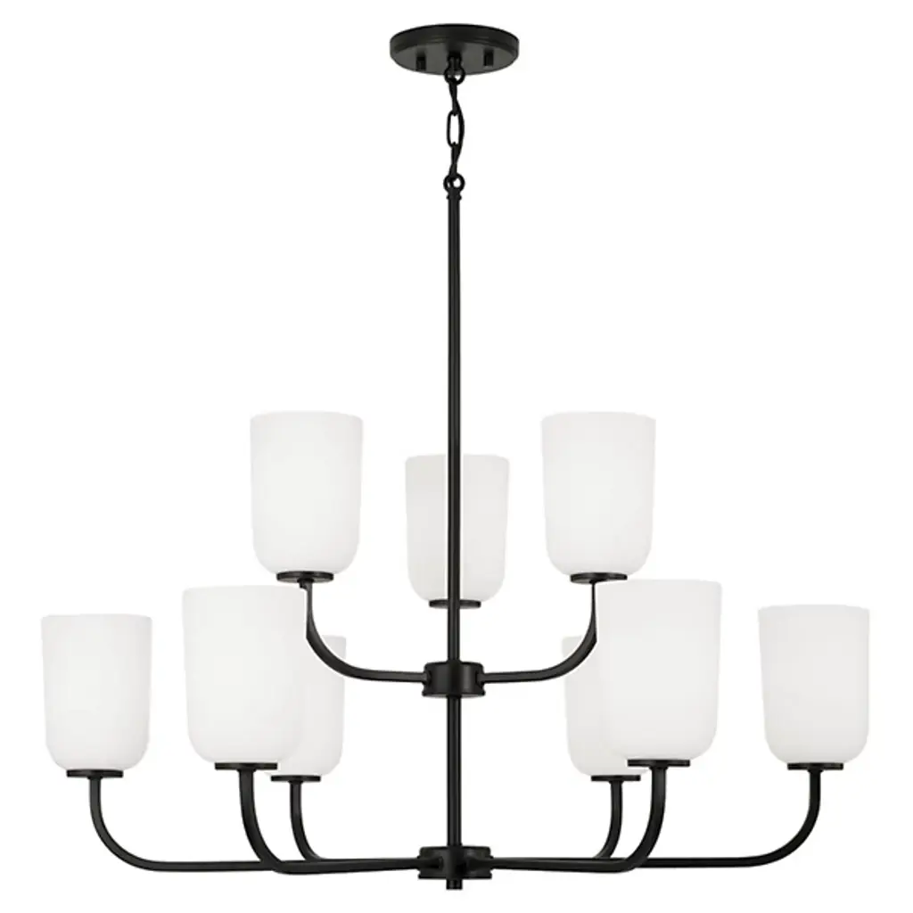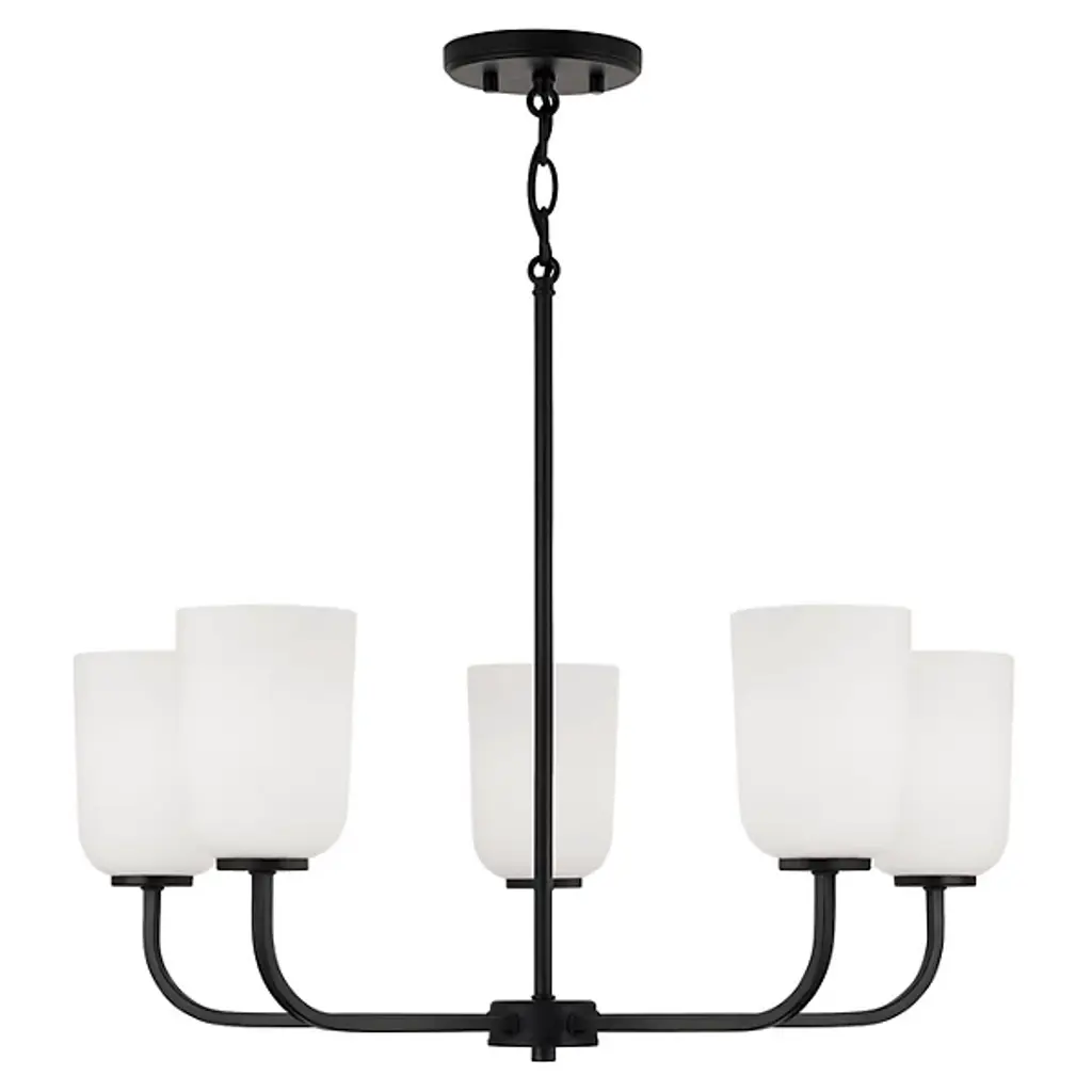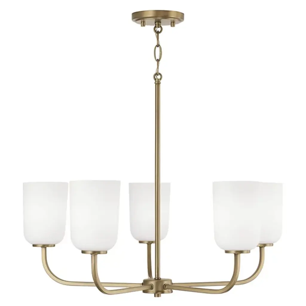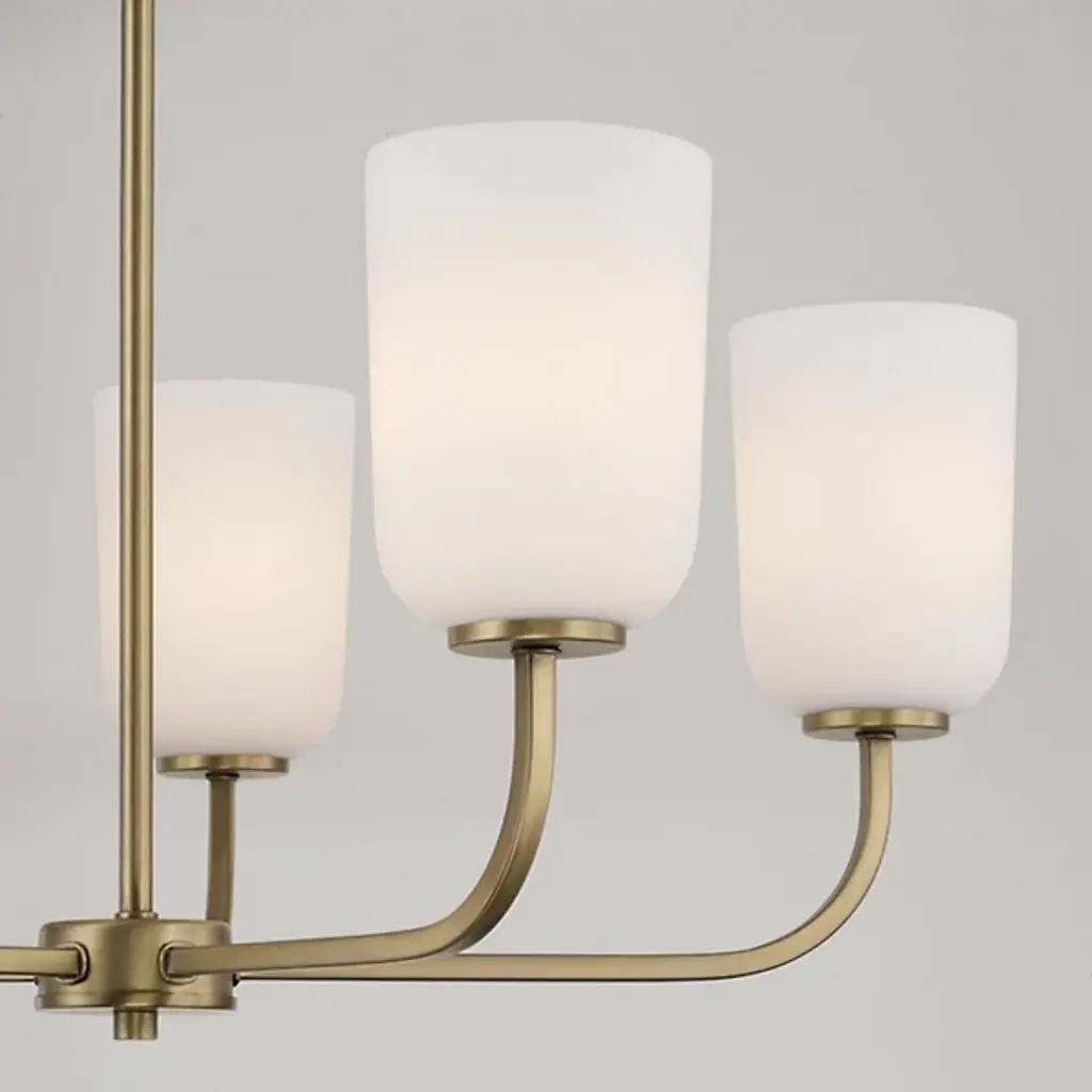 The Lawson Chandelier from Capital Lighting brings a bold and bright ambiance to your surroundings. This transitional piece elegantly combines metal and glass, descending gracefully from a disc-shaped canopy to a rounded hub studded with curving arms that extend outward and upward. The chandelier features powerful damp-listed lighting encased within rounded shades of translucent glass, displaying a refined simplicity as they extend from each arm. The inverted dome shades effectively diffuse bright light into a gentle radiance, and each open shade mouth creates a focused spot of uplight, contributing to an engaging interplay of illumination.