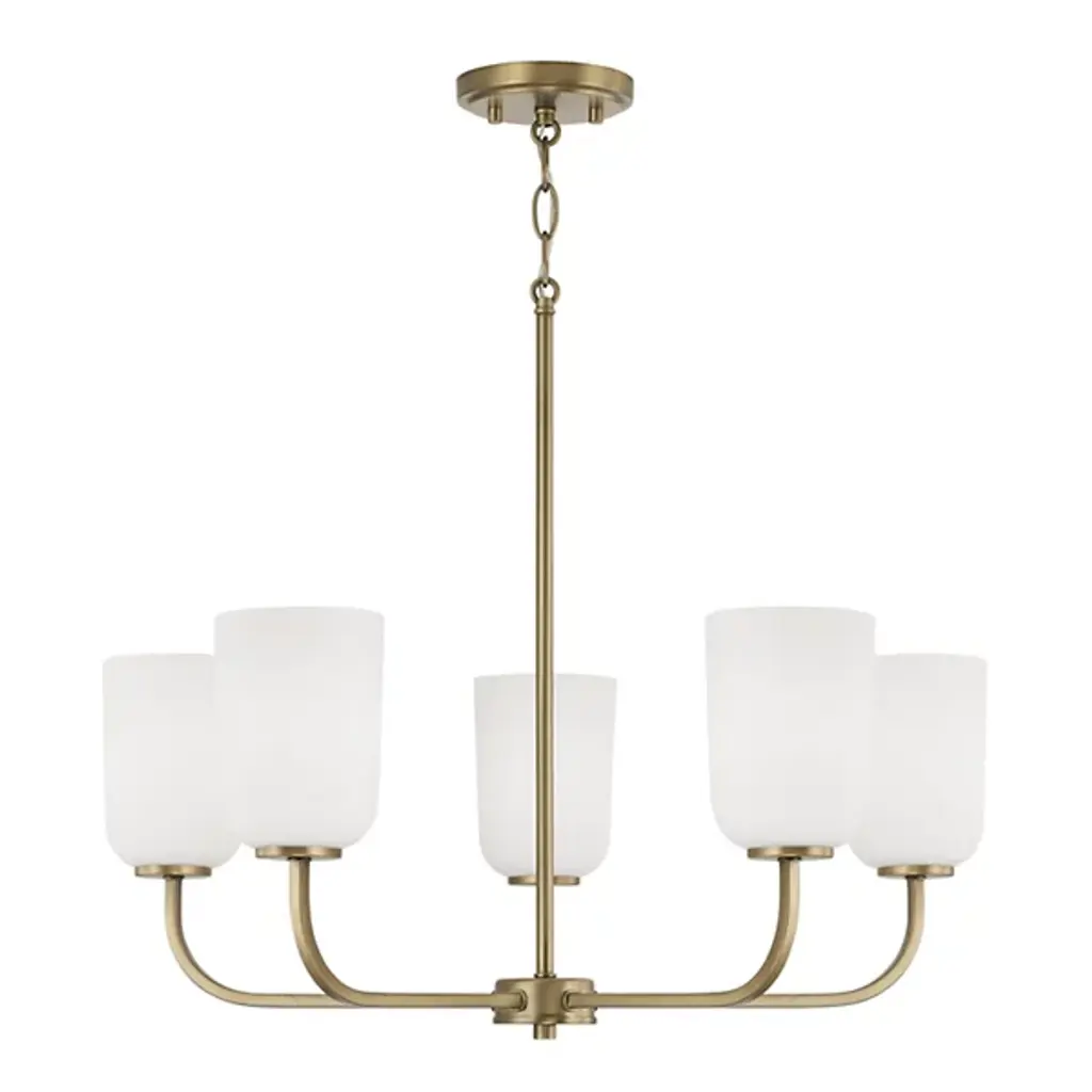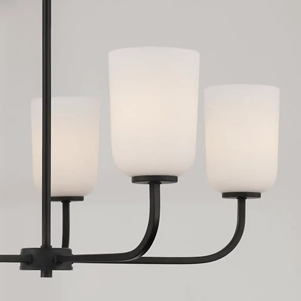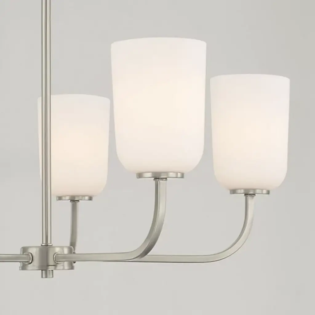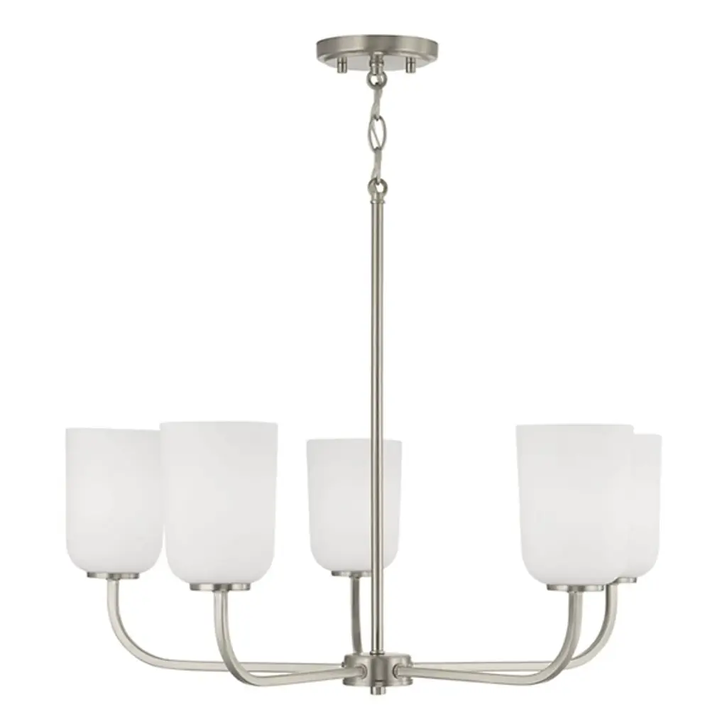 The Lawson Chandelier from Capital Lighting brings a bold and bright ambiance to your surroundings. This transitional piece elegantly combines metal and glass, descending gracefully from a disc-shaped canopy to a rounded hub studded with curving arms that extend outward and upward. The chandelier features powerful damp-listed lighting encased within rounded shades of translucent glass, displaying a refined simplicity as they extend from each arm. The inverted dome shades effectively diffuse bright light into a gentle radiance, and each open shade mouth creates a focused spot of uplight, contributing to an engaging interplay of illumination.