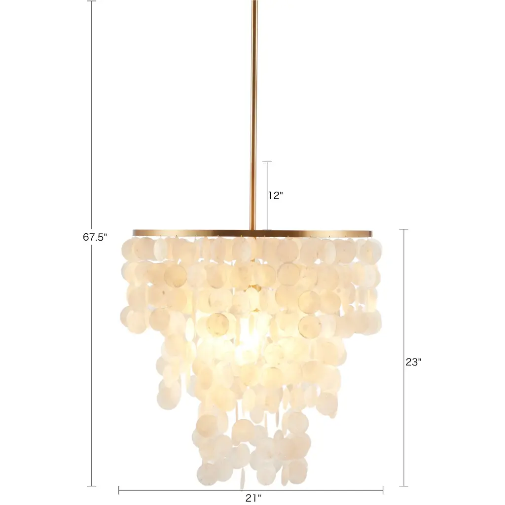 Uniquely elegant, the Urban Habitat Isla Layered Capiz Chandelier offers an eye-catching look for your home. A white shade features a shell shape that drapes beautifully complementing the gold base. Add the one-of-a-kind style of this Capiz Chandelier to your living room or bedroom, for a look that is sure to impress. PRODUCT DETAILS 1 Chandelier: 21"Dia x 67.5"H Cord Length: 72" Shade: 21"Dia x 23"H Socket Size: 1.5"Dia x 2.5"H MATERIAL 70% capiz shells, 30% metal Shade: Capiz shell