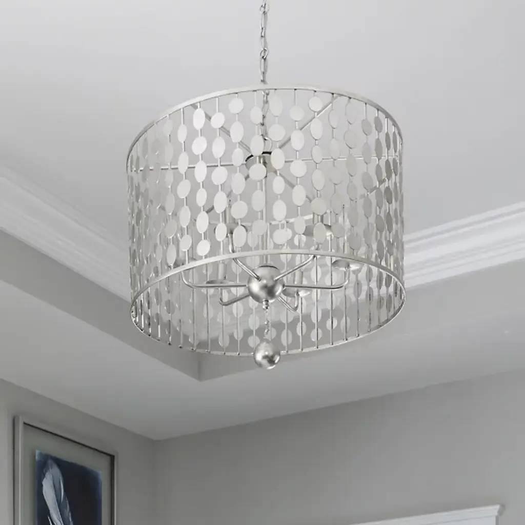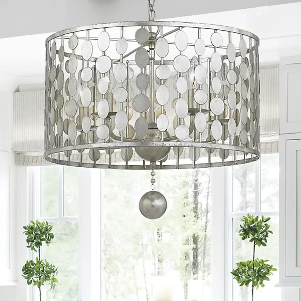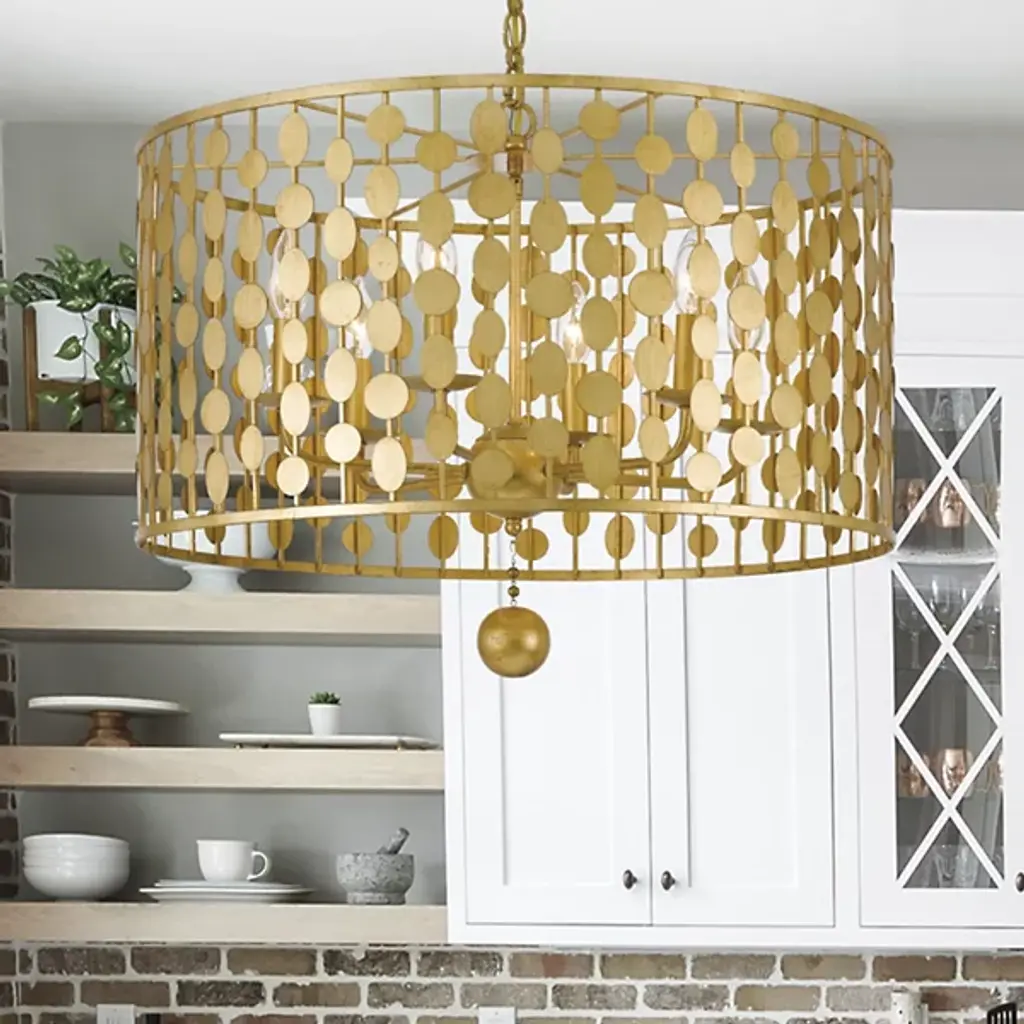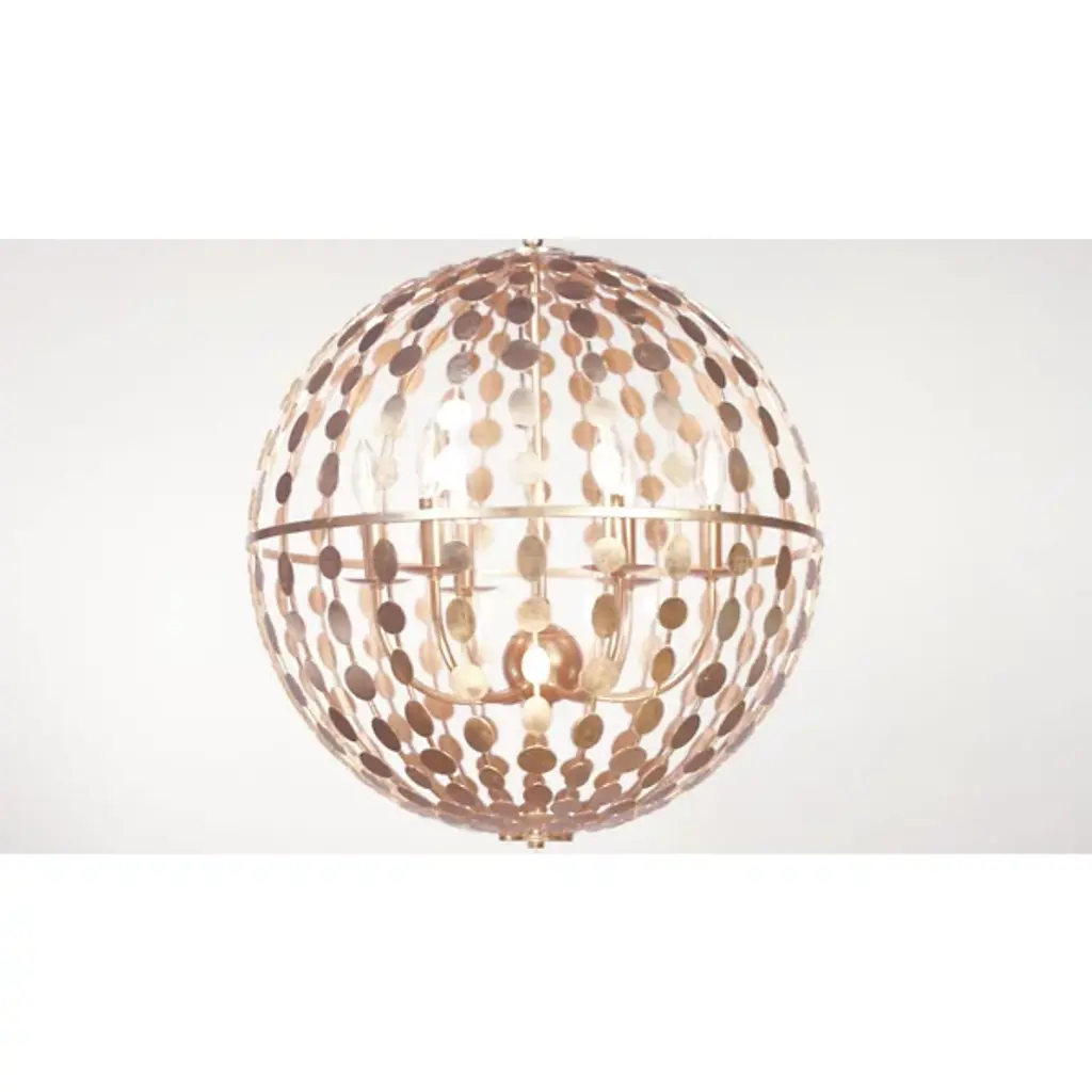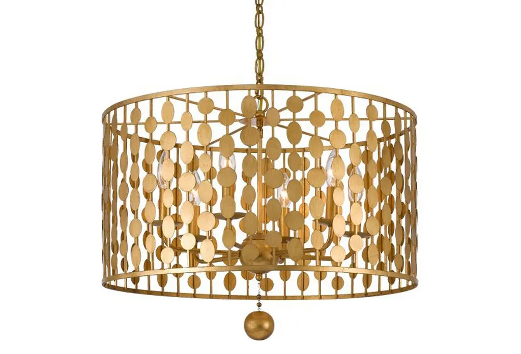 The Crystorama Layla Chandelier brings innovation to the traditional chandelier shape. A series of hand painted lenses are arranged in columns around a circular frame, catching the light beautifully with their metallic finish. A solid ball in the same finish hangs from the middle, mimicking the round shapes and adding the final touch.