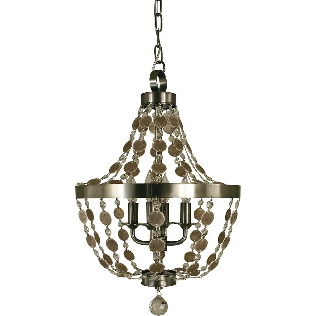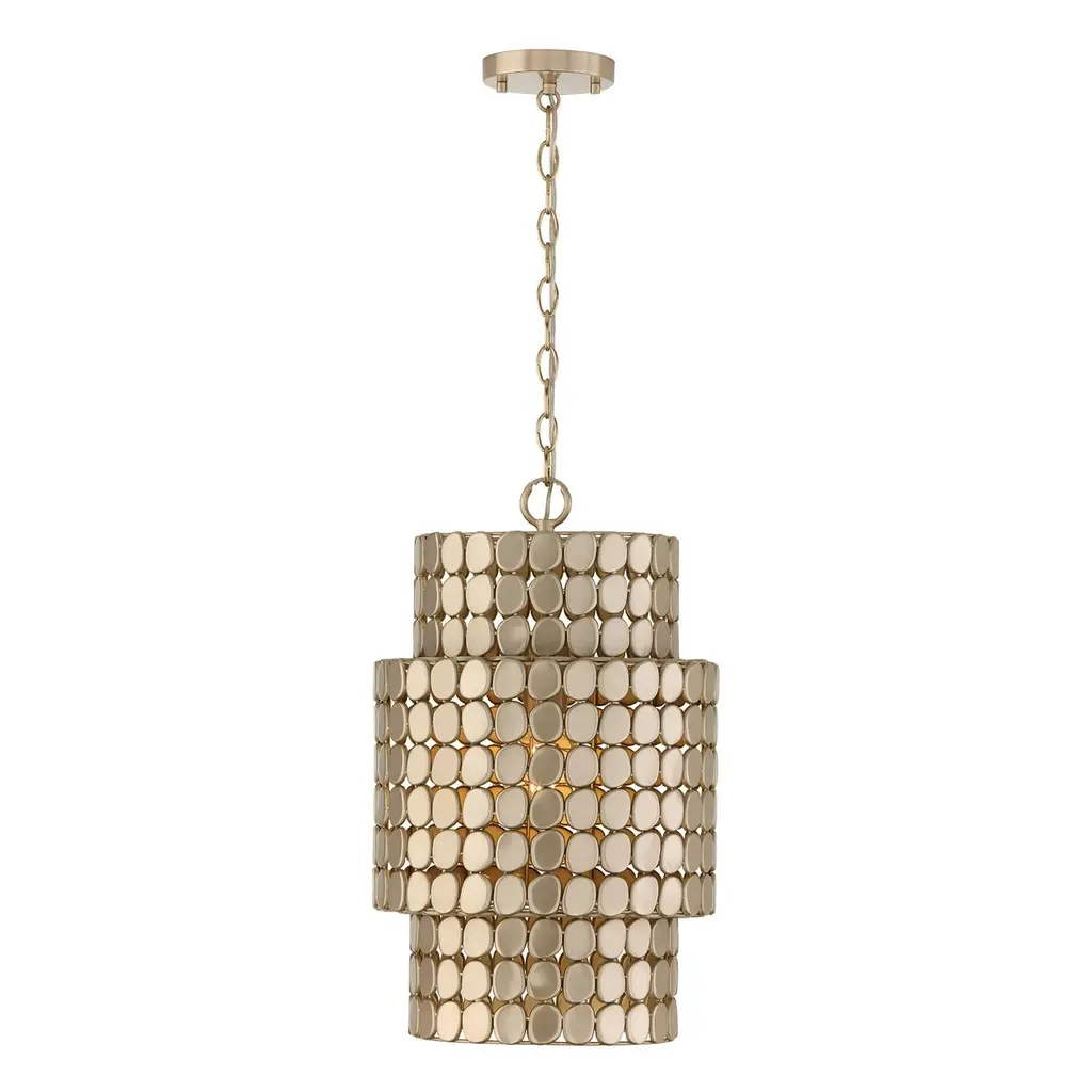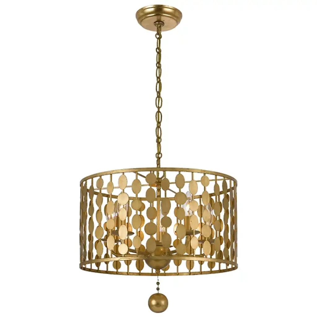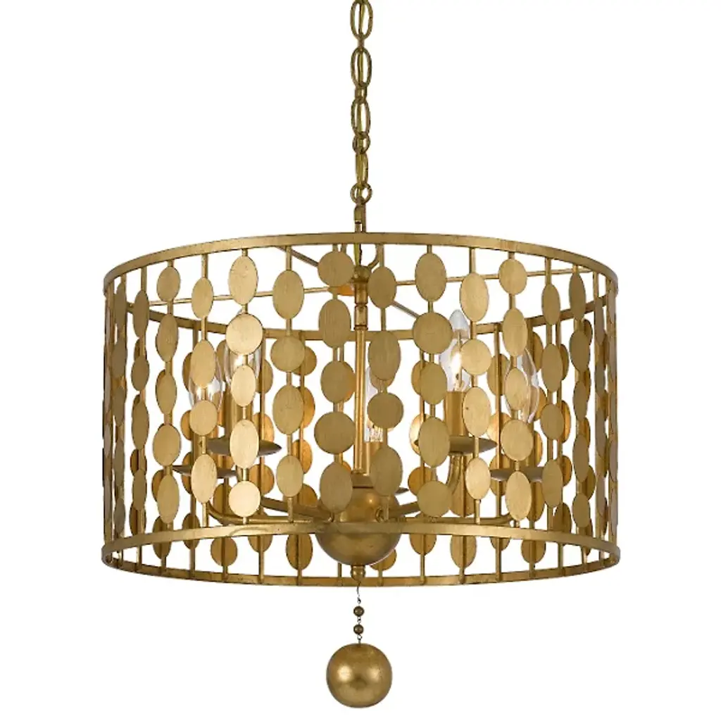 The Crystorama Layla Chandelier brings innovation to the traditional chandelier shape. A series of hand painted lenses are arranged in columns around a circular frame, catching the light beautifully with their metallic finish. A solid ball in the same finish hangs from the middle, mimicking the round shapes and adding the final touch.