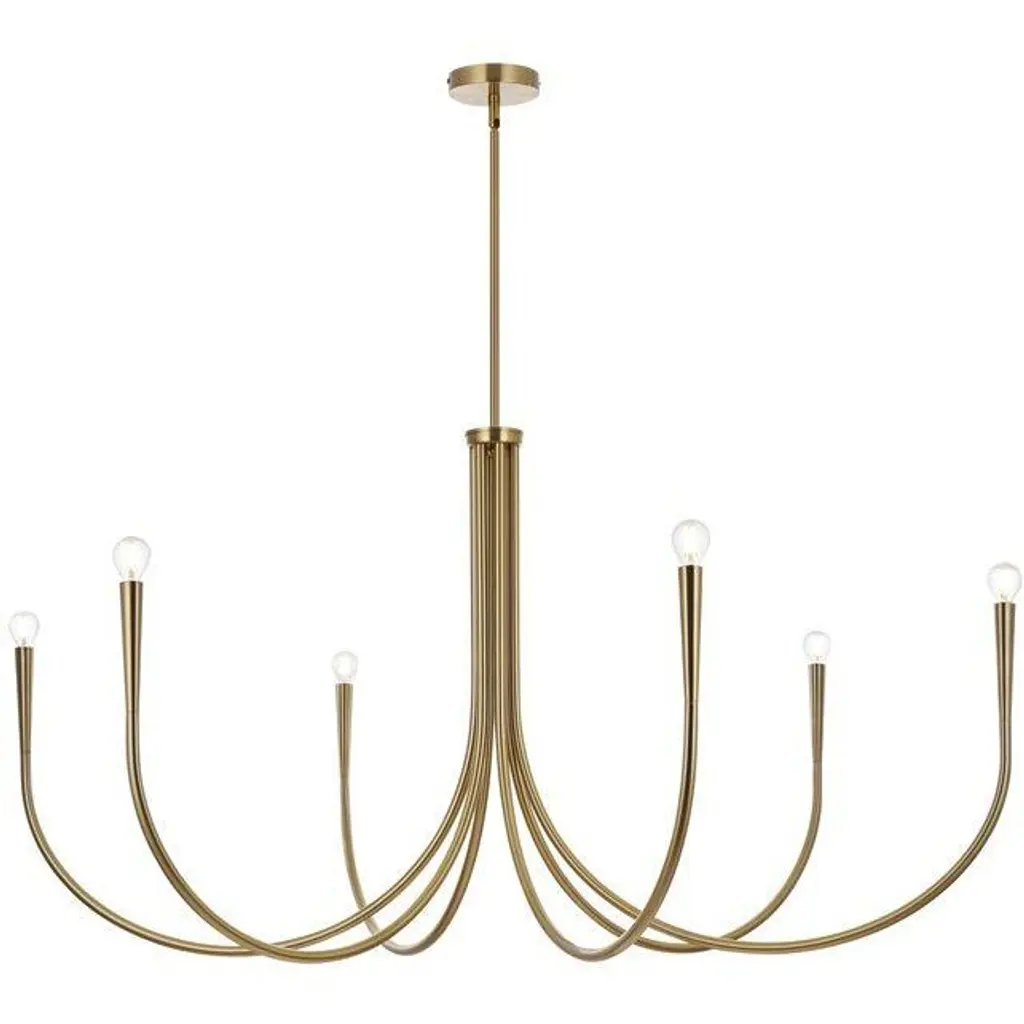 Equipped with six arms, this chandelier provides generous illumination to brighten up any space. Each conical end ensures a focused and balanced distribution of light, creating a warm and inviting atmosphere. The smooth and curved design of the tubular arms creates a gentle, inviting glow that bathes your room in a soft, diffused light. Enjoy a welcoming ambiance that beckons you to unwind and relax. The arms of this chandelier ingeniously stack vertically, forming a stunning display of tubes that adds depth and dimension to the overall design. This unique arrangement sets it apart from traditional chandeliers, making it a true conversation starter. Sloped ceiling adaptable with a durable swivel could be mounted on vaulted or angled ceilings.