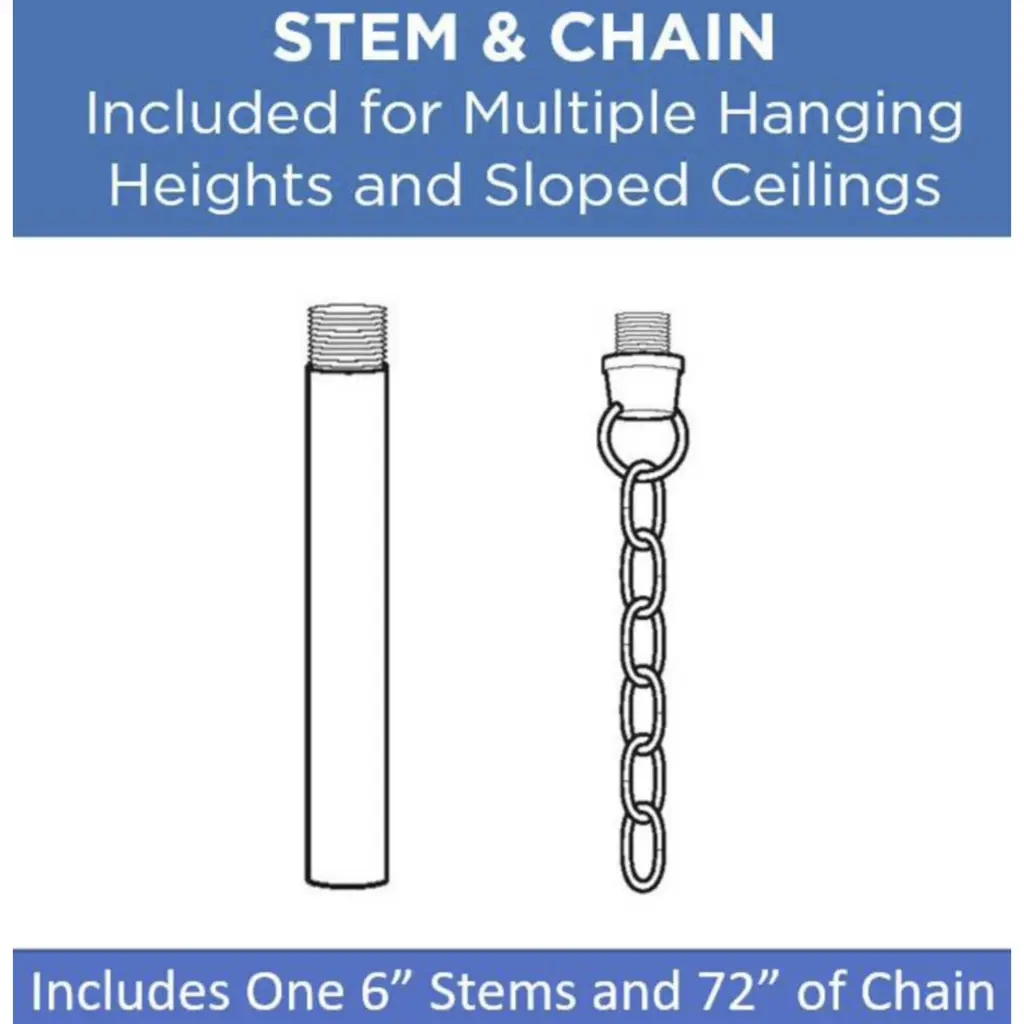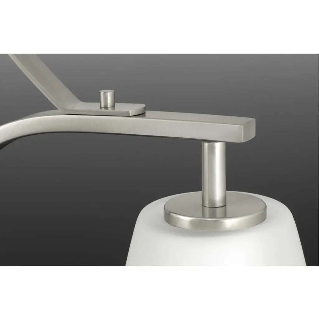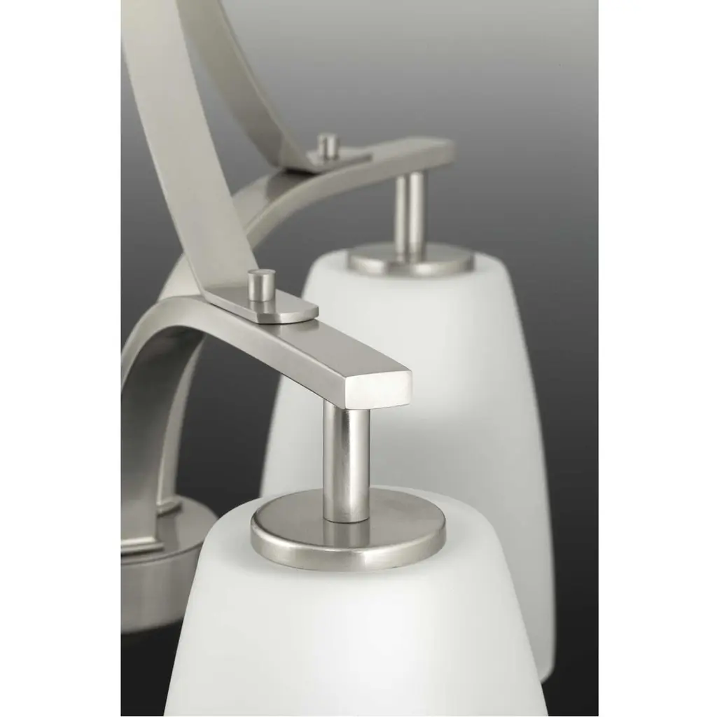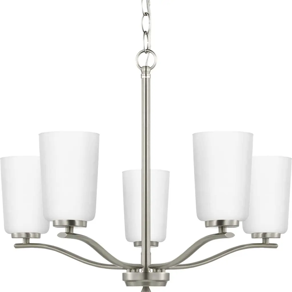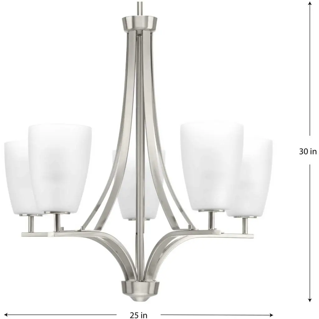 The Leap collection features sweeping arcs that frame tapered etched shades. Glass shades are slightly larger in scale to complement contemporary design trends. The five-light chandelier is finished in Brushed Nickel.