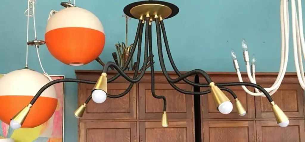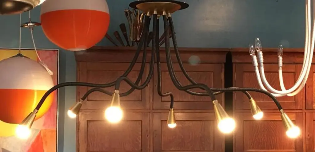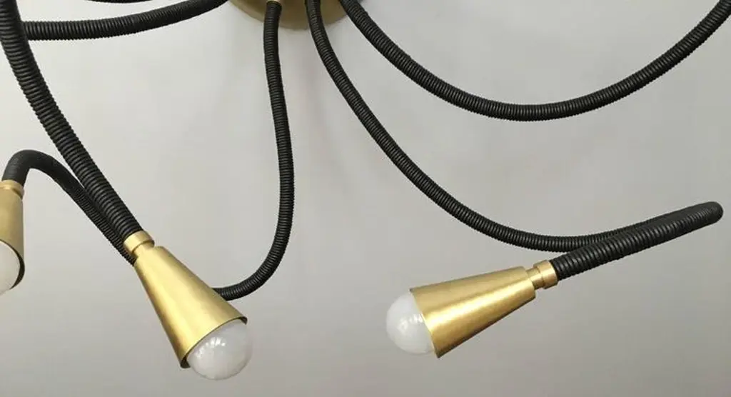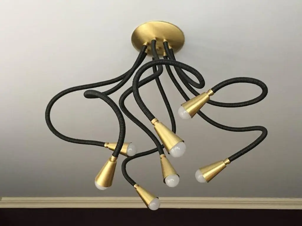 Seven arm soft black leather meander flexible arm ceiling mounted chandelier with brushed brass fittings. Flexible arms allow for endless poses; style it as you wish.Custom colors, sizes, and metal options available.Measures: Arms are 38 inches long; but chandelier measurements depend on how you arrange the arms.Avantgarden Ltd. cultivates unexpected and exceptional lighting, furniture and design. To view items in person please visit our showroom in Pound Ridge, New York.