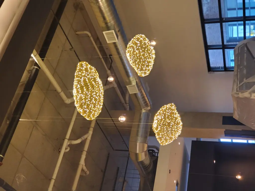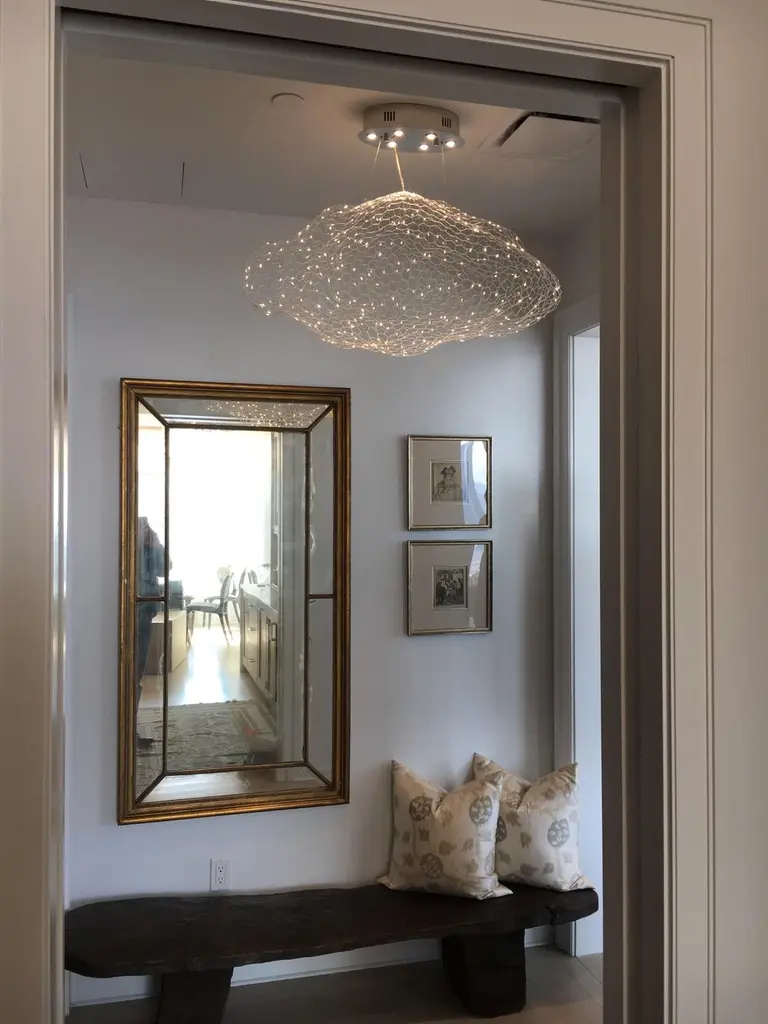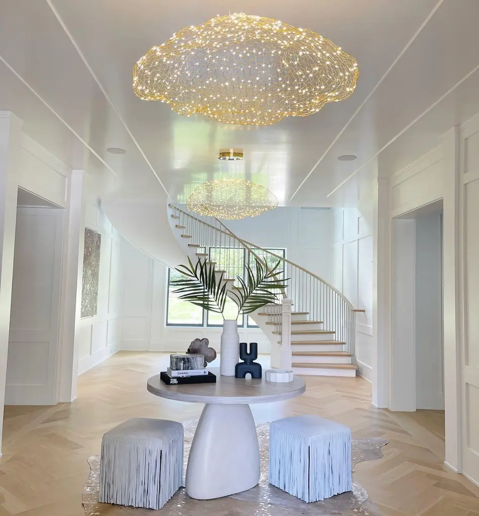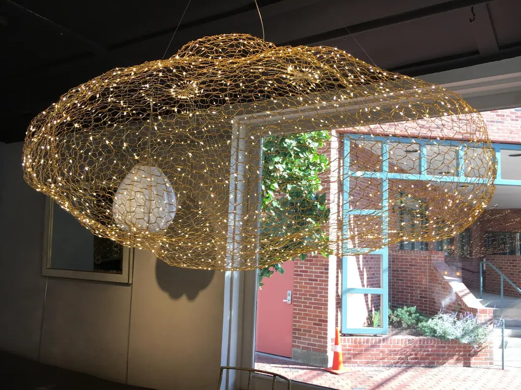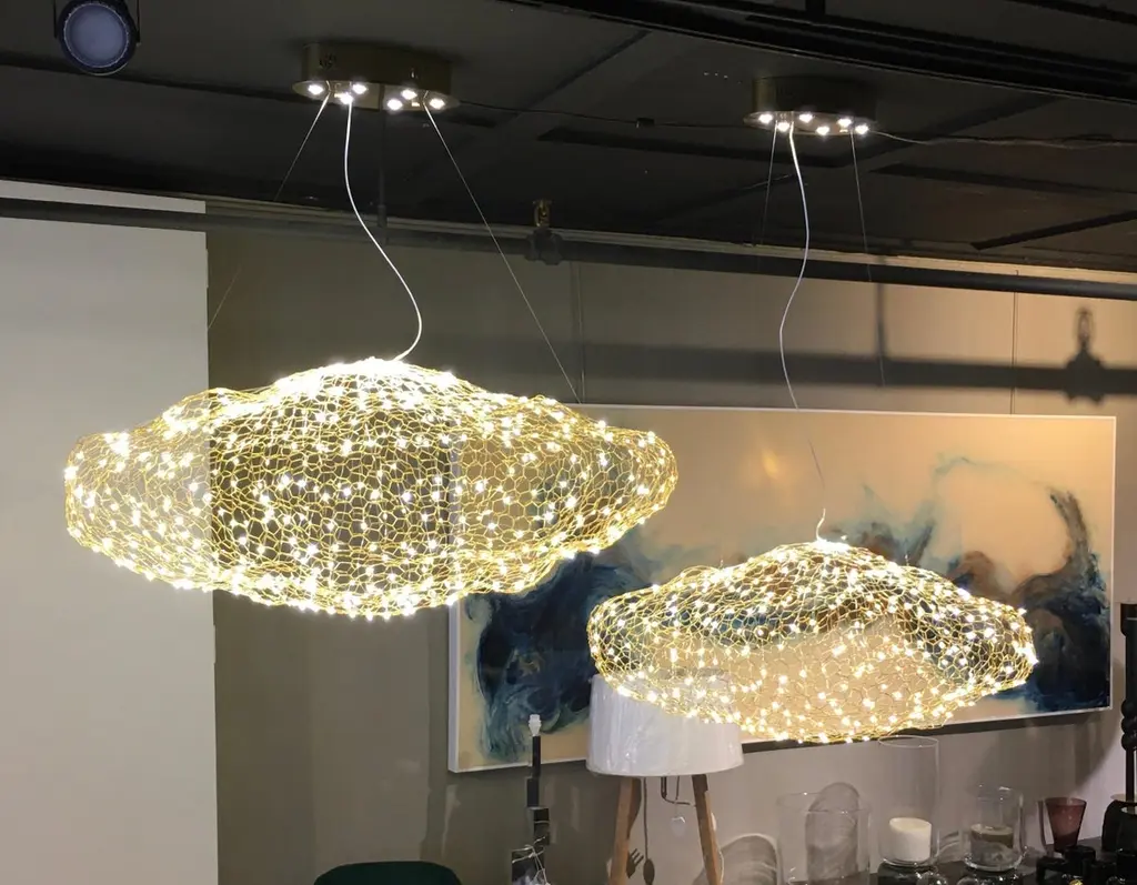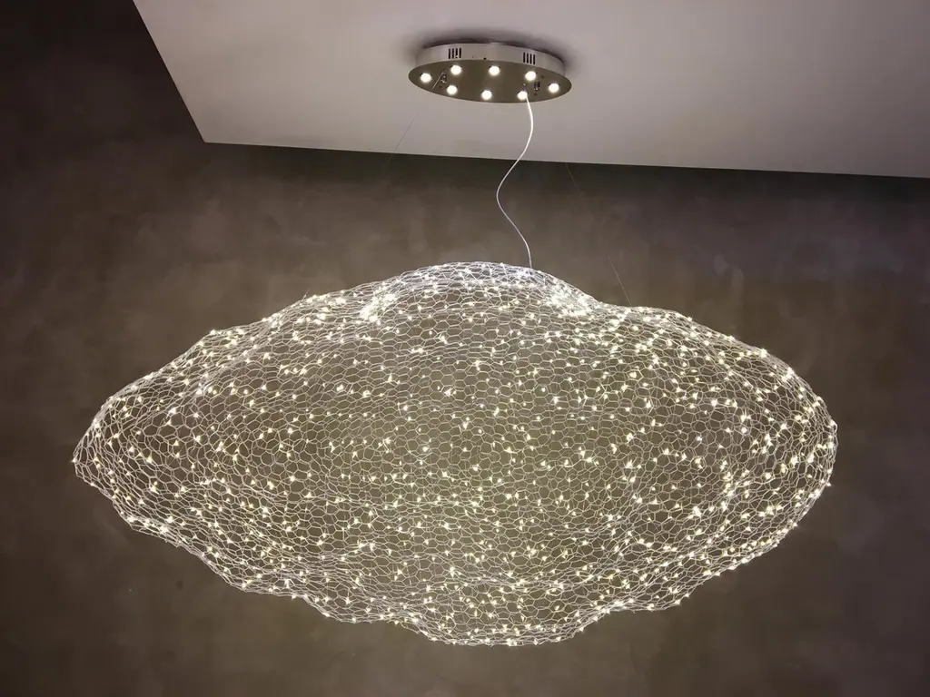 Unique chandelier where hundreds of small LED lights are combined with a handmade wire mesh sculpture shaped like a cloud.Eight LED lights are mounted on the canopy.Dimmable.Finishes: Gold or white. Made in 3 standard sizes(S,M,L).