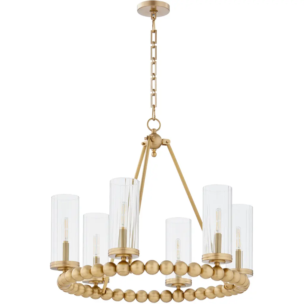 Nestled on four acres in the center of Kansas City, the Lee Boulevard home offers a feeling set apart from the city, which inspires Tamara Day to design this collection. A traditional design with a touch of contemporary through spherical details reflects the Lee Boulevard home's little slice of countryside amidst a sprawling citscape. Modern beaded elements and classic white linen shades offer tranisitional comfort with a luxurious impression. Two chandelier designs, linear pendants, wall mounts, and vanities come in options of matte black or aged brass finishes. Include the Lee Boulevard 6 light ring chandelier in your next home design.