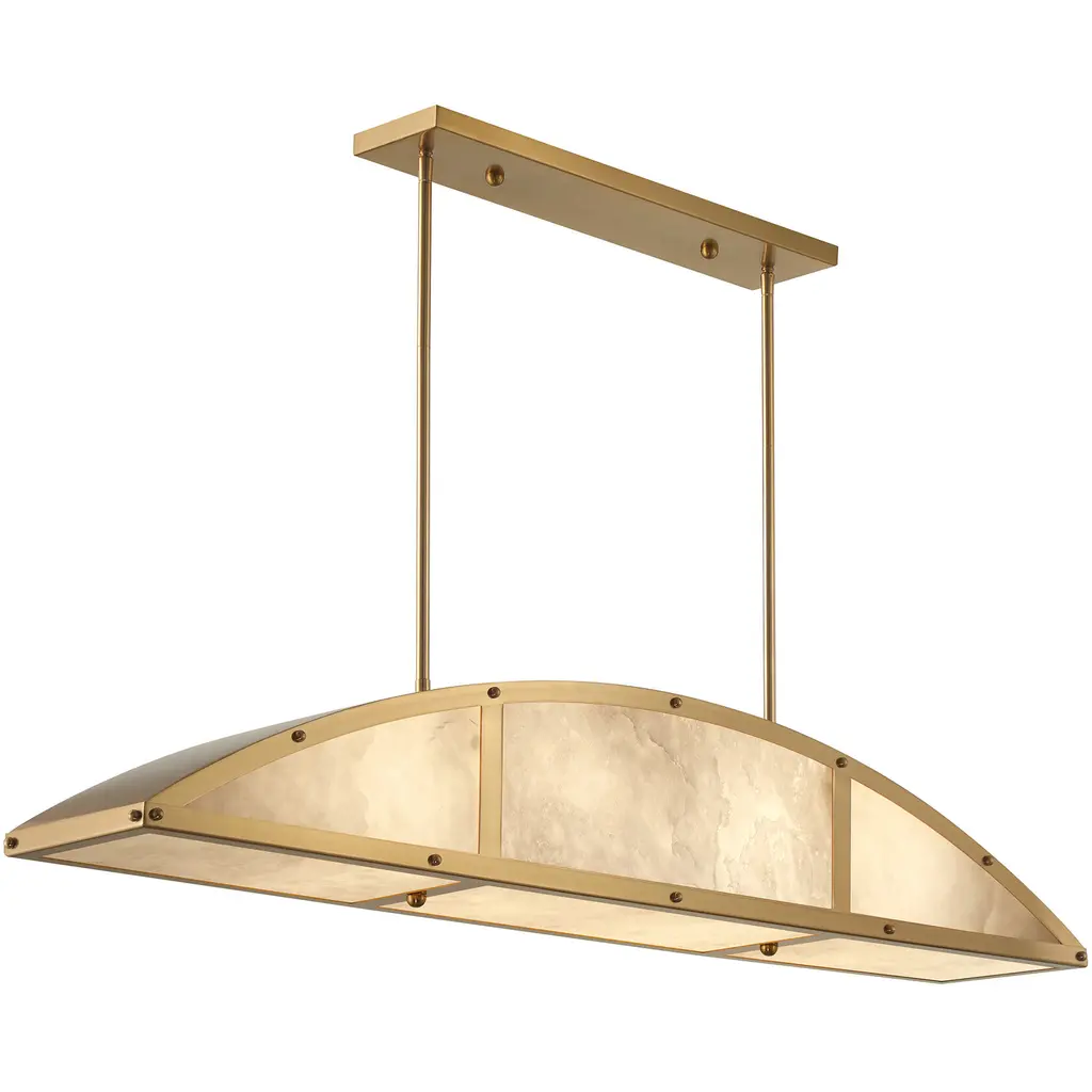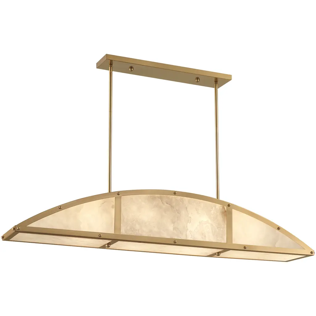 The Savoy House Legacy 4-light linear chandelier was designed by Breegan Jane, an award-winning designer and TV host. Breegan believes that it doesn't get any more luxurious and classic than stone - and with its ethereal warmth and vibrant veining, the panes of natural alabaster on the Legacy are a perfect example of this belief. Textured details recall the structures of high-end range hoods, making this a great choice for lighting standout kitchens. Warm Brass finish. Legacy is 46" in length, 8" in width and has an adjustable height ranging from 8" to 62". Comes with eight 12" downrods and two 6" downrods. Uses four candelabra size bulbs of up to 60 watts per bulb. Bulbs not included.