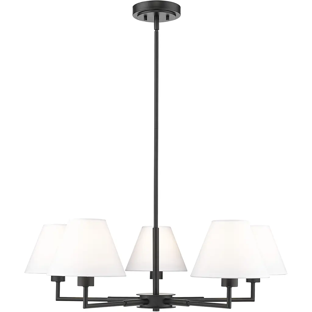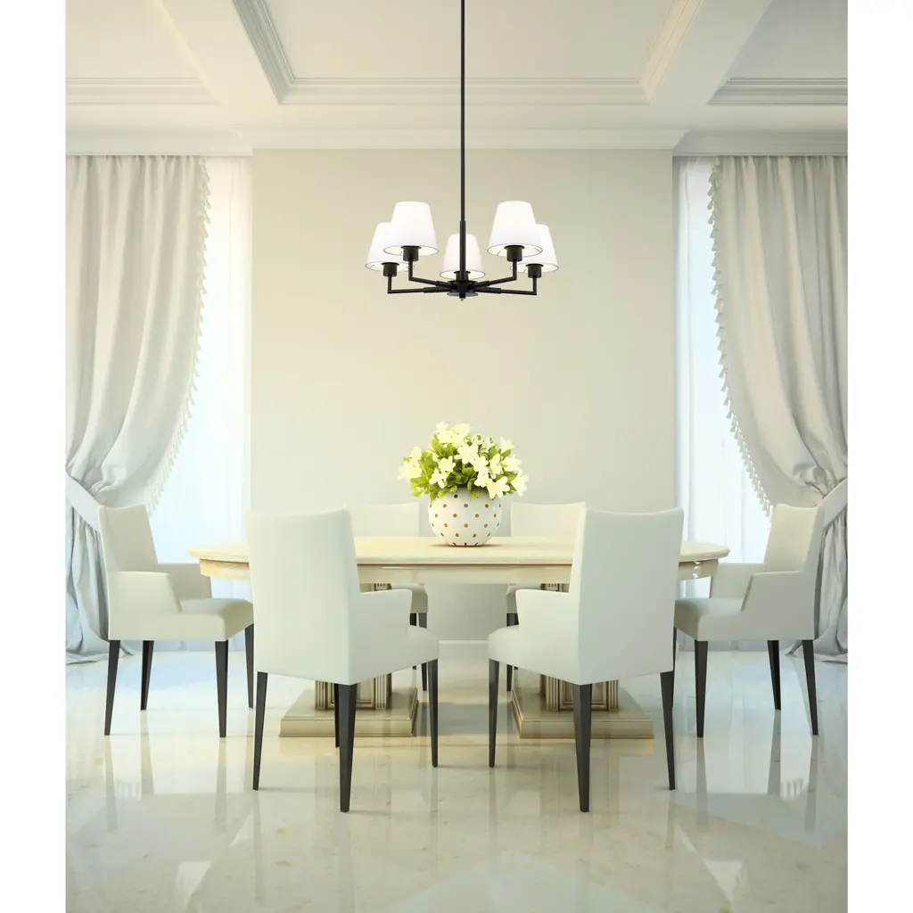 Chic white linen empire shades play into the design flexibility of a modern five-light chandelier. Expertly designed with simplicity at the forefront, the chandelier pairs a cool matte black finish frame with straight suspension and complementary angularity, all capped with conical shades that create the perfect hint of dimensionality for a fixture that looks great everywhere from the dining room to a bedroom dressing area.