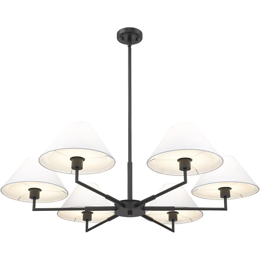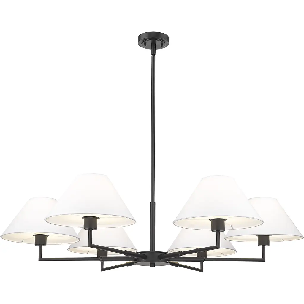 Inject a little modern simplicity into surrounding decor with a stylish six-light chandelier. In a cool matte black finish, this delightful fixture is a flexible option everywhere from your dining room to a master suite, casting warm, bright illumination while instilling radiant elegance. Its six lights are complete with empire shades for a classic touch updated with white linen for light, bright ambiance.