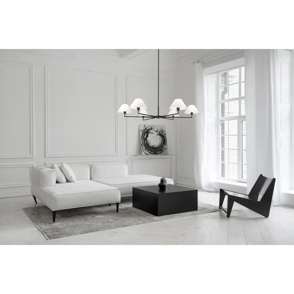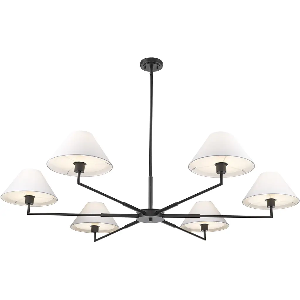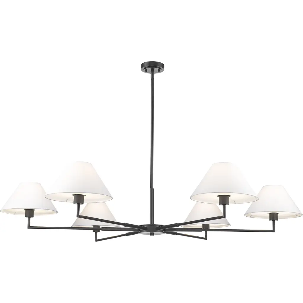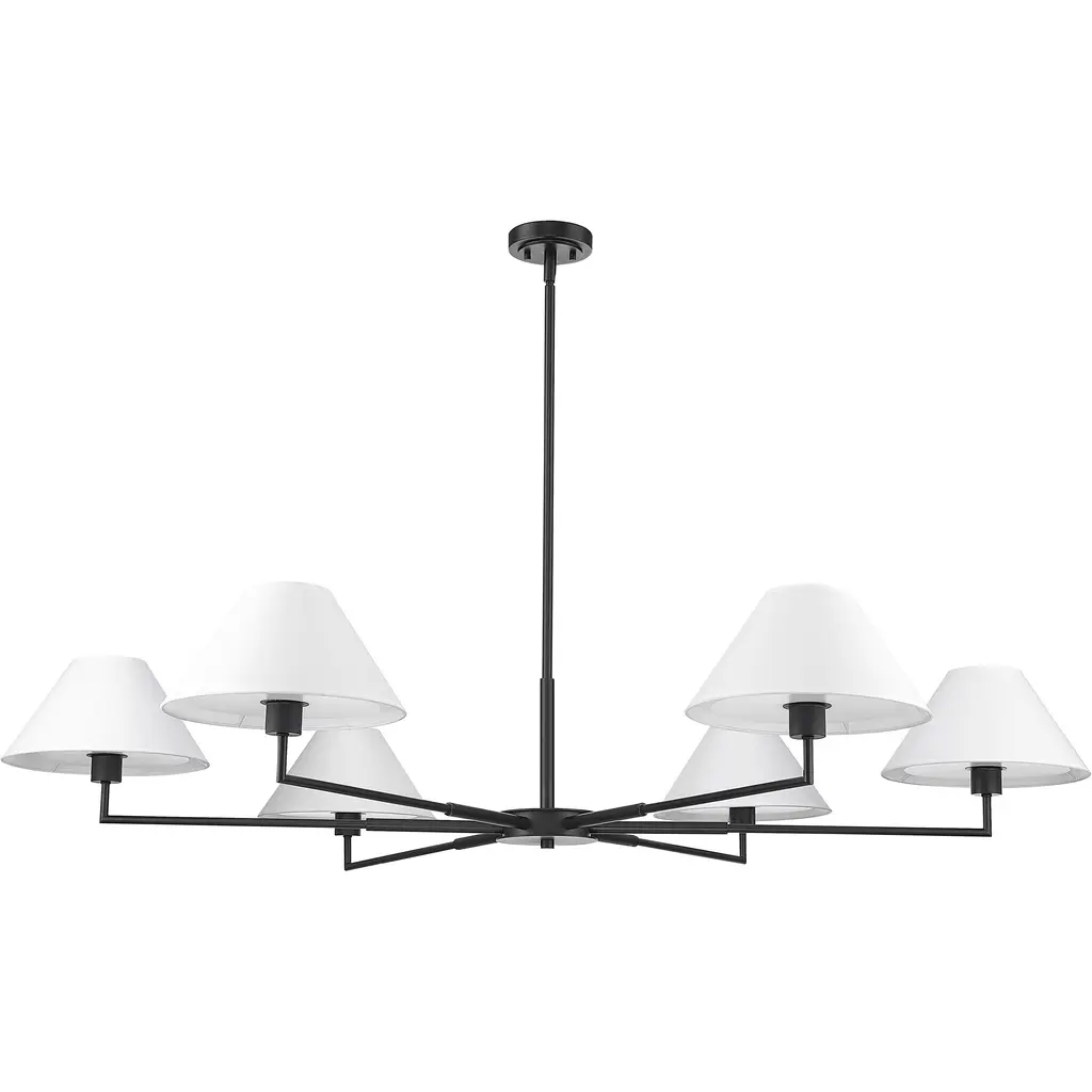 Surrounding decor is instantly elevated with the sleek simplicity of a stylishly modern, wide six-light chandelier. In a cool matte black finish, this delightful fixture is a flexible option everywhere from your dining room to a master suite, casting warm, bright illumination while instilling radiant elegance. Its six lights are complete with empire shades for a classic touch updated with white linen for light, bright ambiance.