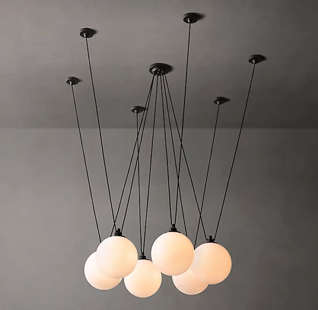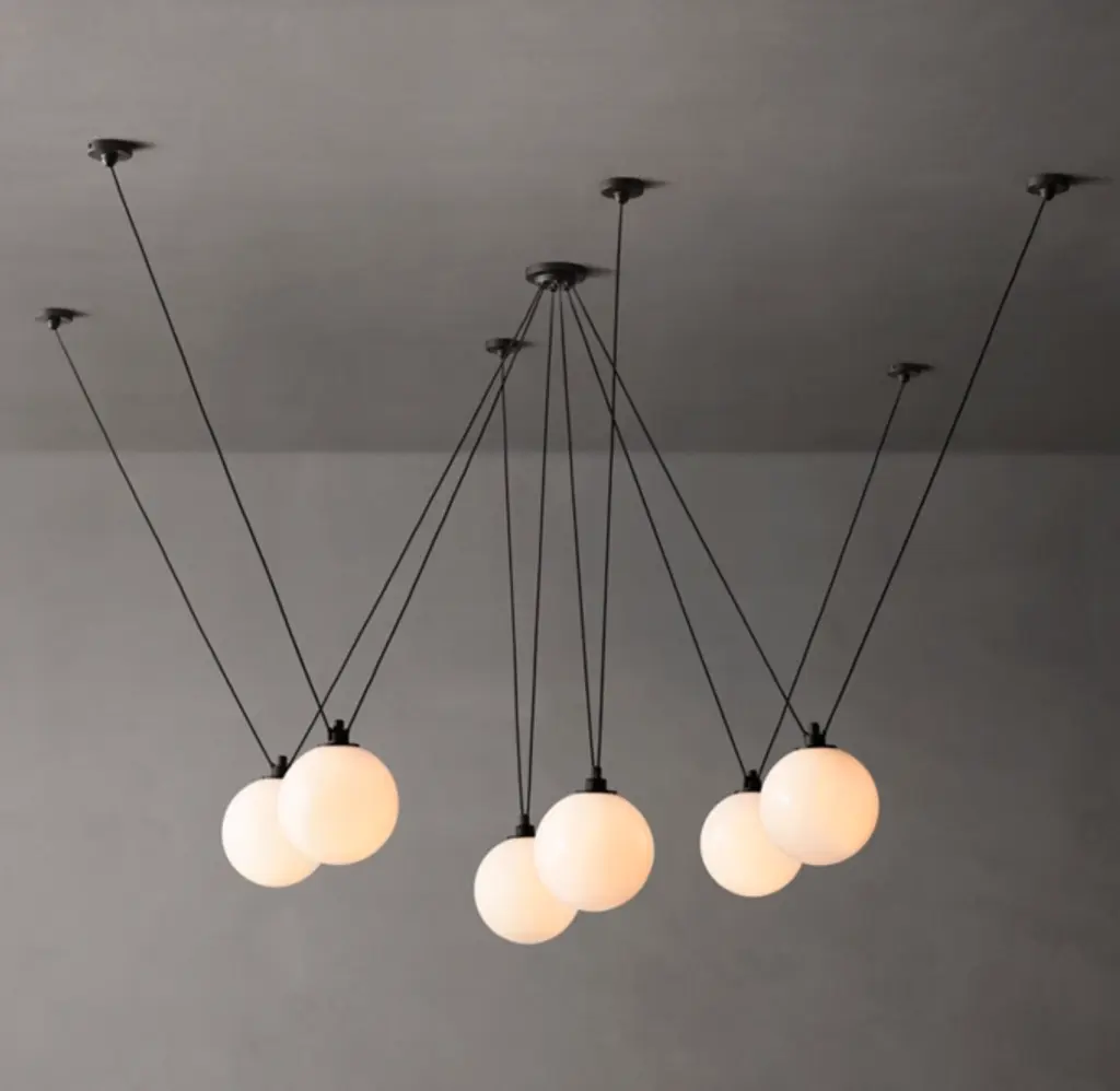 Marked by pure innovation of form, Les Acrobates de Gras by French designer Bernard-Albin Gras captures the utilitarian beauty of industrial design. Handblown spheres of milk glass are individually suspended from fabric cables, which can be arranged in multiple configurations to create a dynamic sense of movement and rhythm