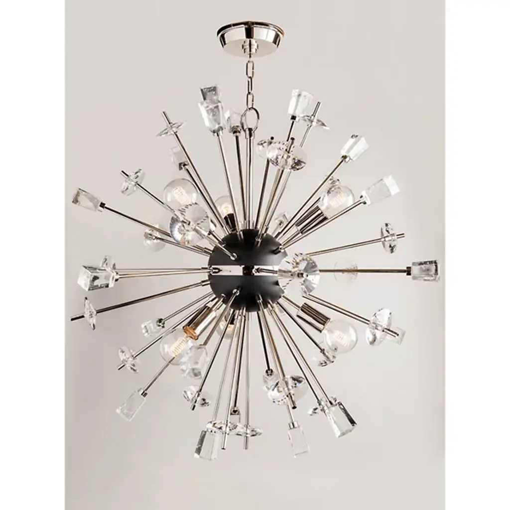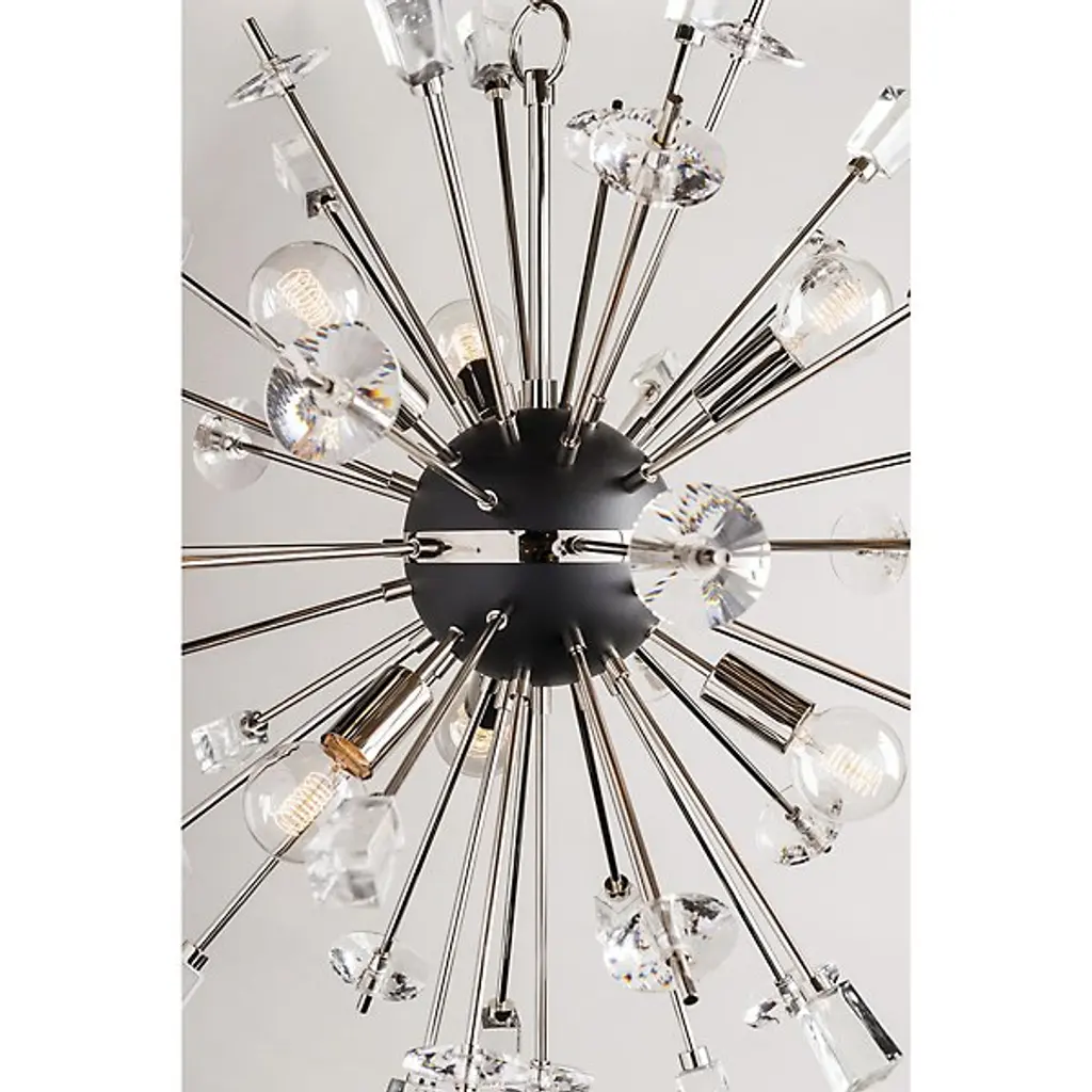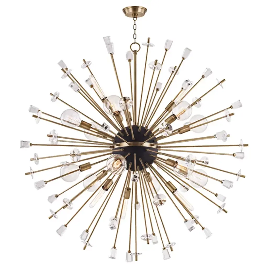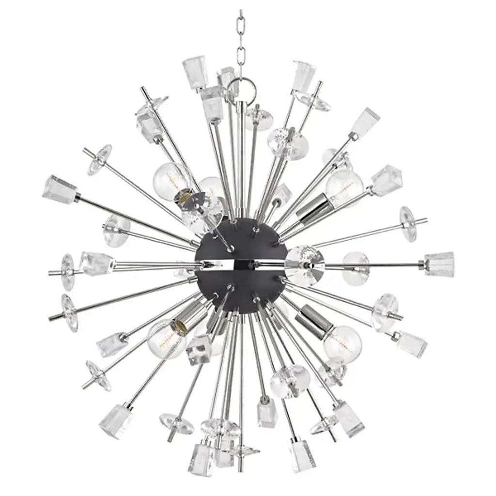 The Hudson Valley Lighting Liberty Chandelier features arms topped with cut-crystal discs and hand-crafted glass that refract light from neighboring exposed bulbs. A Matte Black core adds contrast and helps to accentuate the large number of arms this fixture uses in its design. Height adjustable at installation and dimmable to assist with your freedom of expression.