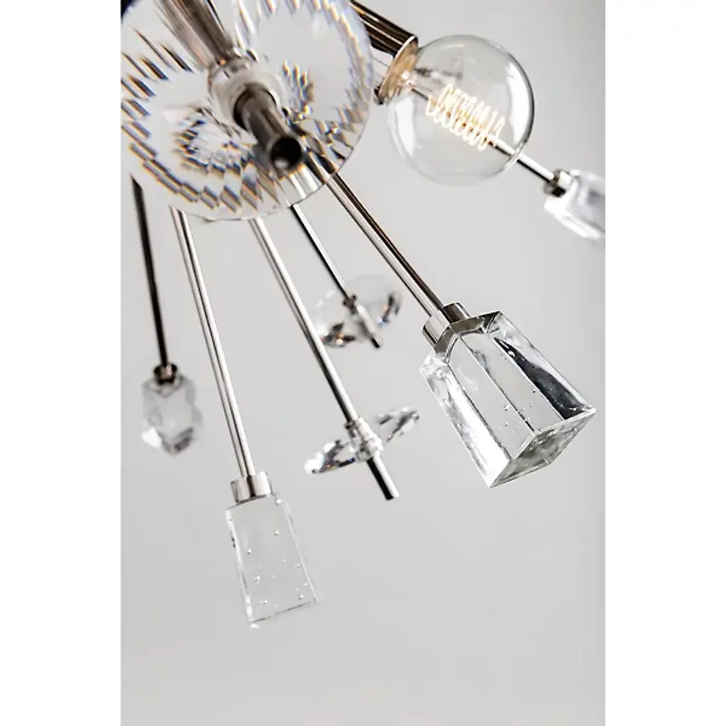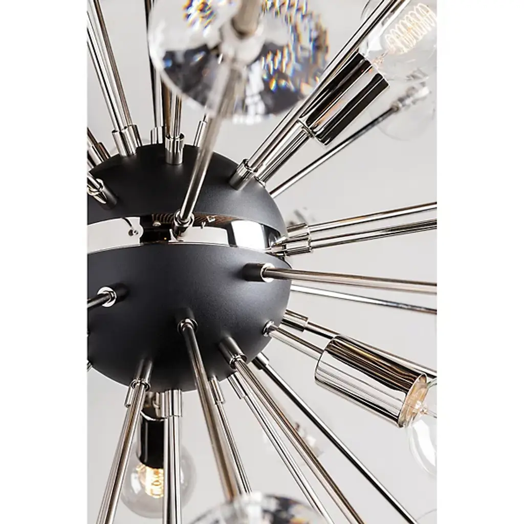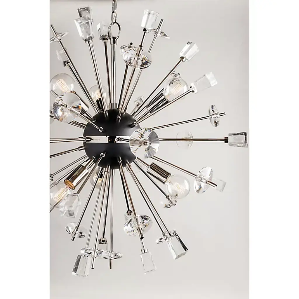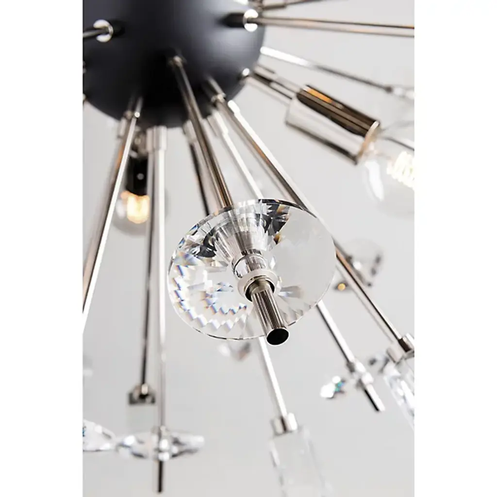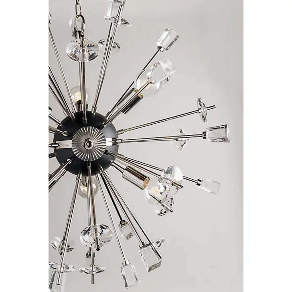 The Hudson Valley Lighting Liberty Chandelier features arms topped with cut-crystal discs and hand-crafted glass that refract light from neighboring exposed bulbs. A Matte Black core adds contrast and helps to accentuate the large number of arms this fixture uses in its design. Height adjustable at installation and dimmable to assist with your freedom of expression.