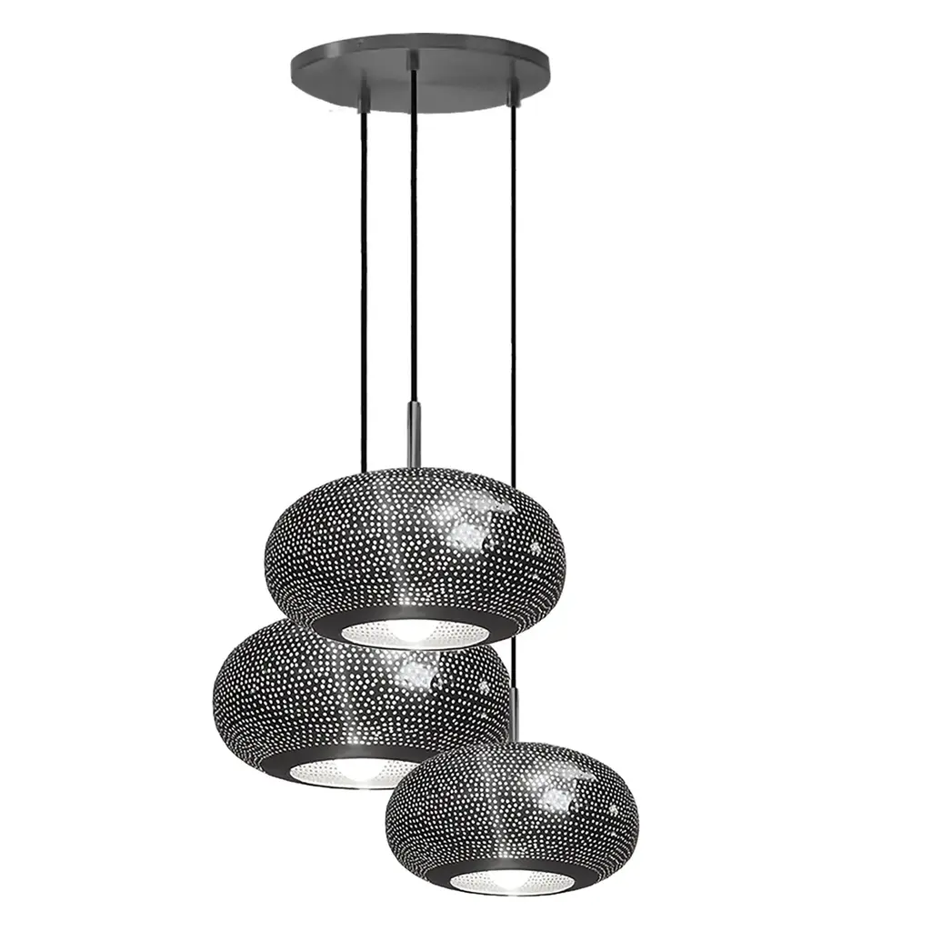 Introducing the ultimate in luxury lighting with the Lila large unique chandelier. Make a statement with this oversized chandelier that is perfect for modern commercial or high-ceilinged spaces. This extra large pendant lighting fixture features classic Moroccan ornamental design with a modern twist. The three oval shades of the extra large pendant lighting are handcrafted by master artisans in Marrakech using locally sourced metal. The hand-pierced metal sides of this unique light fixture create a focused stream of light at the base while diffusing light throughout the room. , This extra large pendant light is UL listed, making it safe and reliable for any commercial or residential space. Ideal for hallways, dining rooms, or entryways, the large modern large chandeliers are a perfect match for any modern or unique decor. The three shades hang from the ceiling in a stunning cascading pattern, adding an extra layer of luxury. The chandelier is available in multiple metal finishes and comes with an adjustable cord to fit any ceiling height. At 54kibo, we take pride in offering only the finest luxury lighting products, and these large unique chandeliers are no exception. Don't settle for ordinary lights - make a statement with our big pendant lights.