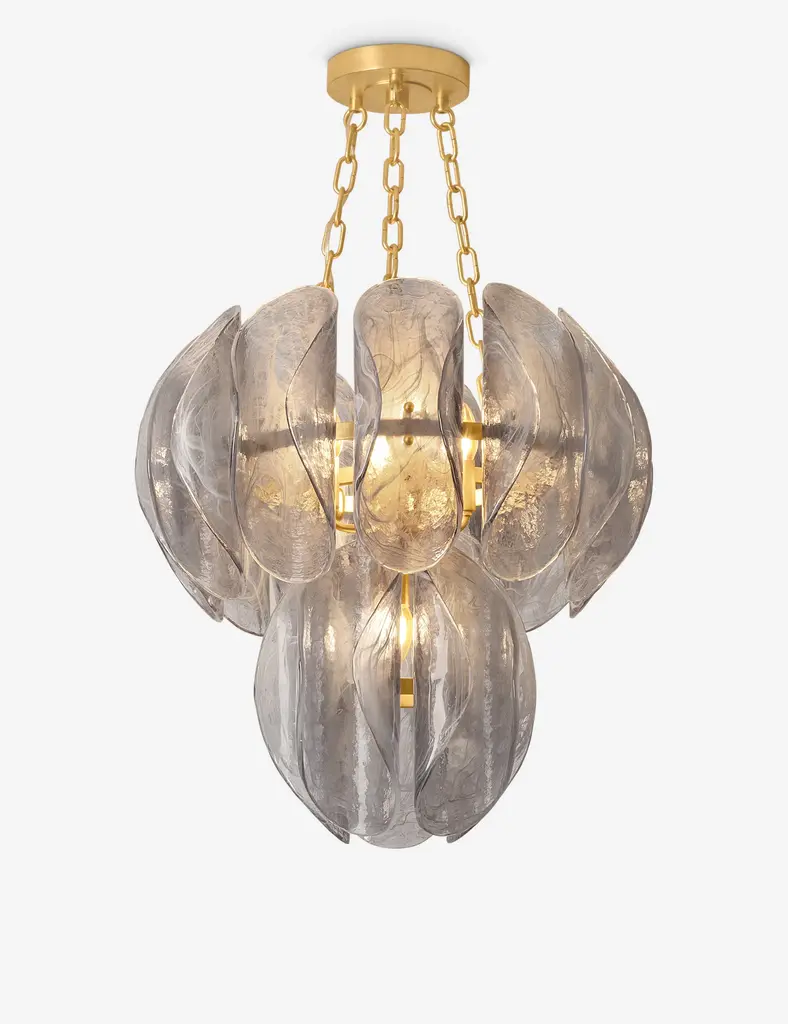 Lilavati draws from nature's fluid forms with a bold, handblown design. Curved pieces of smoked glass shape this dramatic silhouette for statement ceiling lighting. Hang this chandelier above a dining table or in an entryway for a sculptural focal point.
