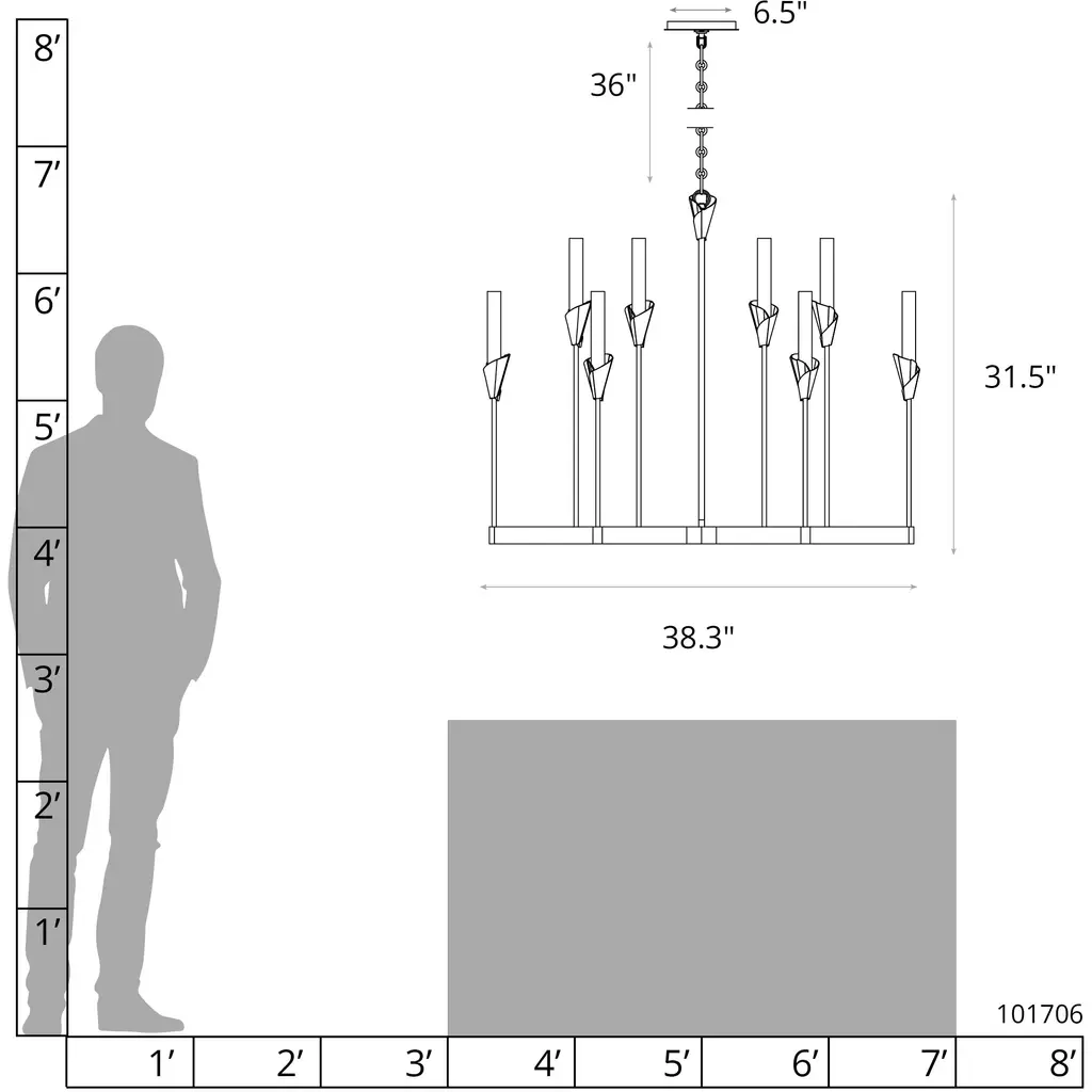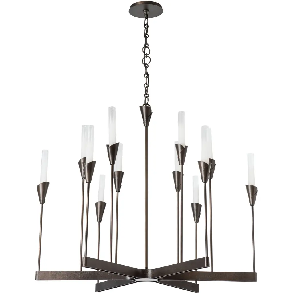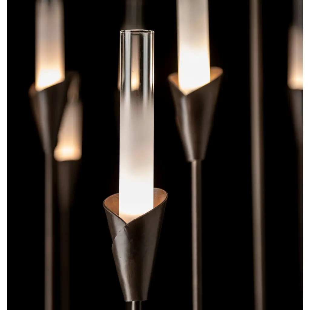 This botanically inspired lighting fixture resembles a field of lilies standing tall. This 12 light, two-tiered chandelier with clean lines features hand-forged tall "cups" that hold vertical gradient-frosted cylindrical glass tubes housing the light within. Paul Marr Hilliard designed the cup's shape to resemble a lily's receptacle, as if giving life to the light.