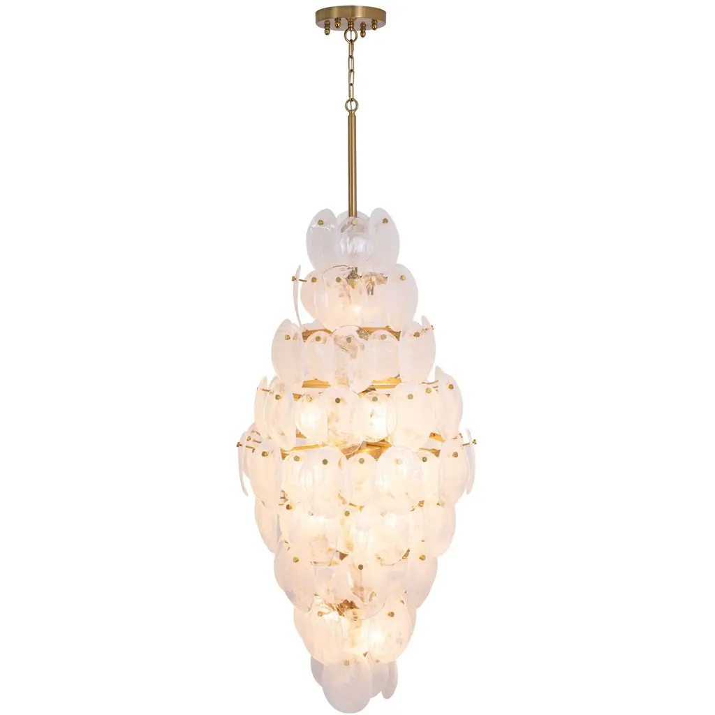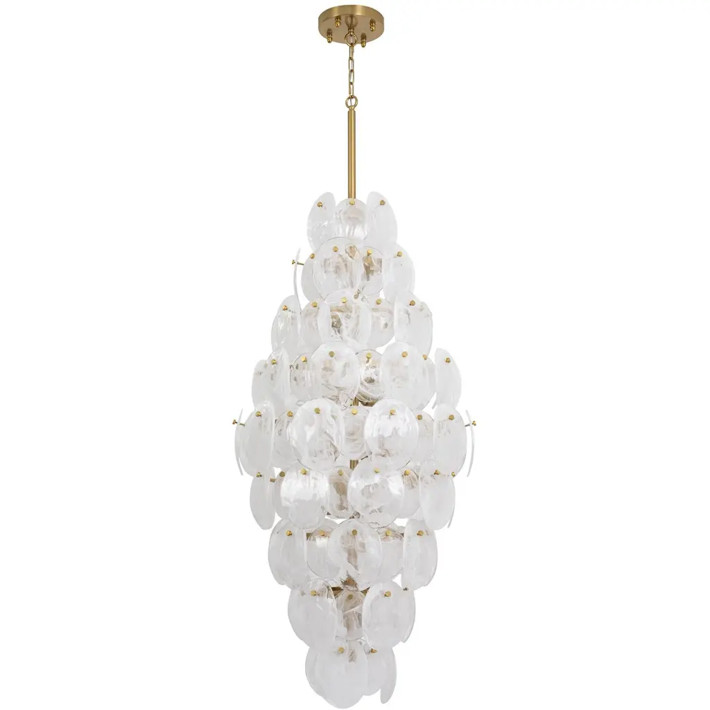 The Lily Collection exudes a delicate charm, captivating with its Murano-style glasswork in a wispy white finish. Each circular panel dances with subtle elegance, reflecting light in a manner that feels both luxurious and inviting. Complemented by a brushed brass frame, the design radiates a poetic blend of elegance and allure. This chandelier casts a spell of enchantment, illuminating your space with a touch of dreamy opulence. An amazing statement for any foyer or entry way.