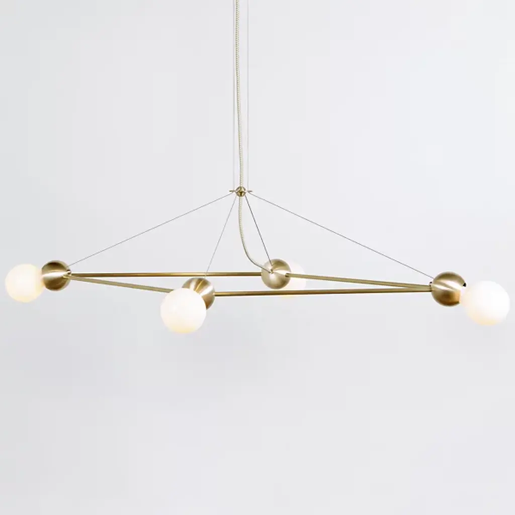 An exciting blend of simple geometry and artistic elegance creates a sculptural drama of celestial sights. The Lina 04-Light Diamond Chandelier by Rosie Li Studio is part of the Lina collection. Rosie Li uses rounded joints made of brass to outline a diamond-shaped structure formed by interconnected brass rods. Supported by minimal cable suspension, the exposed light bulbs placed in each corner of the structure give an impression of brilliant lights floating in the air. This piece of art is assembled in the designer's studio in Brooklyn, NY and is made to order.