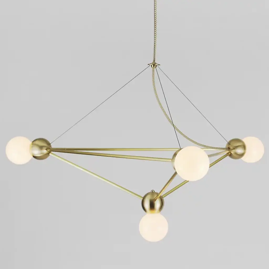 A harmonious geometric arrangement lends a three-dimensional uplift to interior spaces. Part of the Lina collection, the Lina 04-Light Large Pyramid Chandelier by Rosie Li Studio exudes structural simplicity of pared-down forms found in the works of designer Rosie Li. Trained in the classics, Rosie Li achieves a visually pleasing composition formed using brass rods and rounded brass joints. The pyramidal shape takes semblance of a molecular structure with exposed light bulbs on each brass joint. Together, this chandelier shines with a delicate glow and creates a refined atmosphere. This masterpiece is made to order and assembled in Rosie Li's studio in Brooklyn, NY.