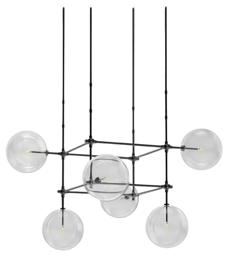 Bring a modern artisanal aesthetic to your home décor with the Lina 08 Cube Chandelier by Rosie Li Studio. Designed by Rosie Li, this light fixture is a geometrical feat. A cube-shaped frame of fine steel boasts brass spheres that provide foundations for luminous globes. These globes are lit by way of LEDs that bring visibility to your surroundings with ease. Fine cables keep your chandelier properly balanced as it suspends effortlessly in midair.