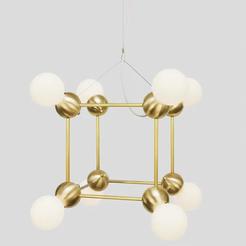 Bring a modern artisanal aesthetic to your home décor with the Lina 08 Cube Chandelier by Rosie Li Studio. Designed by Rosie Li, this light fixture is a geometrical feat. A cube-shaped frame of fine steel boasts brass spheres that provide foundations for luminous globes. These globes are lit by way of LEDs that bring visibility to your surroundings with ease. Fine cables keep your chandelier properly balanced as it suspends effortlessly in midair.