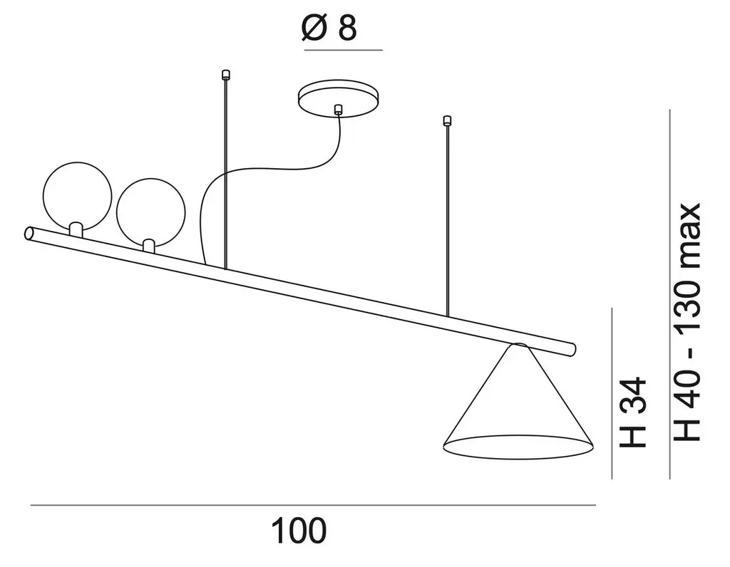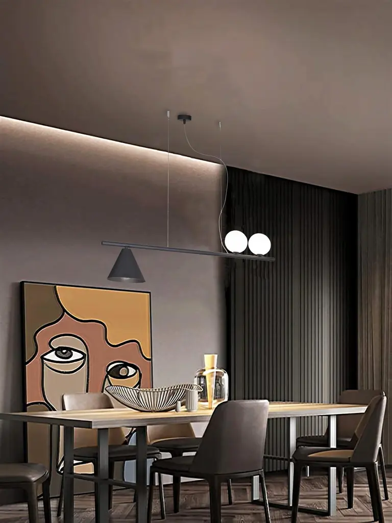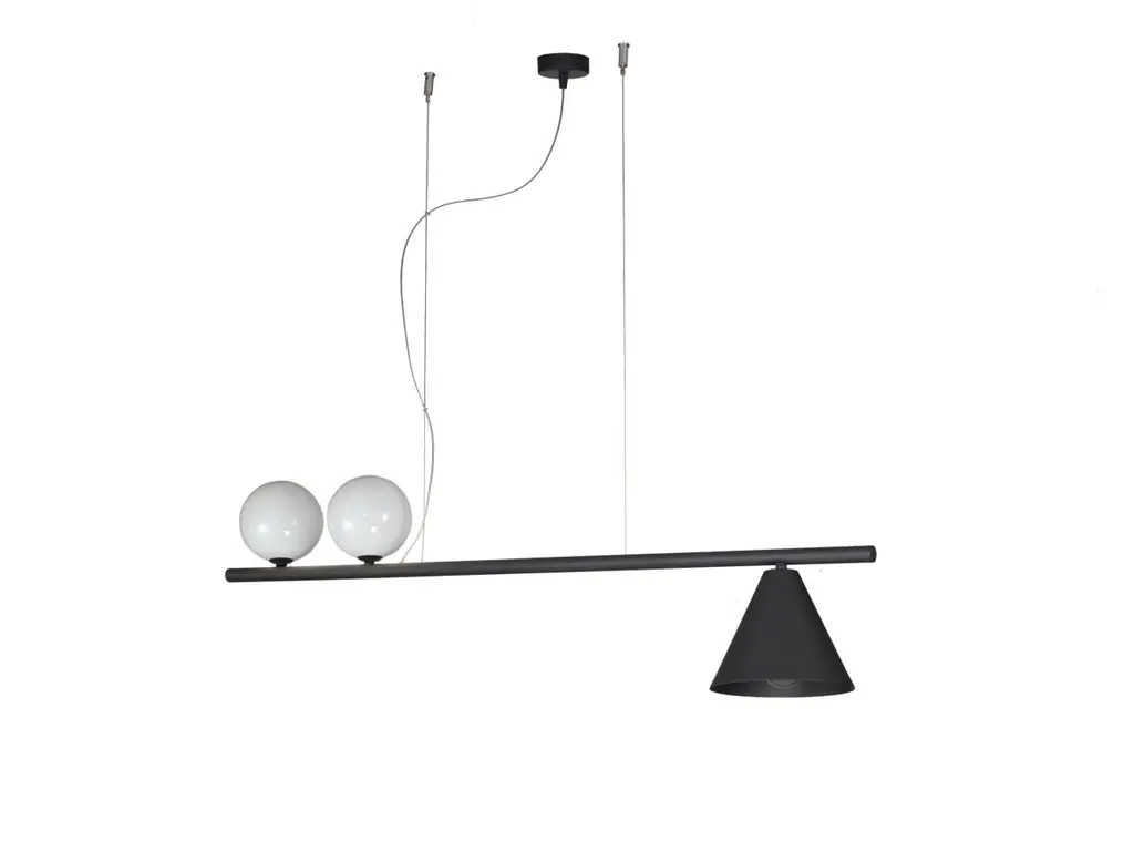 Italian linear suspension chandelier with black color metal frame and white opaline glass globes / Made in Italy by Fabio LtdLength: 39.5 inches / Width: 7 inches / Height: 13.5 inches plus adjustable cables and canopy3 lights / G9 type / max 25W eachOrder only / This item ships from ItalyOrder Reference #: FABIOLTD C877 WHITE