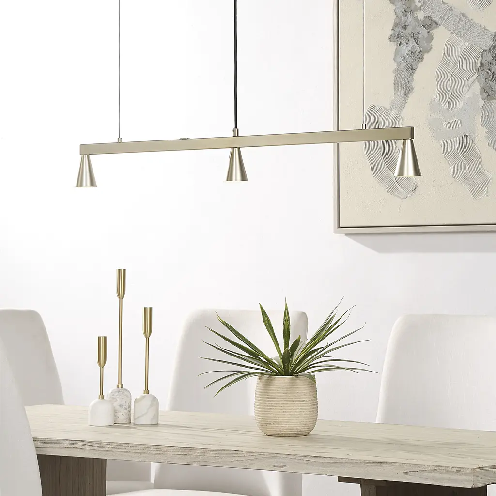 Upgrade your home decor with the stunning Linea 42" Wide 3-Light Chandelier in Champagne. Featuring a sleek plated finish and high-quality iron construction, this chandelier is built to function while adding a subtle touch of elegance to any room. Its hardwired installation ensures reliable, integrated performance while seamlessly connecting with standard G9 sockets. The champagne-colored finish seamlessly blends with different color schemes, making it an excellent choice for any decor style. With three lights, this chandelier provides ample light and a warm, inviting atmosphere. Perfect for any space, the Linea 42" Wide 3-Light Chandelier is sure to elevate your home's aesthetic.