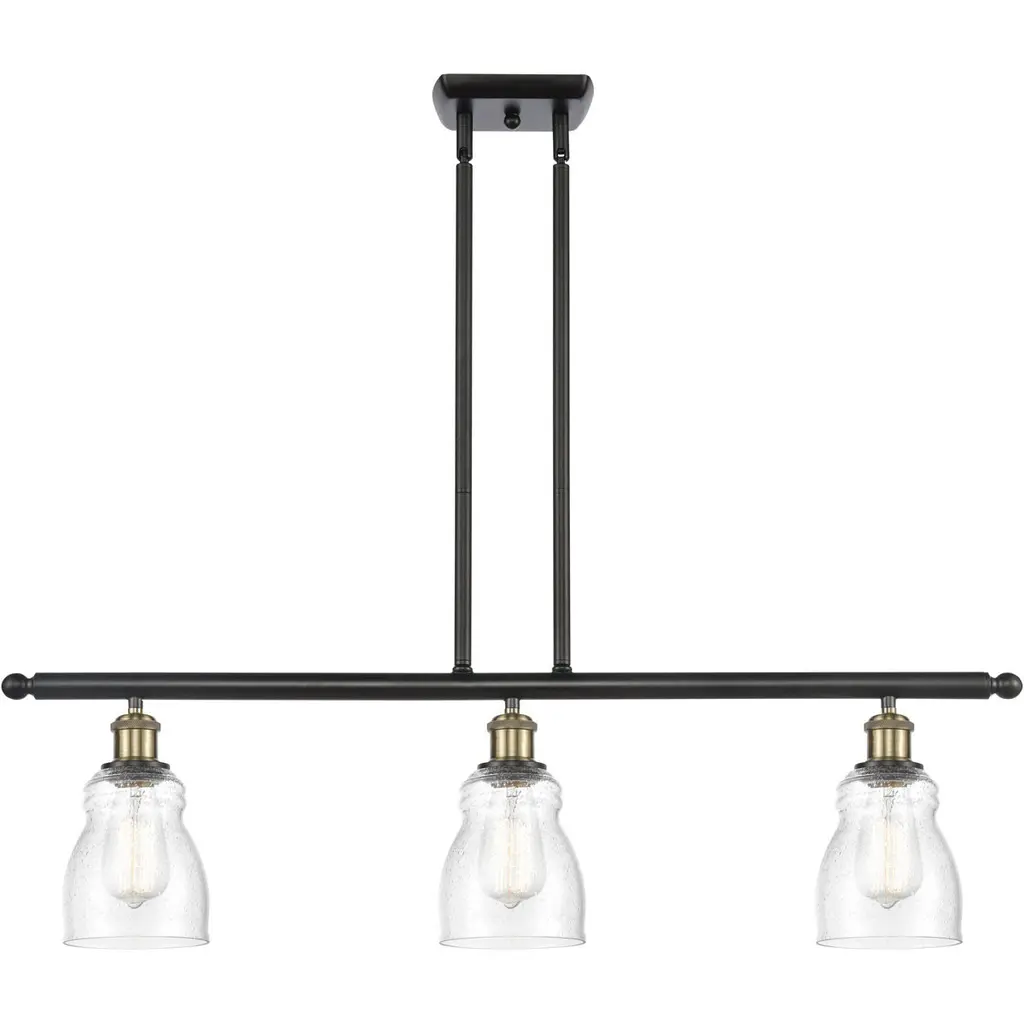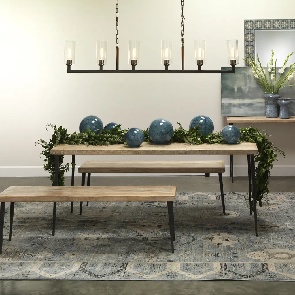 A modern take on a classic torchier, this chandelier telegraphs timeless elegance. Suspended by chain-link hardware, the linear metal frame features six clear blown glass shades. The versatile hanging fixture suits settings from classic to contemporary and is perfect in an entryway or placed above your dining table or kitchen island.