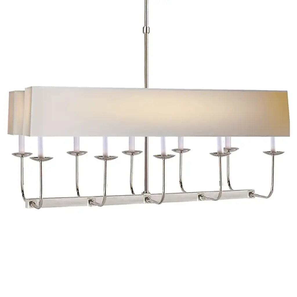 Visual Comfort Signature, formerly known as Visual Comfort,'s Linear Branched Chandelier features optional shades so you can decide the overall light story of a room. The Natural Paper shade provides an evenly diffused warm light, or go topless to add a little extra sparkle. With a clean metallic finish, the Linear Branched Chandelier is cool convertible with the perfect amount of changeability.