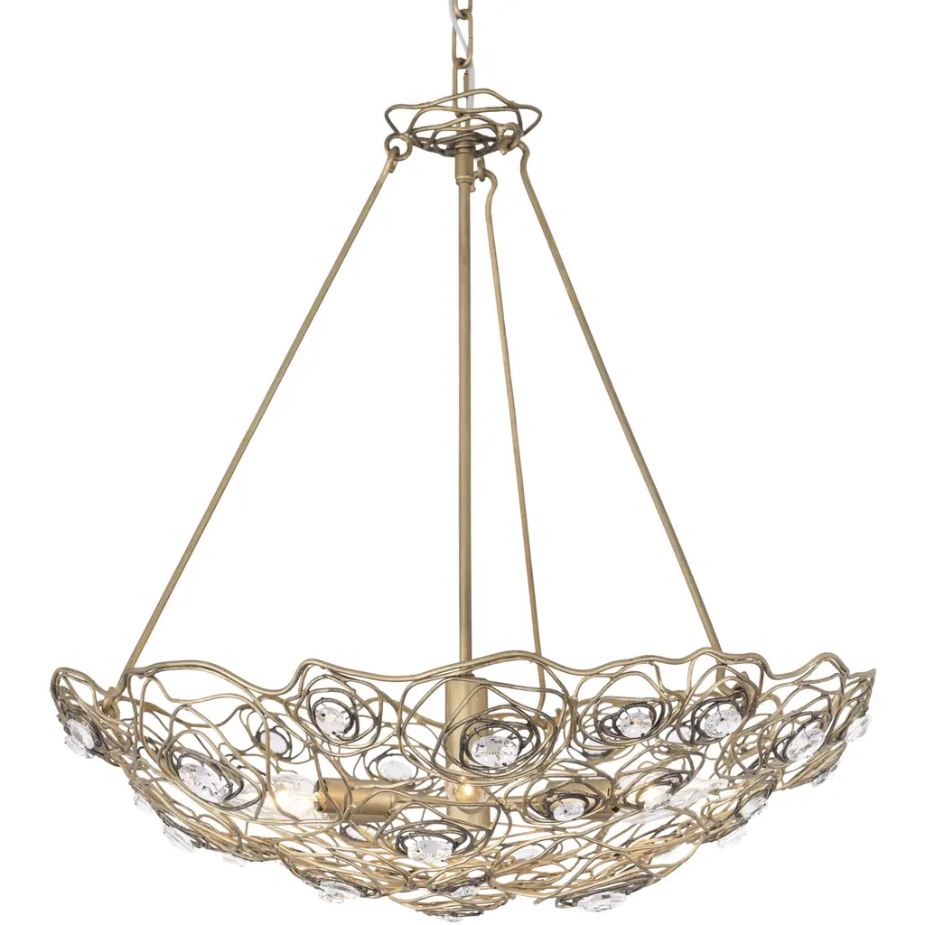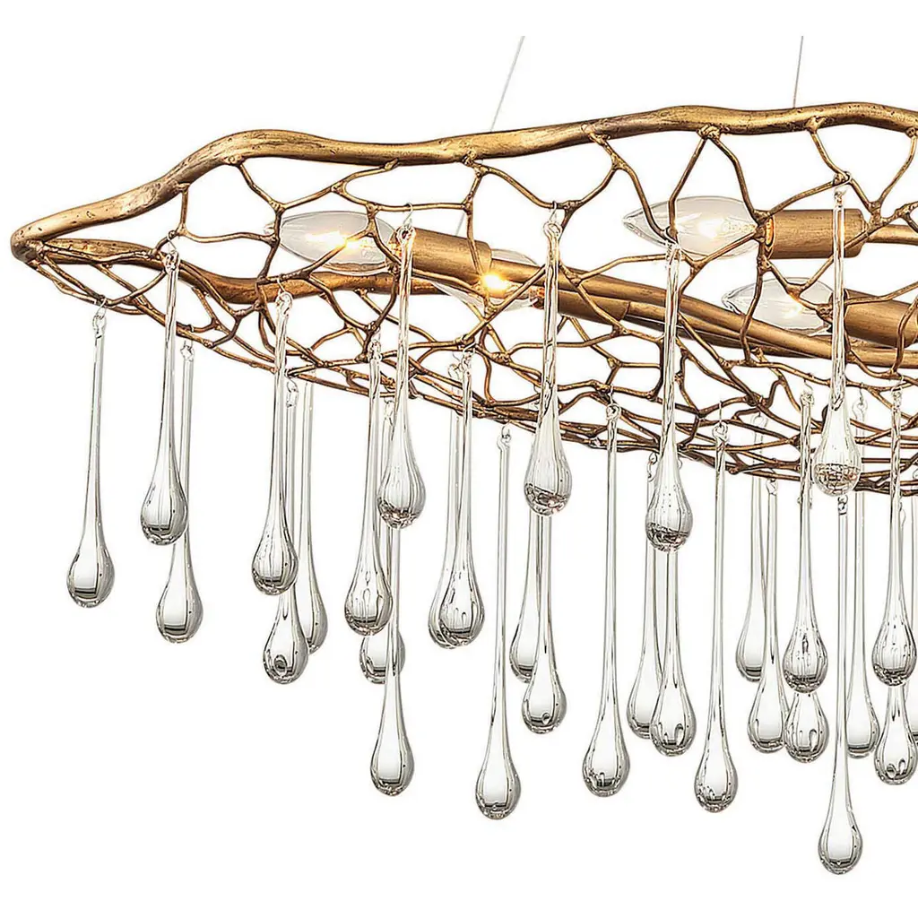 The Lisa McDennon Collection offers a striking mix of edgy, sculptural silhouettes that incorporate modern, organic elements and luxe materials, brought to life by her innovative and original point of view. Imagine a net gently breaking the surface, then slowly emerging with a cascade of water droplets trickling through and shimmering with light. Laguna uses a hand-made open framework design in Brushed Gold as the foundation in this artistic interpretation. Clear glass droplets fall at varying lengths, casting the light. Minimal hanging wires ensure the net itself appears to float, as a candle cluster emits light from within. Laguna is part of the Lisa McDennon Collection.