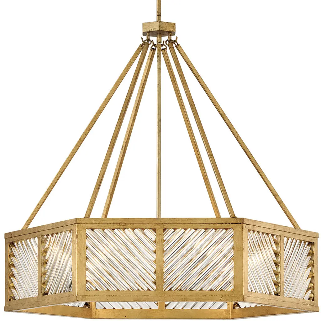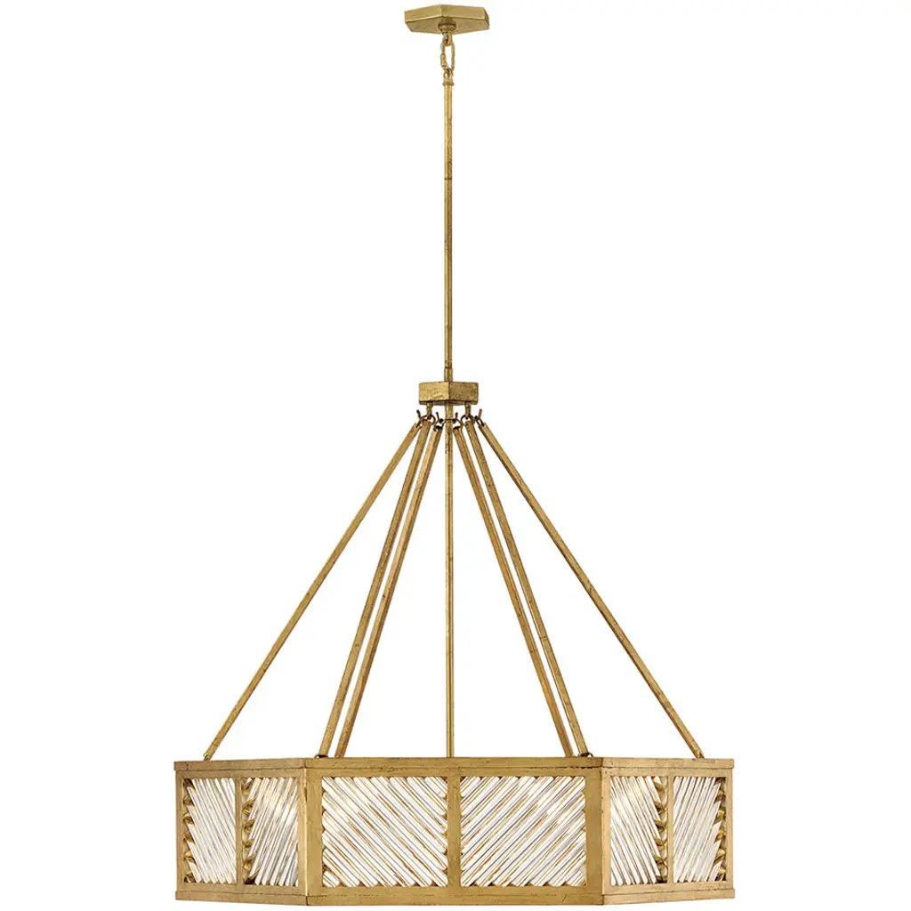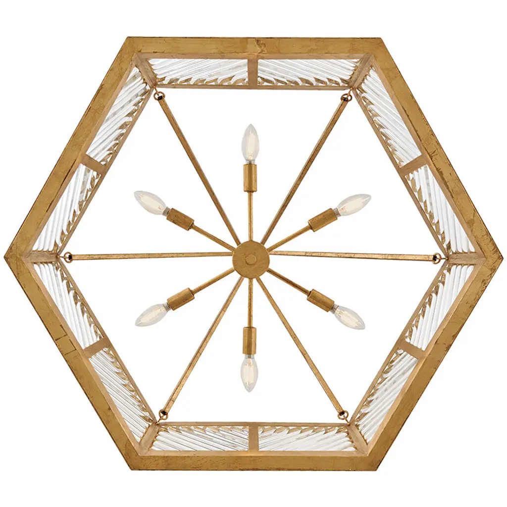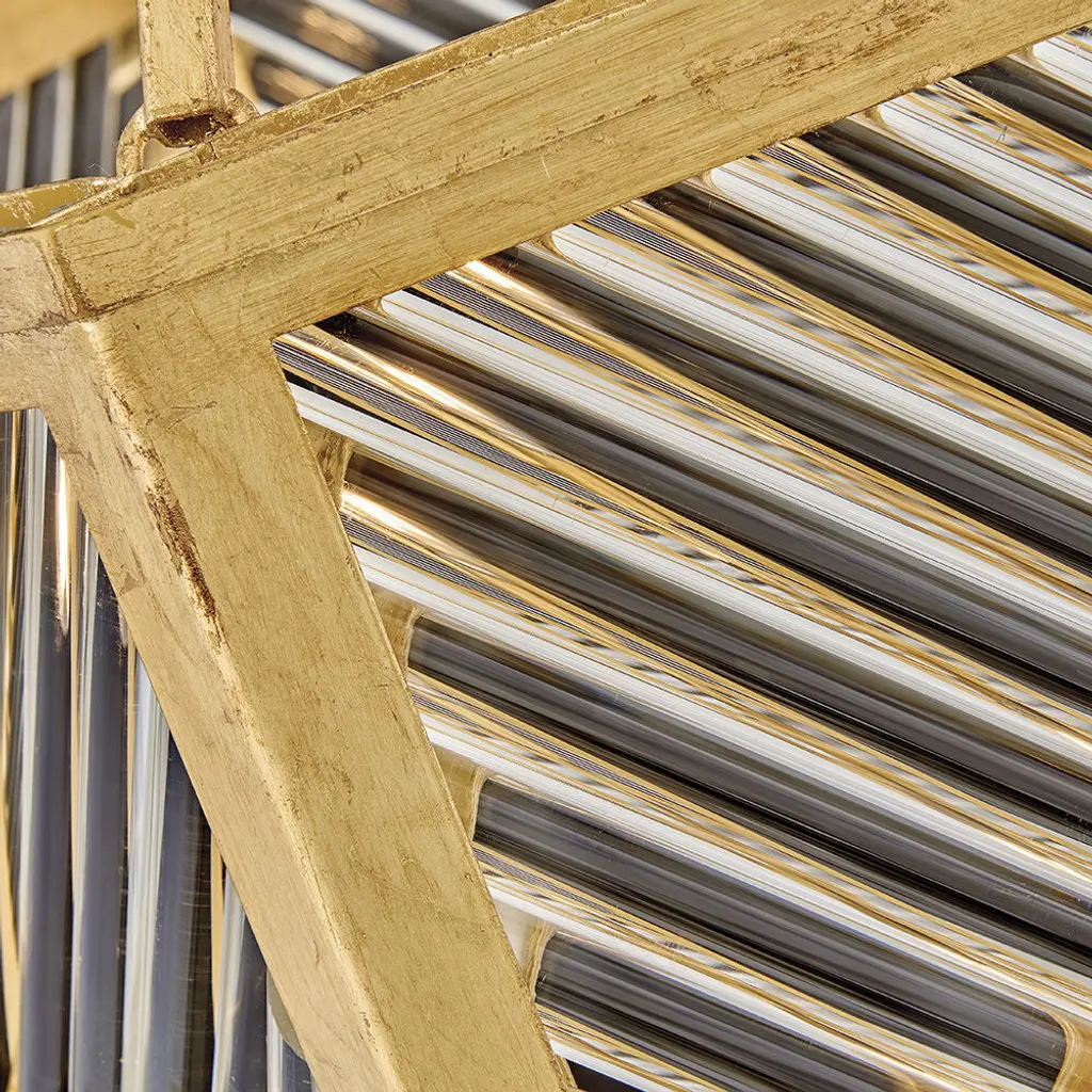 The Lisa McDennon Collection offers a striking mix of edgy, sculptural silhouettes that incorporate modern, organic elements and luxe materials, brought to life by her innovative and original point of view. A reimagining of vintage designs from the 40s and 50s, Suras transitional, hexagonal Distressed Brass frame creates a glamorous yet understated and tailored appeal. Cylindrical glass rods set at alternating angles echo a soft herringbone pattern, juxtaposing geometry within geometry. Layered details create a reeded effect that is reflective and alluring.