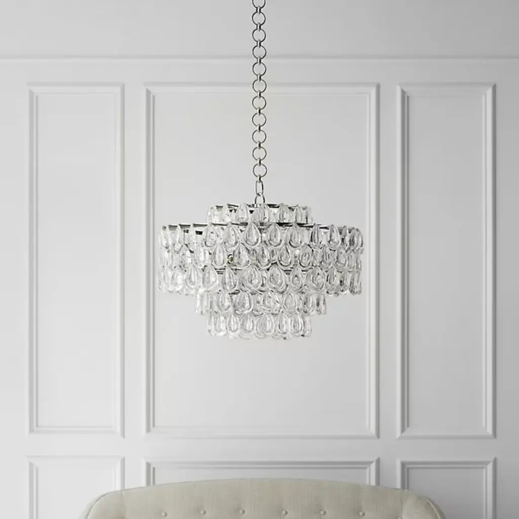 The Liscia Chandelier by Visual Comfort Signature, formerly known as Visual Comfort, is practically dripping with luxury, featuring a layered body comprised primarily of teardrop crystals. A low-profile metal frame gives the fixture its shape, supporting the crystals at varying distances from a single internal light source. Once lit, the crystals glisten and gleam in a dazzling refractive display, bringing an unparalleled upscale look to your home décor.