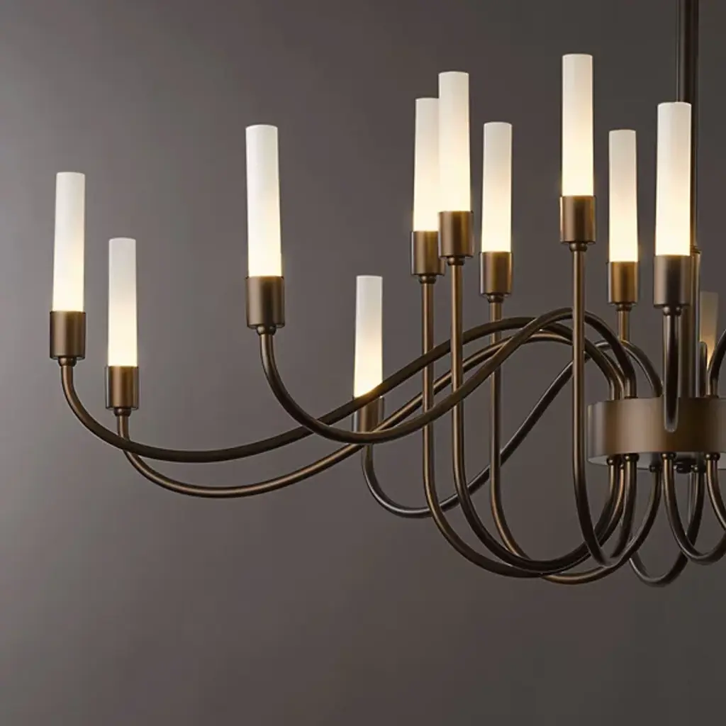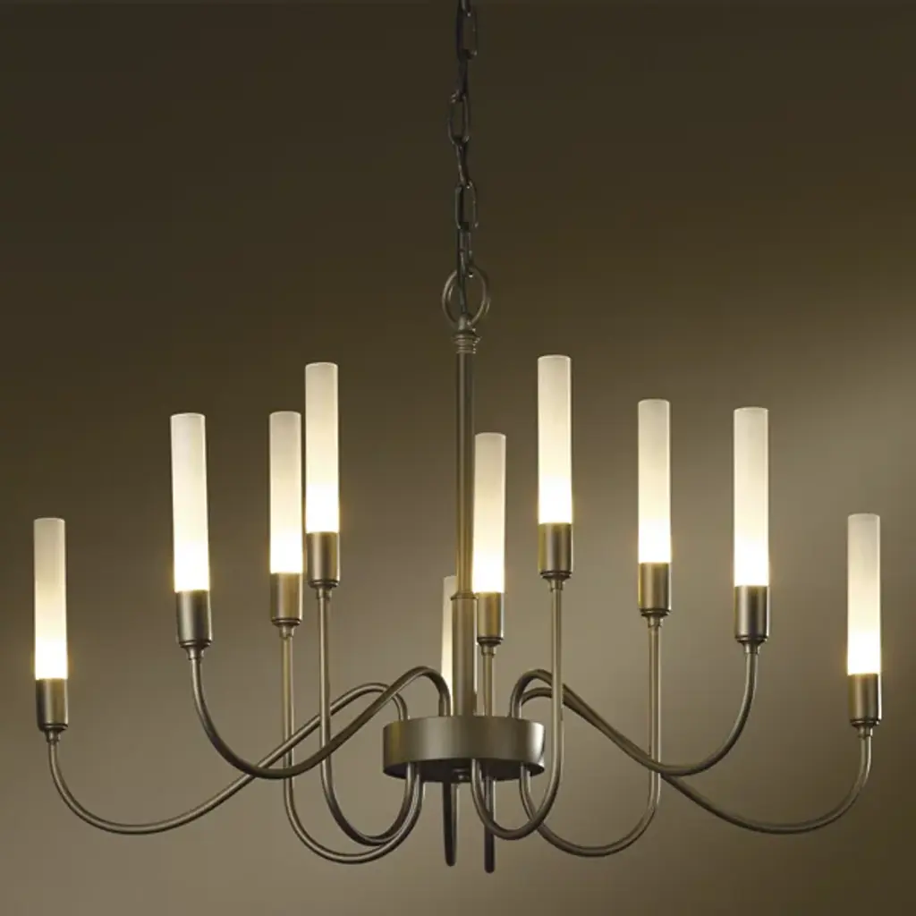 Minimalist grace. The Hubbardton Forge Lisse Chandelier offers an unfettered style with gentle curves and smooth lines. (Indeed, the word "lisse" is French for "smooth.") Ten arms support slim cylindrical Frosted glass shades, creating a silhouette that is at once linear and organic. A spare and stylish alternative to traditional chandeliers.