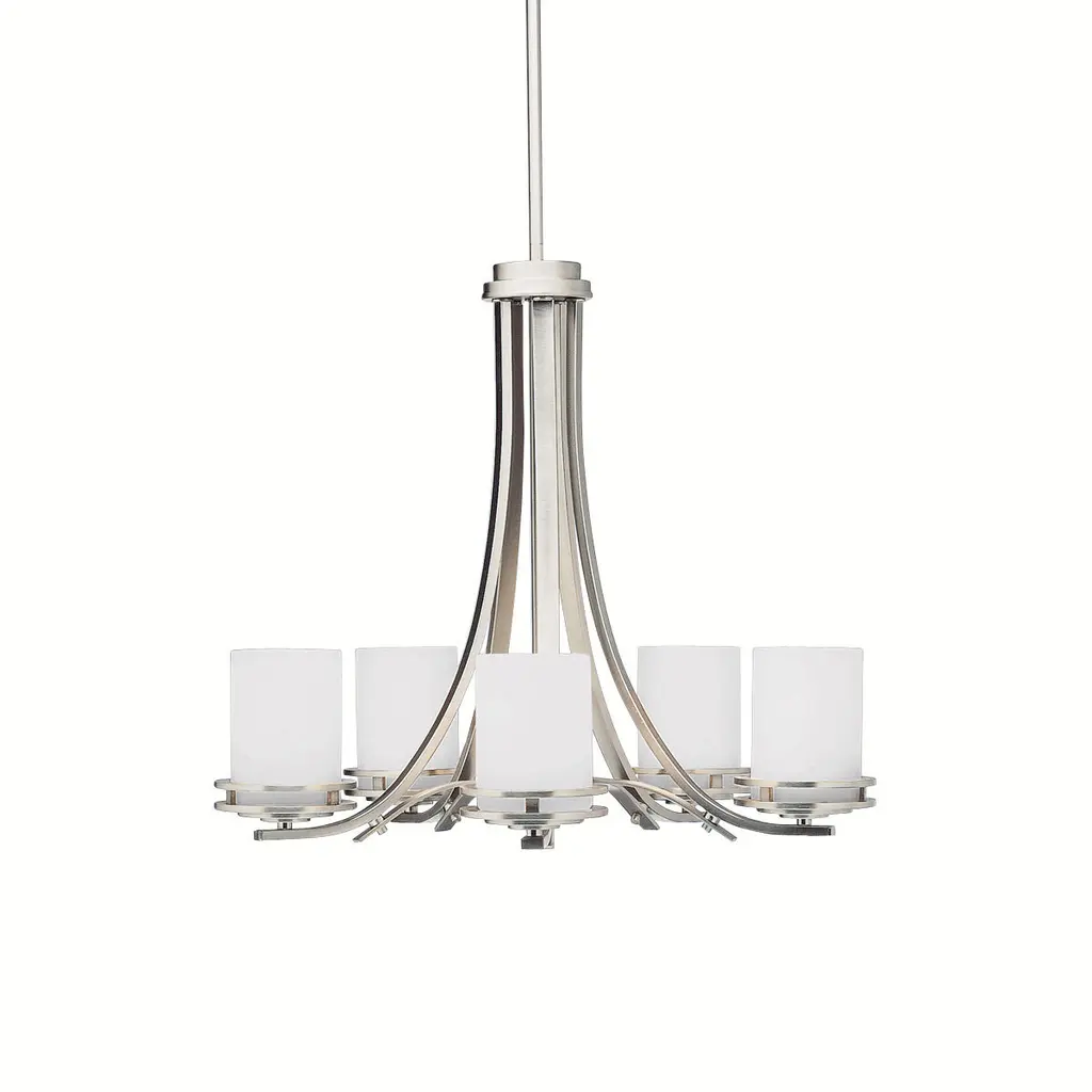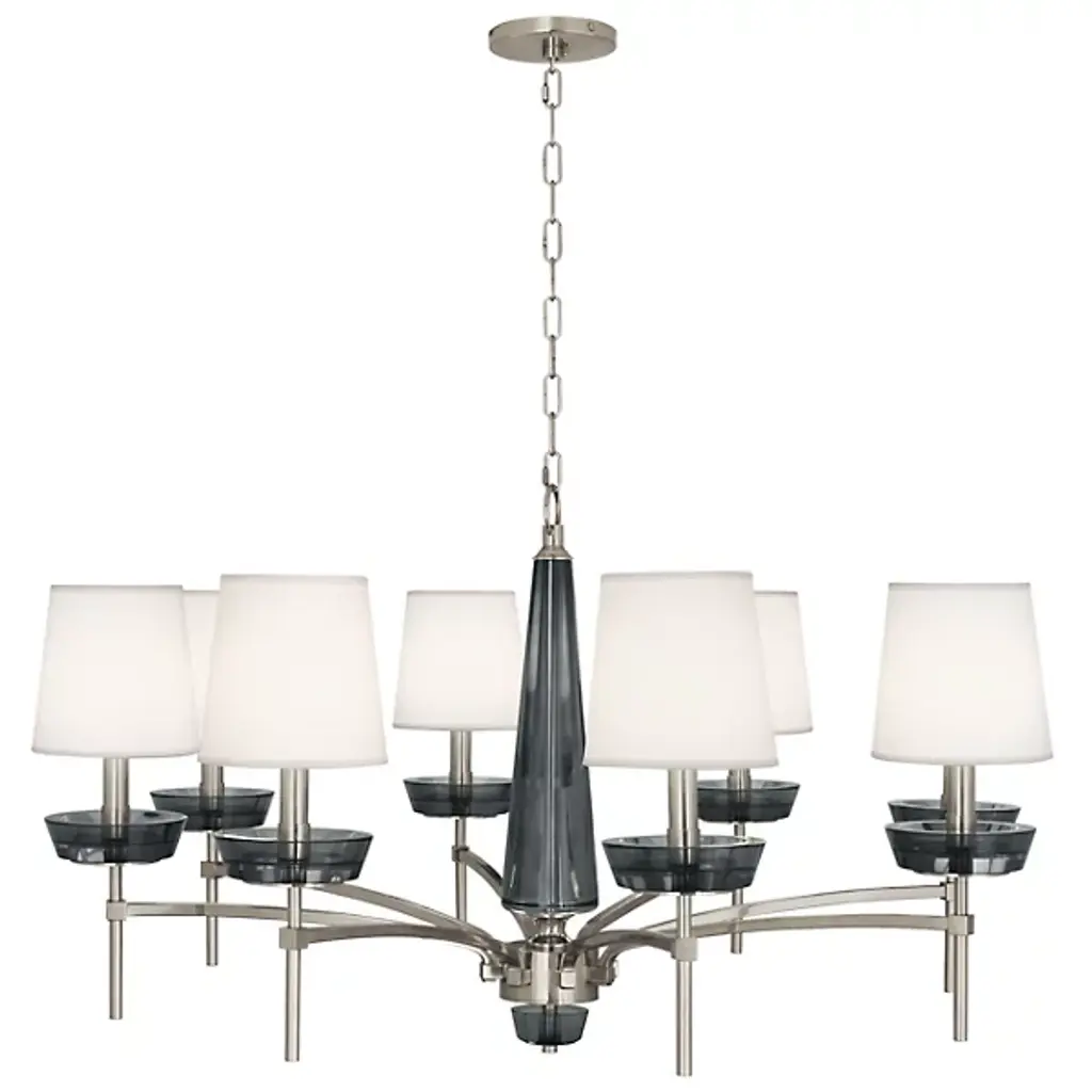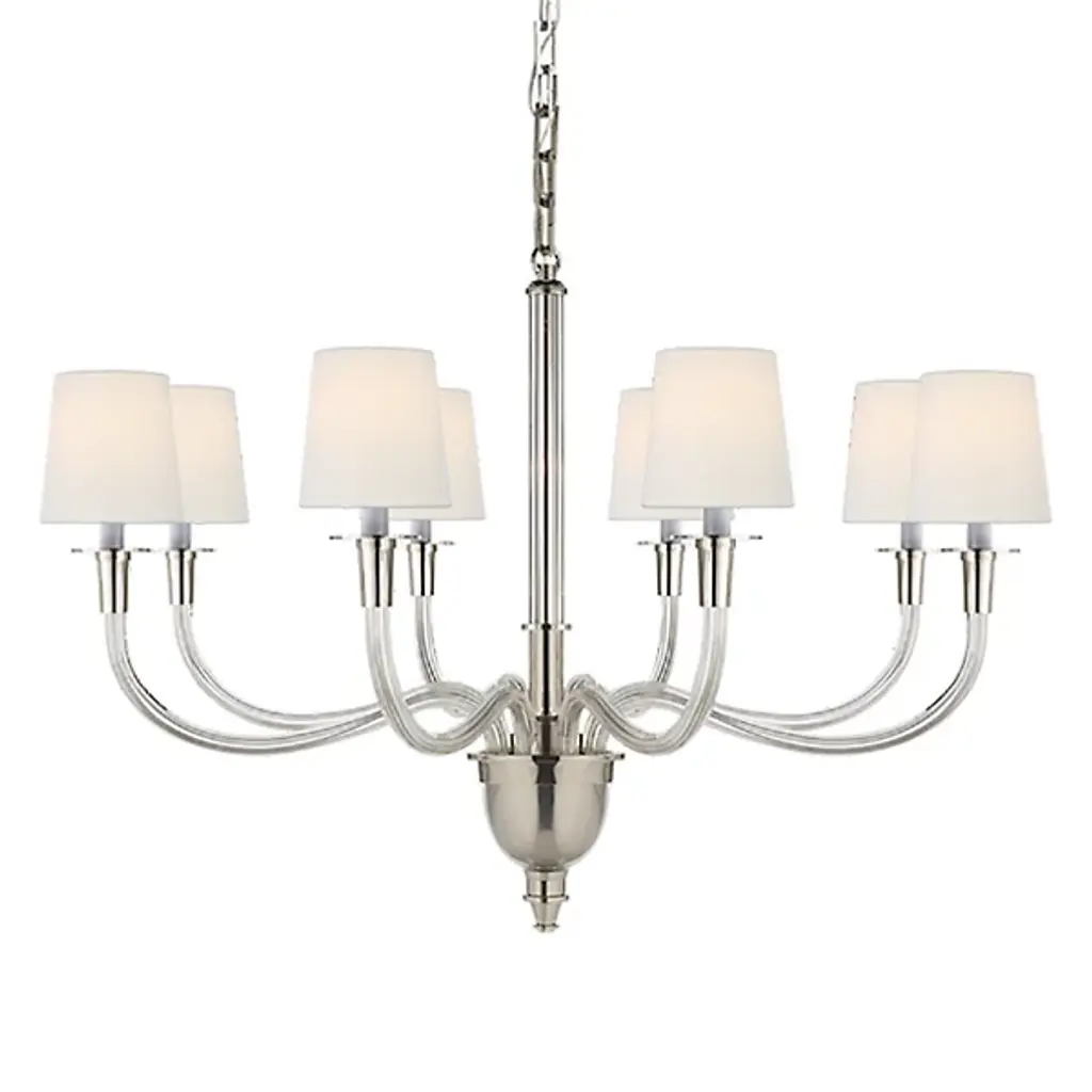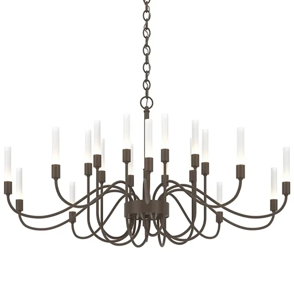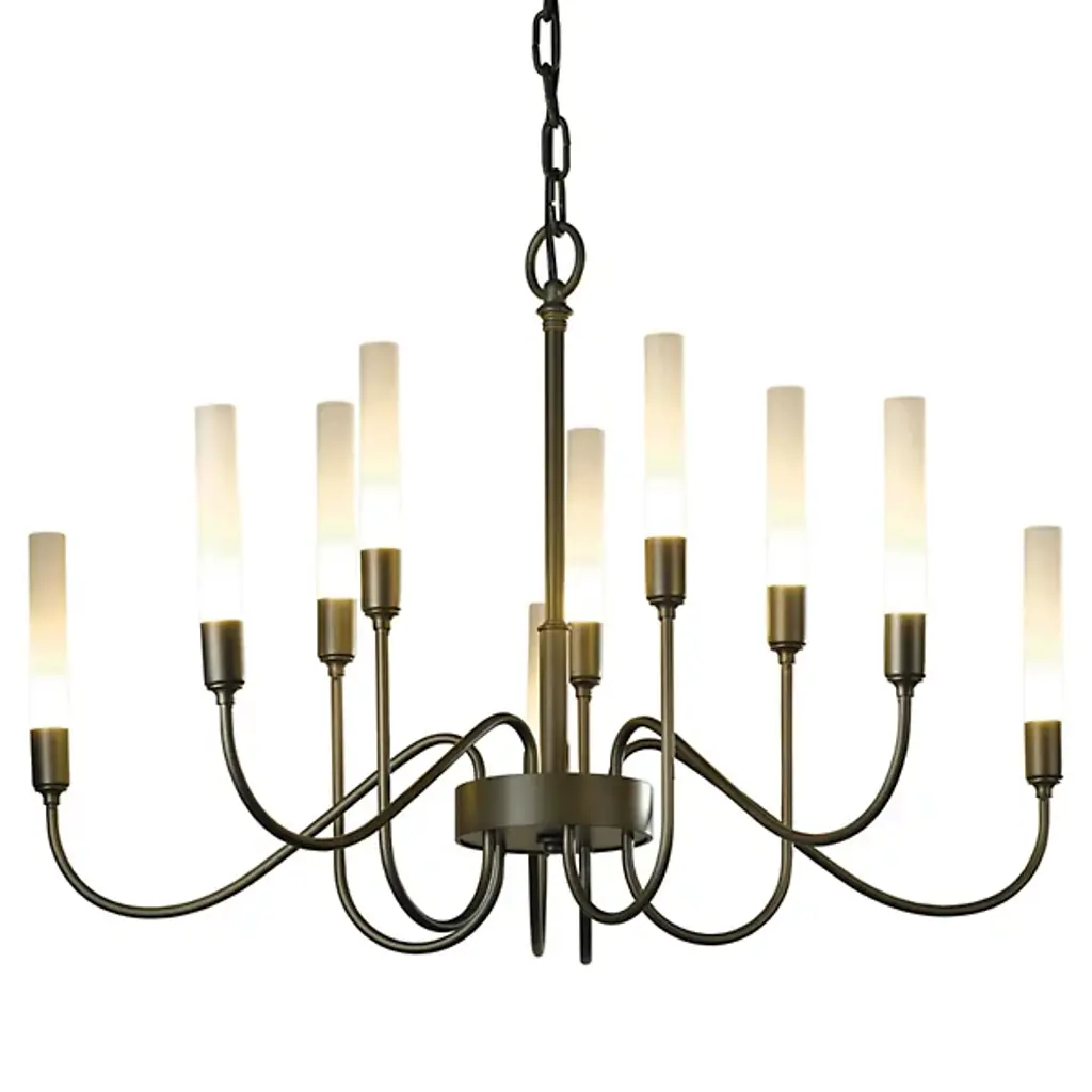 Minimalist grace. The Hubbardton Forge Lisse Chandelier offers an unfettered style with gentle curves and smooth lines. (Indeed, the word "lisse" is French for "smooth.") Ten arms support slim cylindrical Frosted glass shades, creating a silhouette that is at once linear and organic. A spare and stylish alternative to traditional chandeliers.